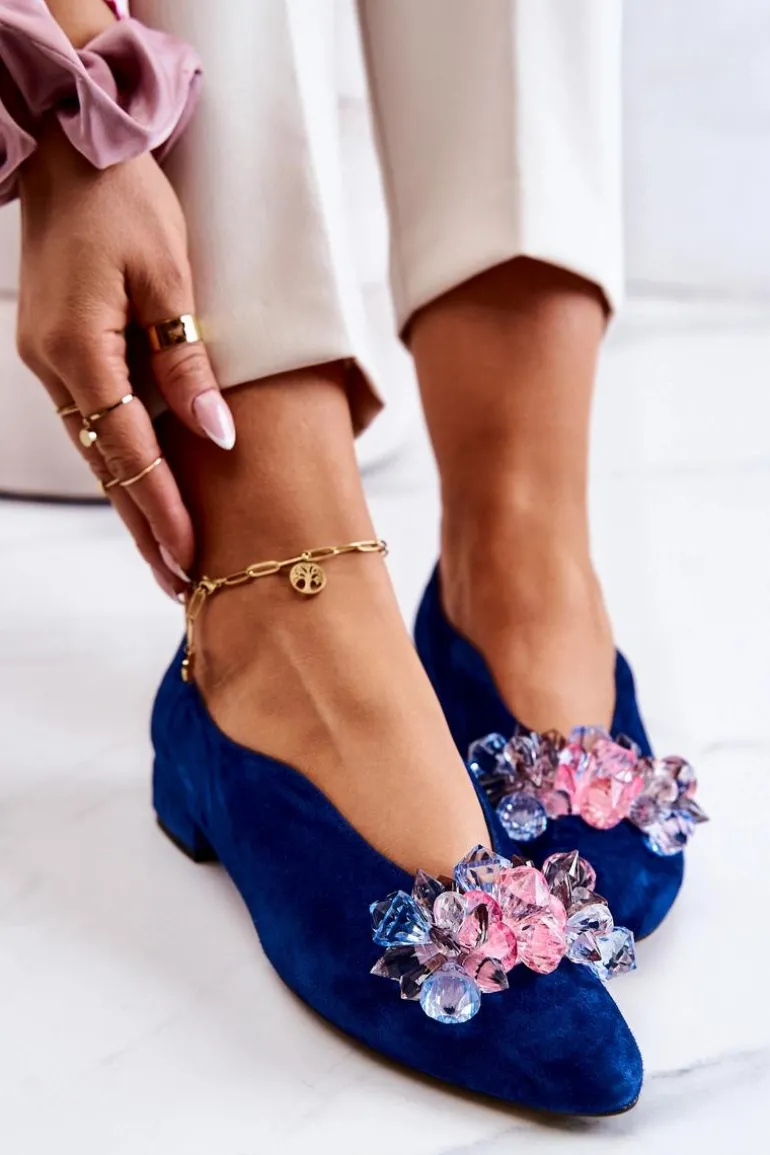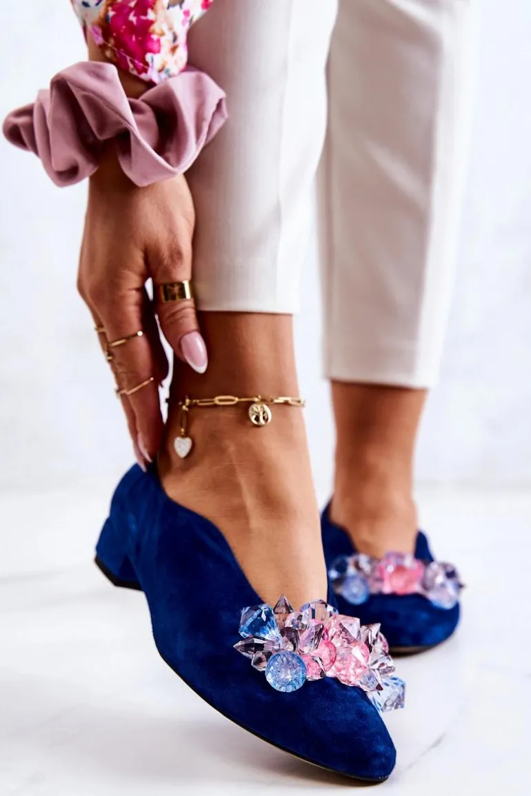 Eleganckie półbuty wykonane zostały z naturalnej zamszowej skóry. Nosek w szpic. Z przodu posiadają ozdobę w postaci kryształków. Wkładka jest wykonana ze skóry naturalnej, aby zapewnić jak największy komfort podczas użytkowania. Płaski obcas zapewni stabilizację. Buty są eleganckie i modne. Model ten świetnie sprawdzi się do eleganckich stylizacji np.: na uroczystości rodzinne czy spotkania biznesowe. Ten fason skradnie serce niejednej wielbicielki modowych nowości! Przy wyborze rozmiaru prosimy sugerować się tabelą rozmiarów.