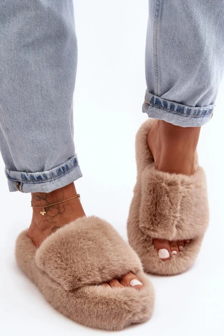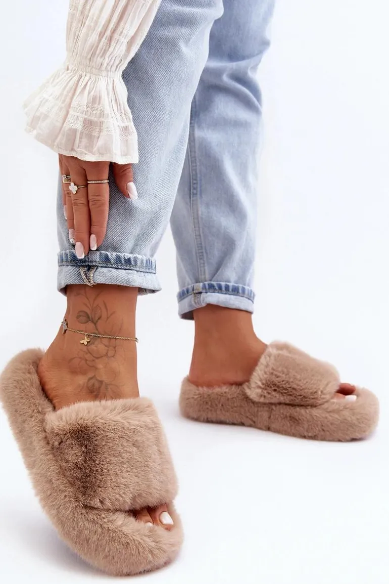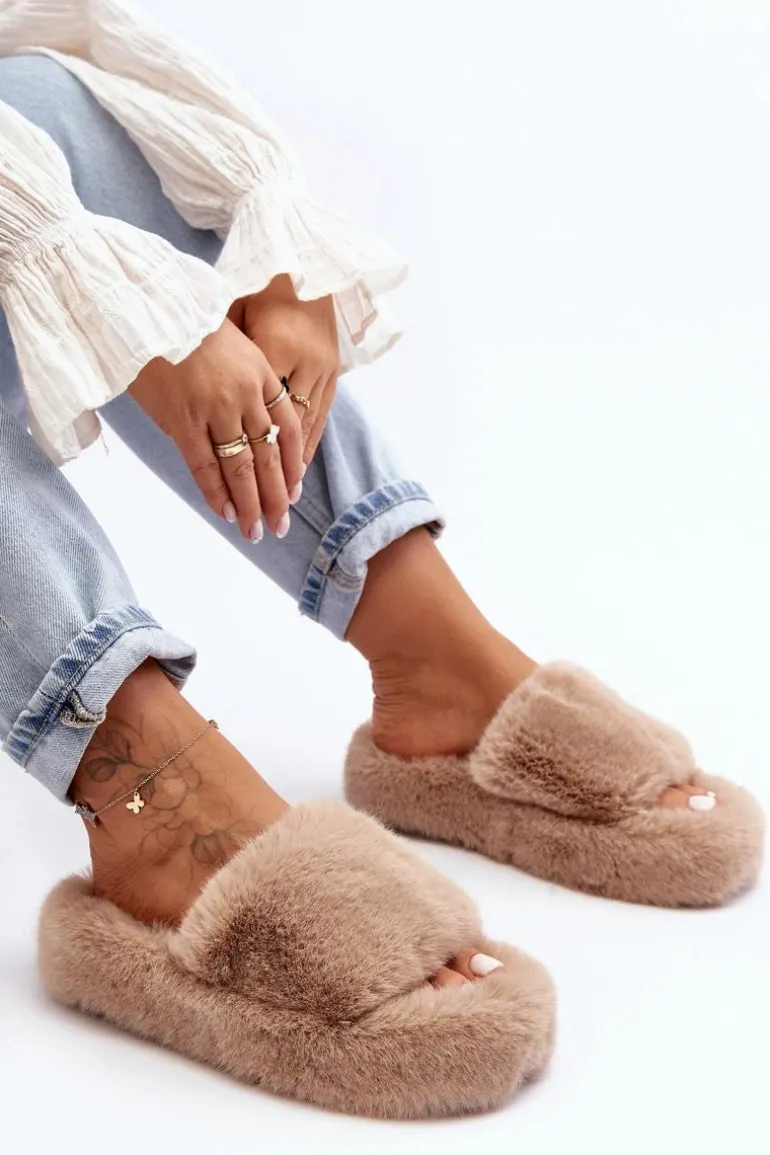 Kapcie damskie zostały wykonane z ekologicznego futerka. Model wsuwany z odkrytym noskiem i szerokim paskiem. Podeszwa wykonana z gumowego tworzywa ochroni przed zimnym podłożem. Przy wyborze rozmiaru prosimy kierować tabelą rozmiarów.