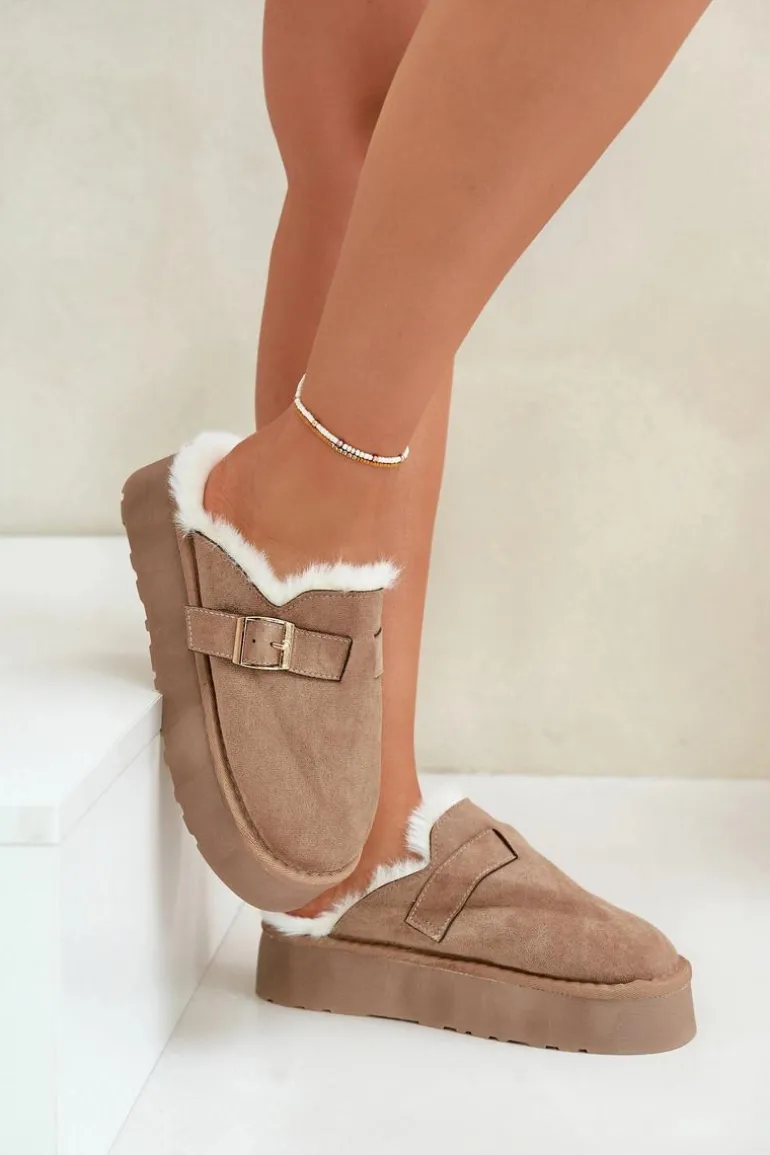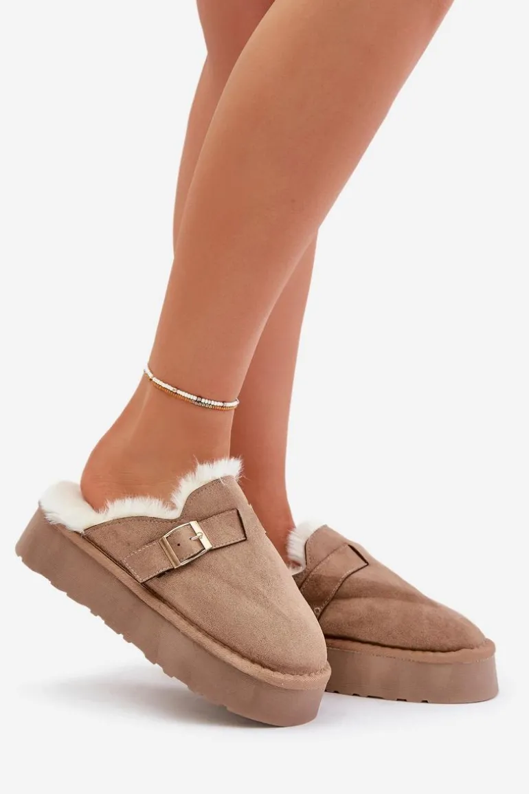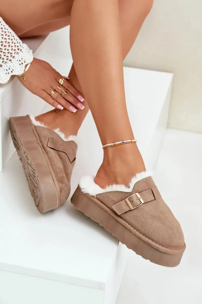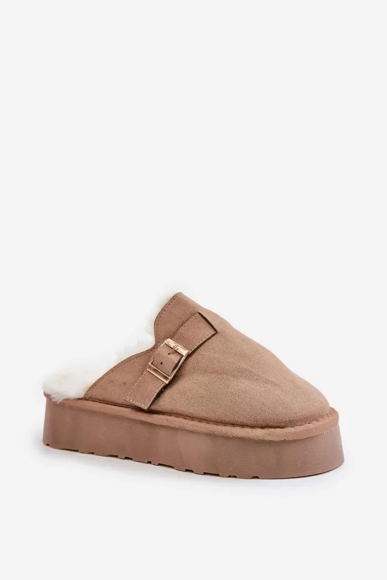 Stylowe damskie kapcie na grubej podeszwie to idealny wybór na chłodniejsze dni. Ocieplane miękkim futerkiem, zapewniają wyjątkowy komfort i ciepło. Ozdobione paskiem ze złotą klamrą. Idealne do noszenia w domu i szybkie wyjścia na zewnątrz. Przy wyborze rozmiaru prosimy kierować tabelą rozmiarów.