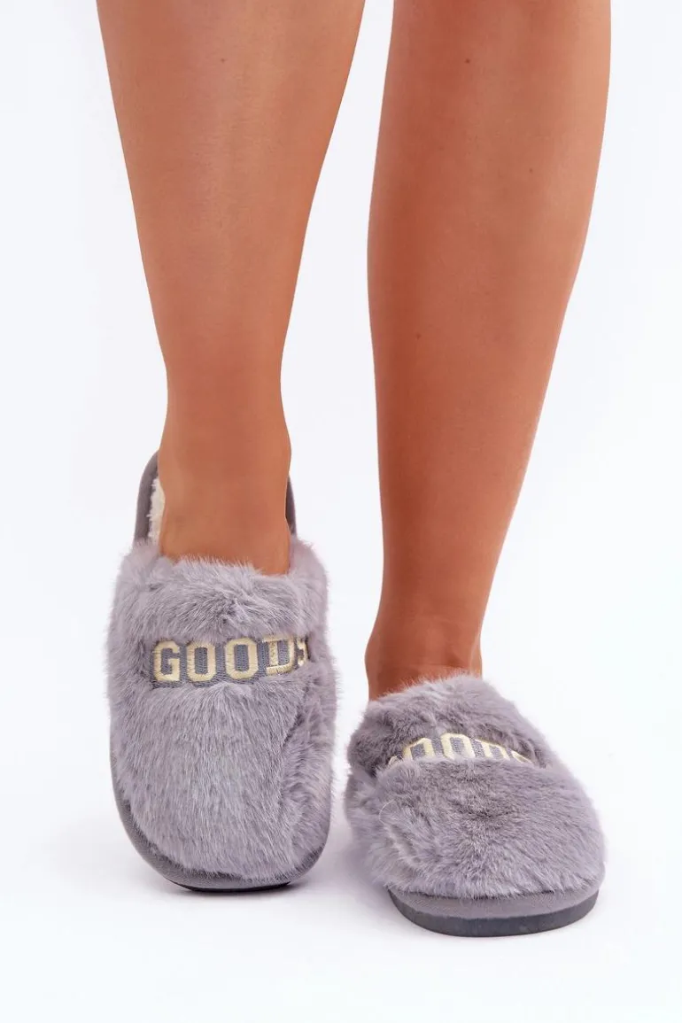Kapcie damskie wykonane z miękkiego futerka, które zapewnia wyjątkowy komfort i ciepło. Model ozdobiony stylowym napisem, który dodaje nowoczesnego charakteru. Idealne na chłodne dni, doskonale sprawdzą się jako wygodne obuwie domowe, łącząc funkcjonalność z modnym wyglądem. Przy wyborze rozmiaru prosimy kierować tabelą rozmiarów.
