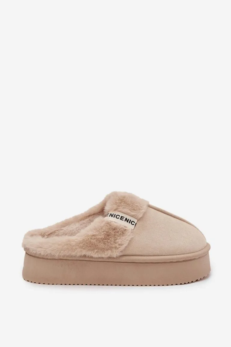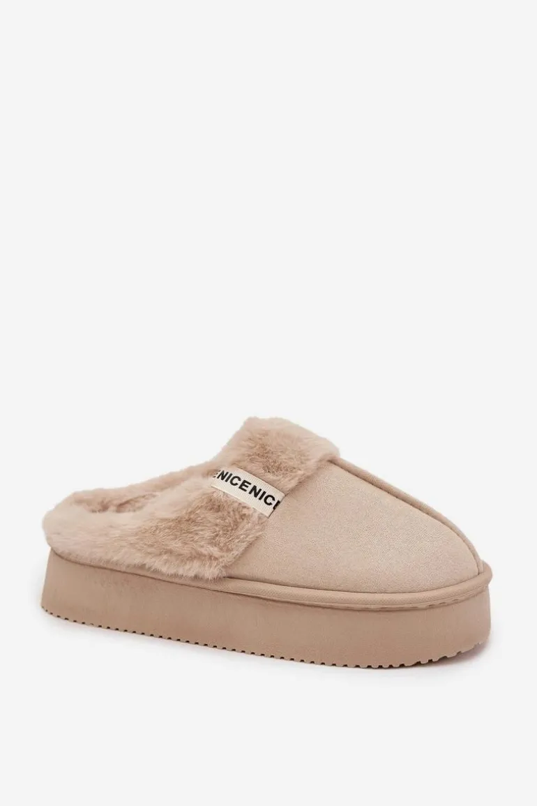 Kapcie damskie wykonane z miękkiej eko zamszowej tkaniny to idealna propozycja dla kobiet ceniących ciepło i wygodę. Model osadzony został na grubej podeszwie, która zapewnia stabilność oraz komfort podczas chodzenia po domu. Górną część ozdobiono przyjemnym w dotyku futerkiem i stylowym paseczkiem z napisem, co nadaje całości modnego i przytulnego charakteru. Wnętrze kapci zostało ocieplone, dzięki czemu doskonale chronią stopy przed chłodem. Przy wyborze rozmiaru prosimy sugerować się tabelą rozmiarów.