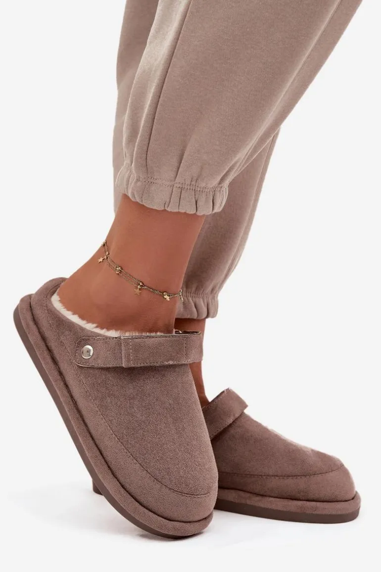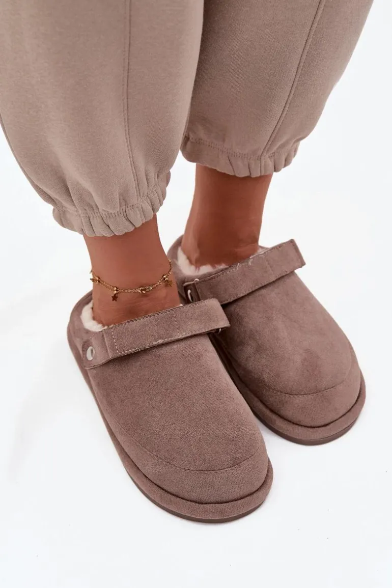 Damskie kapcie wykonane z miękkiej eko zamszowej tkaniny to wygodna i praktyczna propozycja na chłodniejsze dni. Posiadają podeszwę z gumowego tworzywa, która zapewnia stabilność i wygodę podczas chodzenia po domu. Zaokrąglone, zakryte noski podkreślają klasyczny wygląd obuwia, a ruchomy pasek zapinany na rzep ułatwia dopasowanie do stopy i dodaje funkcjonalności. Wnętrze ocieplone miękkim futerkiem gwarantuje ciepło i przyjemne otulenie, dzięki czemu kapcie idealnie sprawdzą się w domowym użytkowaniu.