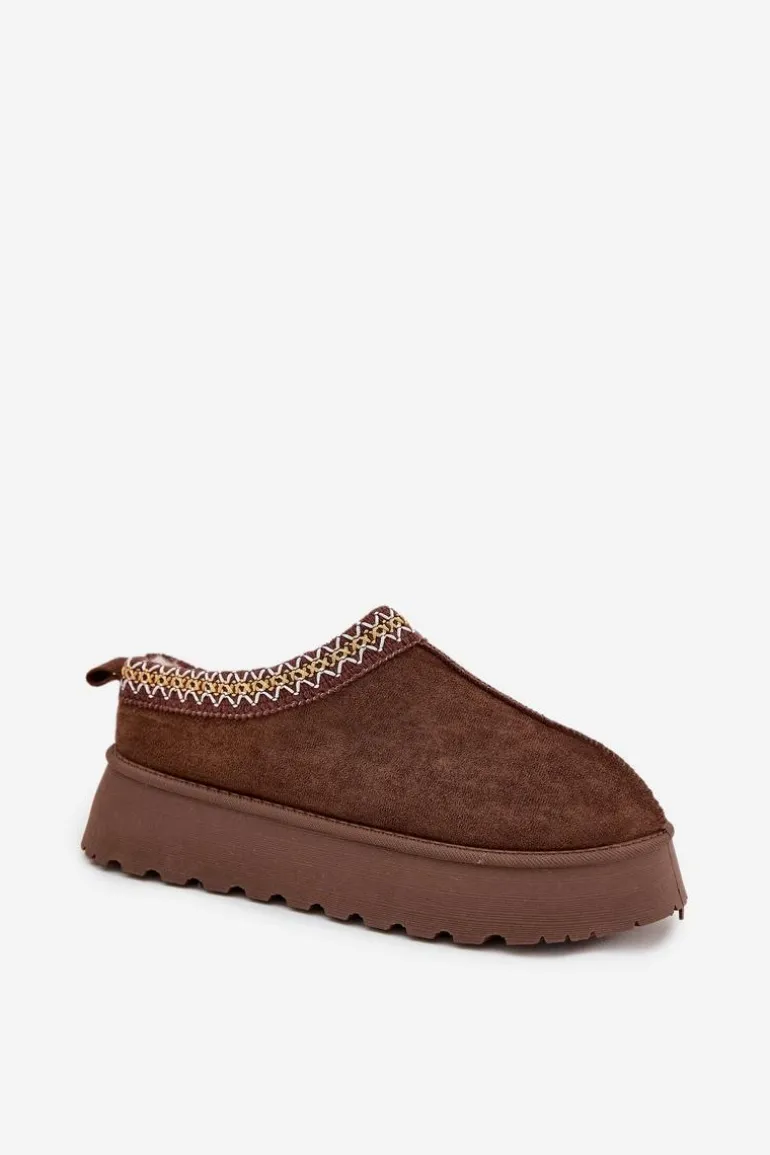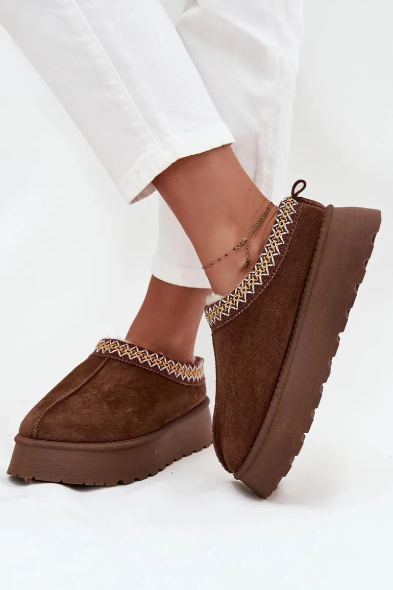 Stylowe kapcie wykonane z eko zamszu to doskonały wybór na chłodniejsze dni. Osadzone na platformie, z zakrytymi noskami i ocieplane miękkim futerkiem, zapewniają komfort i ciepło. Górę cholewki zdobi subtelny haft, który nadaje im eleganckiego charakteru. Idealne do codziennego użytku w domu oraz szybkie wyjścia na zewnątrz. Przy wyborze rozmiaru prosimy kierować tabelą rozmiarów.