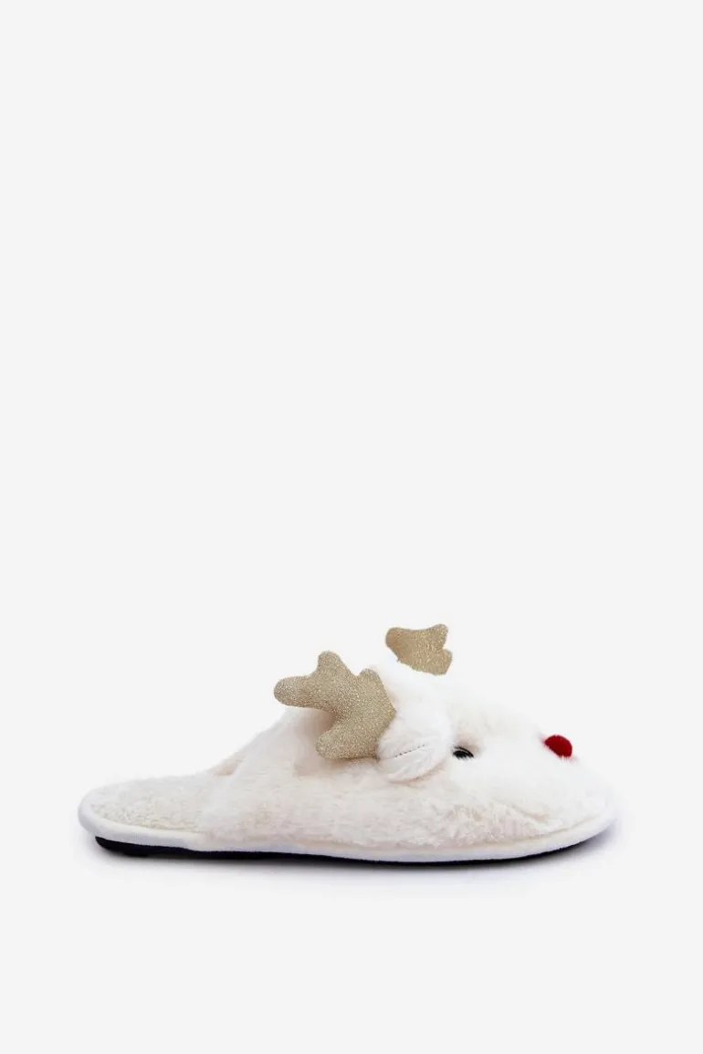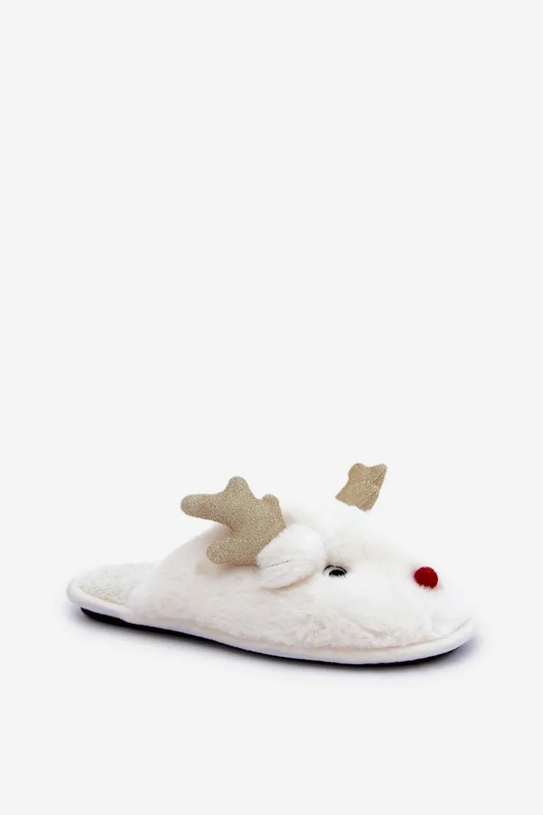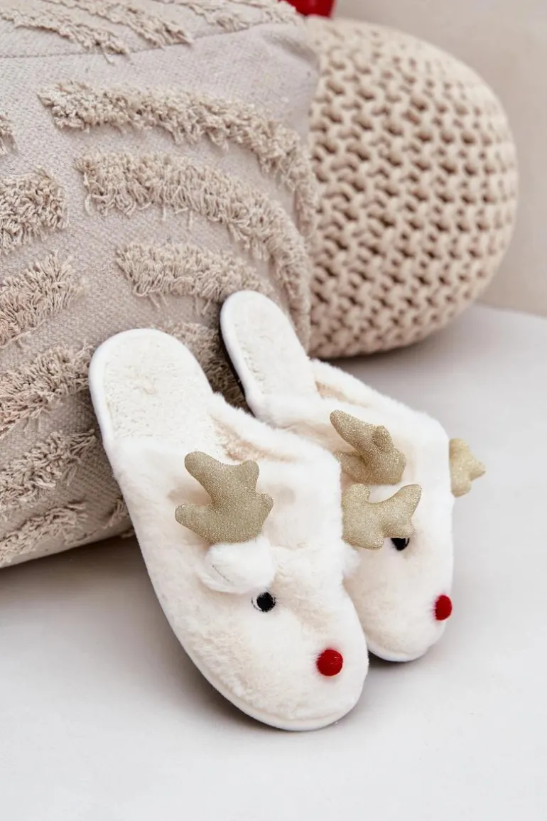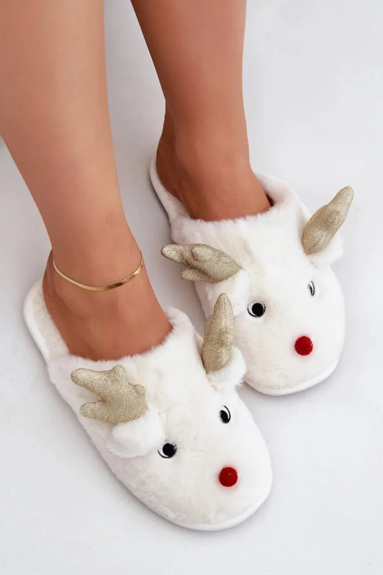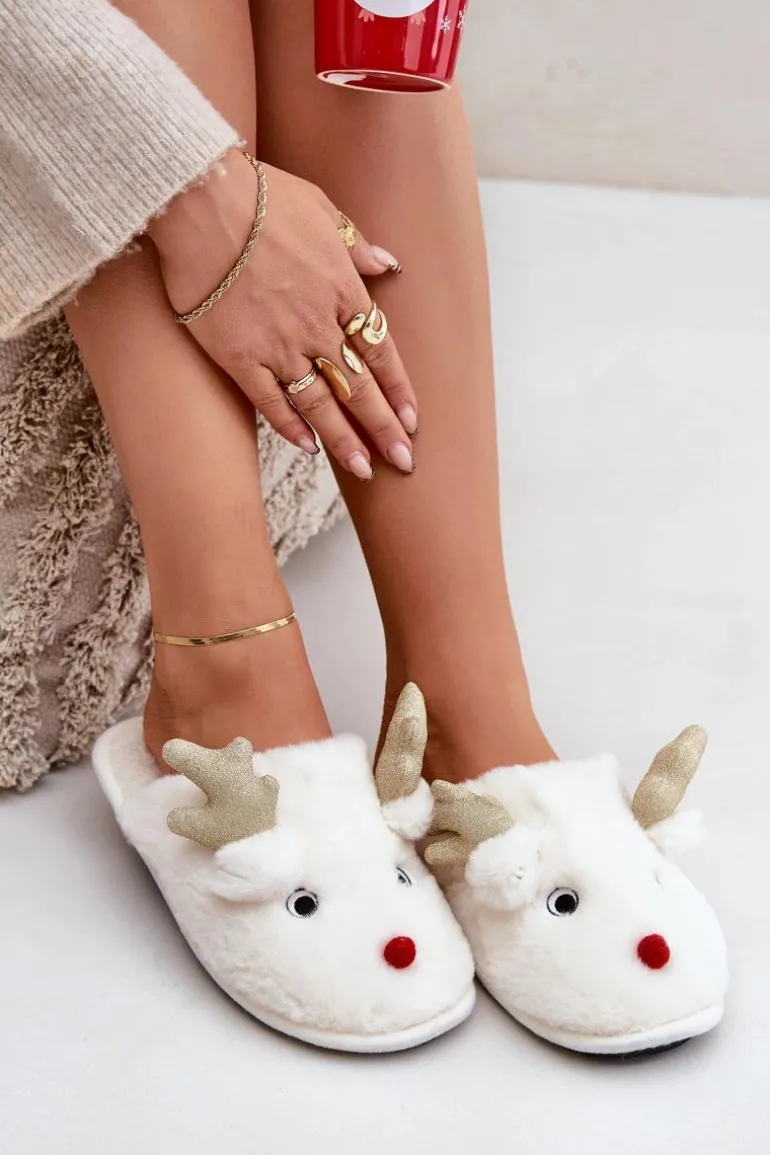 Kapcie Świąteczne Z Motywem Renifera Futrzane Białe Asielle