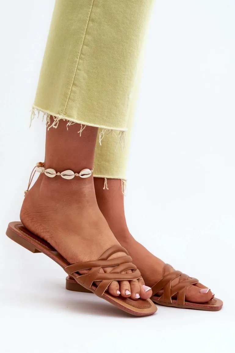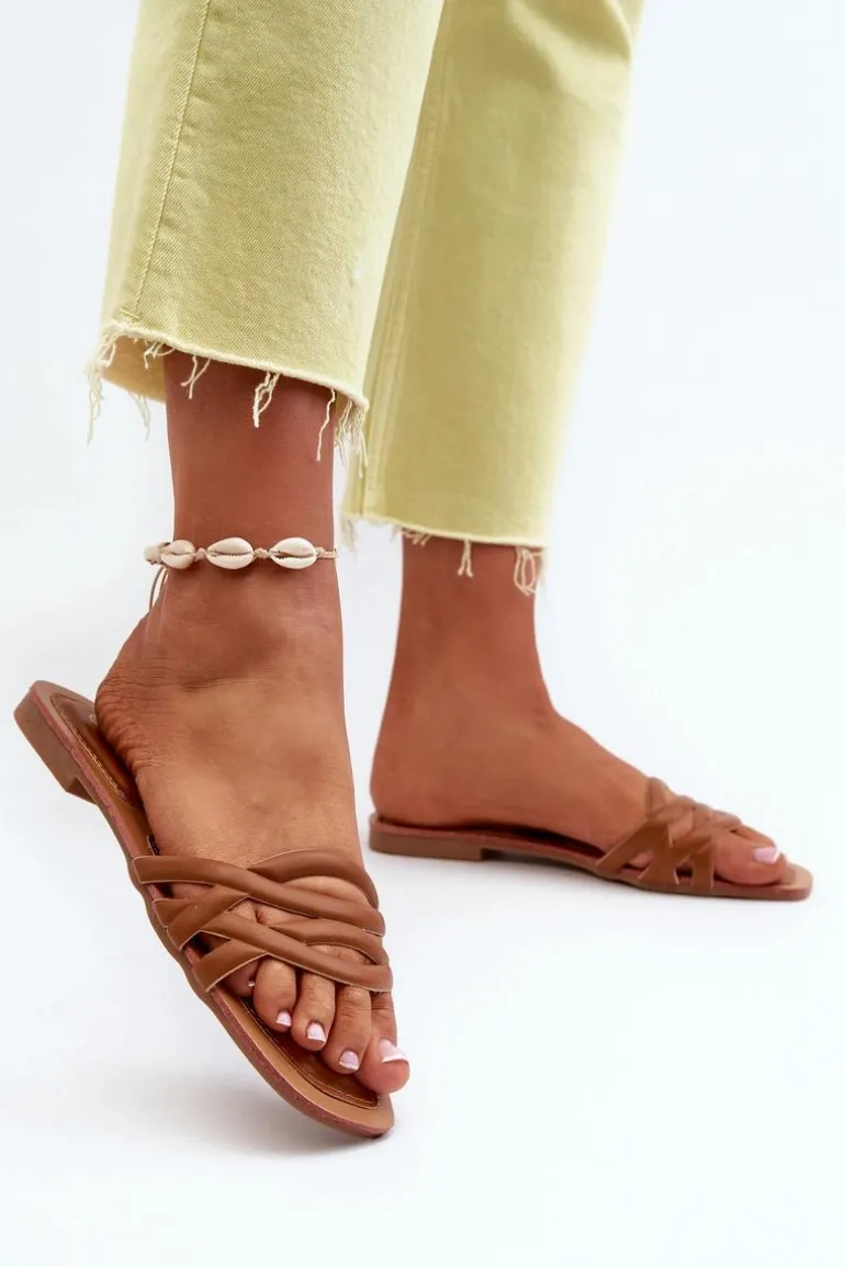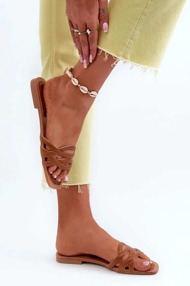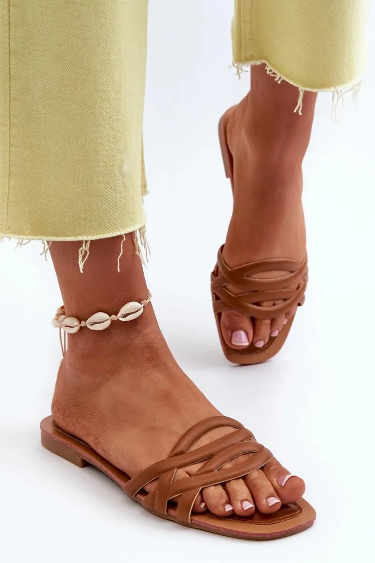 Klapki Damskie Eko Skórzane Na Płaskim Obcasie Brązowe Moldela