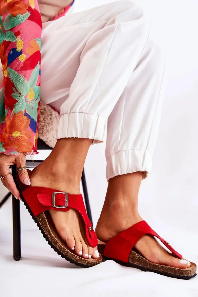 Klapki damskie typu japonki z eko zamszu. Buty posiadają sprzączkę, która umożliwia regulację. Otwarty, okrągły nosek. Osadzone na platformie. Miękka i profilowana wkładka wykonana jest z eko zamszu. Podeszwa jest gumowa i antypoślizgowa. Idealne na upalne lato! Musisz je mieć! Przy wyborze rozmiaru prosimy sugerować się tabelą rozmiarów.
