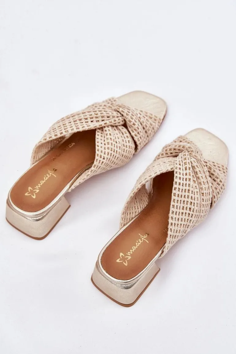 Klapki damskie od marki Maciejka, wykonane z materiału tekstylnego, to elegancka propozycja na ciepłe dni. Osadzone na obcasie w formie klocka, zapewniają stabilność i komfort przez cały dzień. Ich stylowy design doskonale łączy elegancję z wygodą, sprawiając, że idealnie pasują do zarówno casualowych, jak i bardziej formalnych stylizacji. Przy wyborze rozmiaru prosimy sugerować się tabelą rozmiarów.