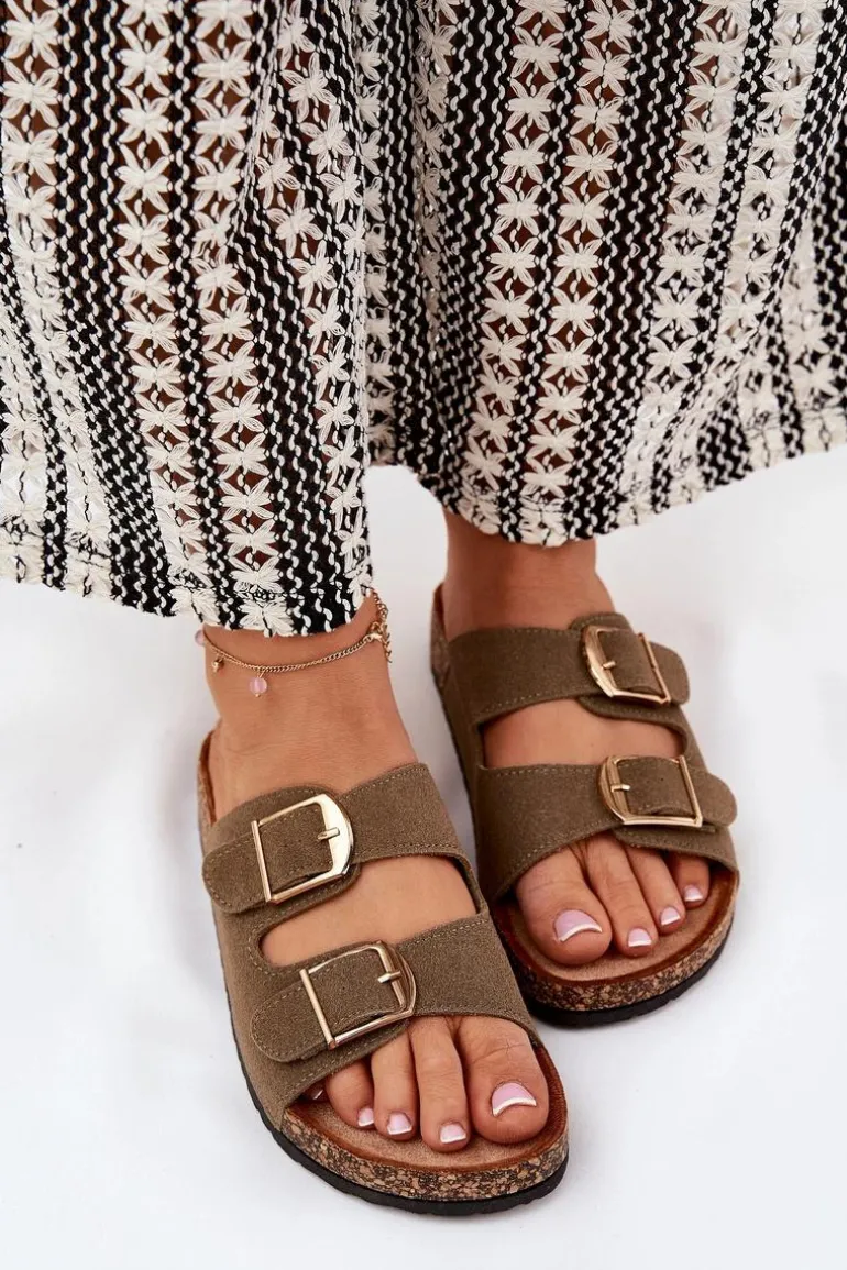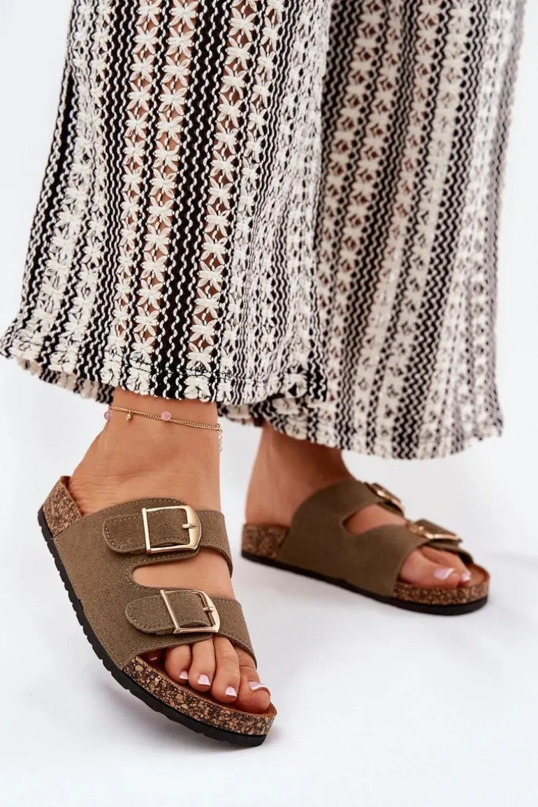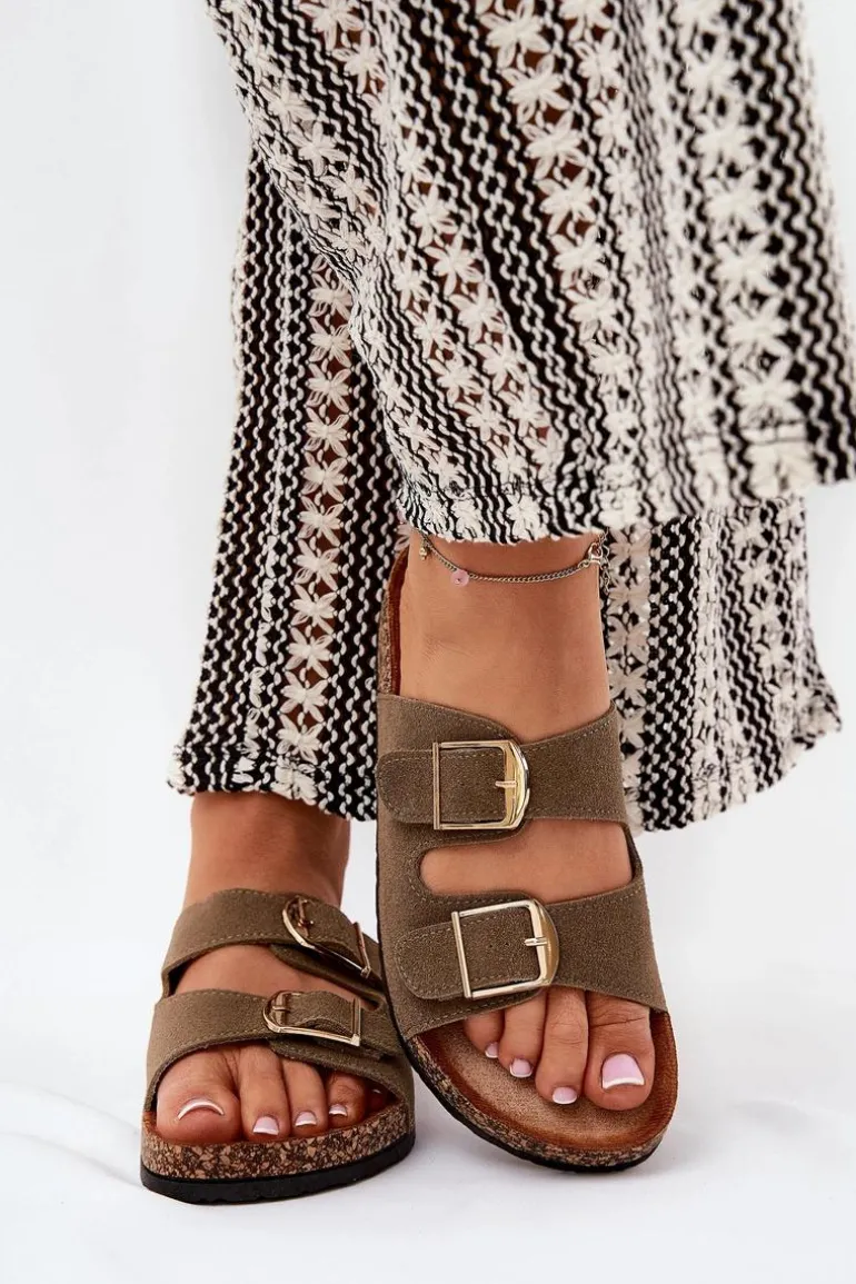 Klapki Damskie Na Korkowej Platformie Ze Złotymi Klamrami Zielone Lisavionea