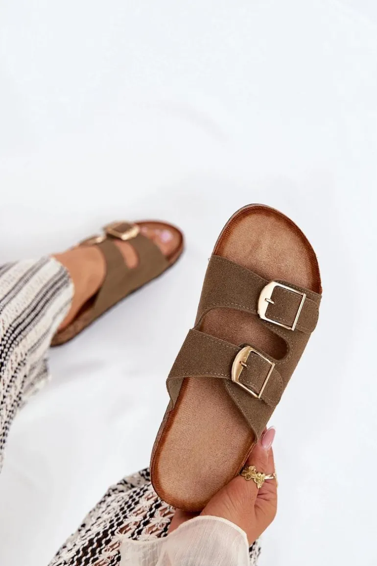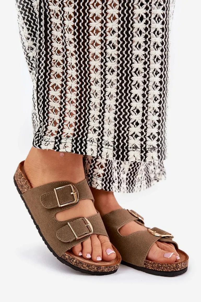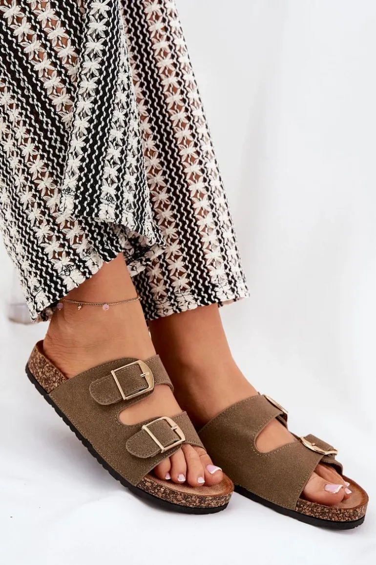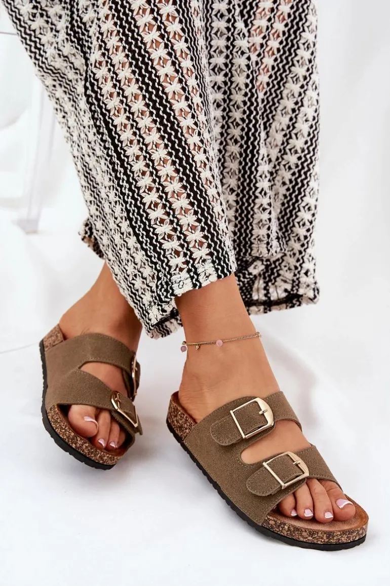 Klapki Damskie Na Korkowej Platformie Ze Złotymi Klamrami Zielone Lisavionea