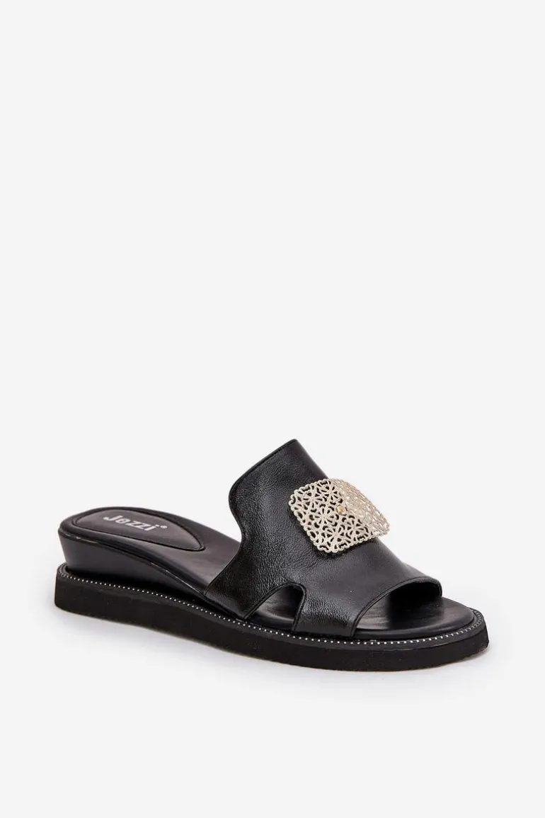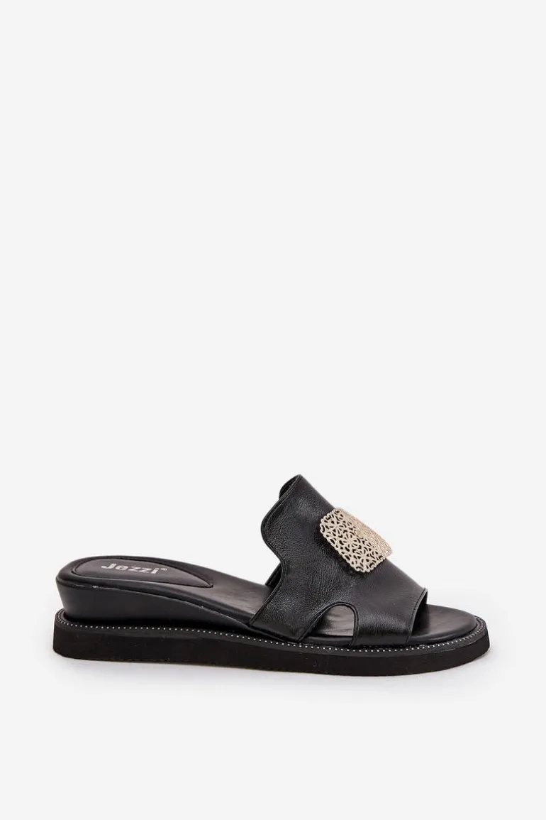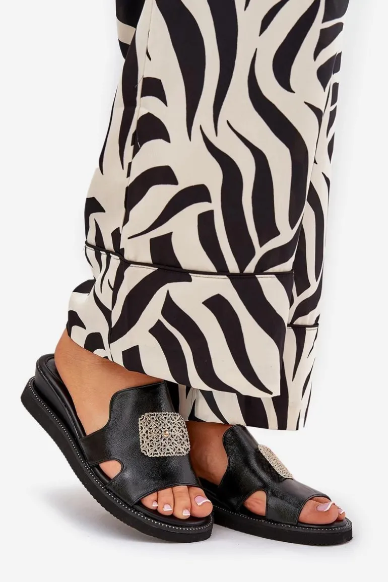 Klapki Damskie Na Koturnie Eko Skórzane Z Ozdobą Czarne Sarela