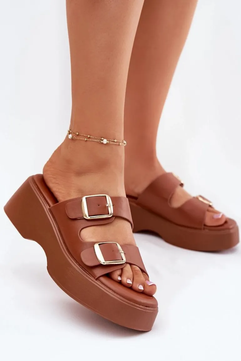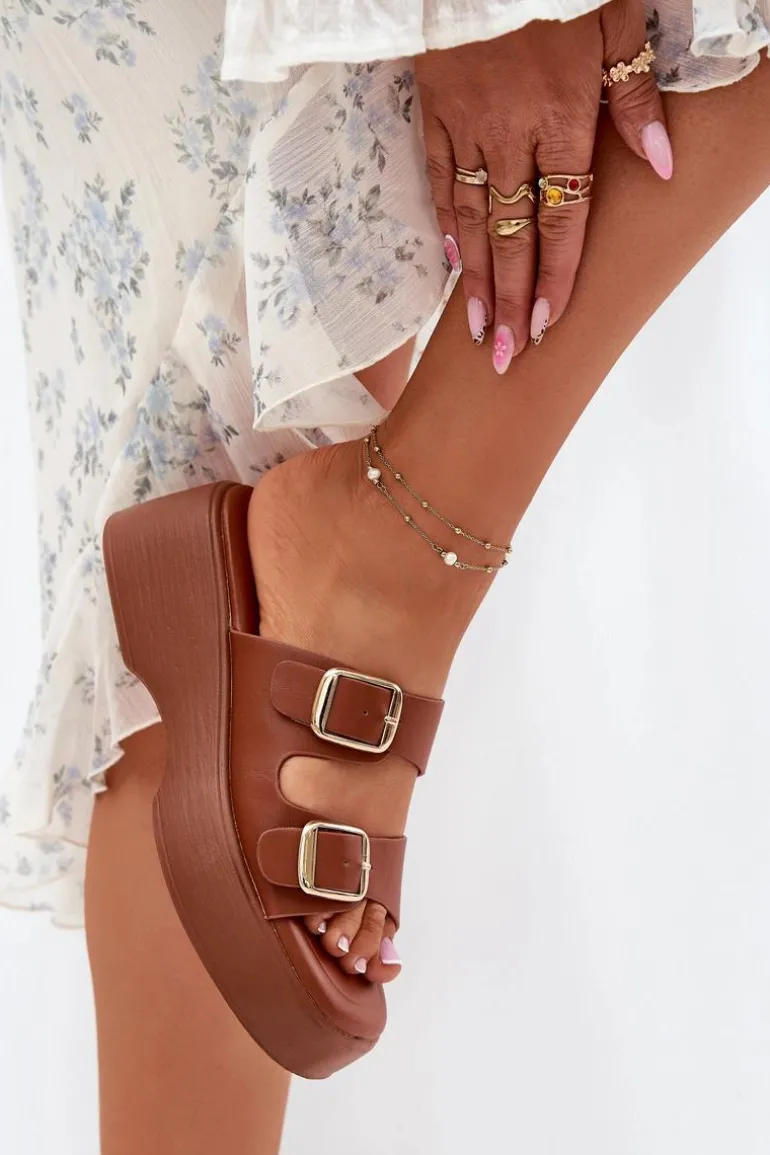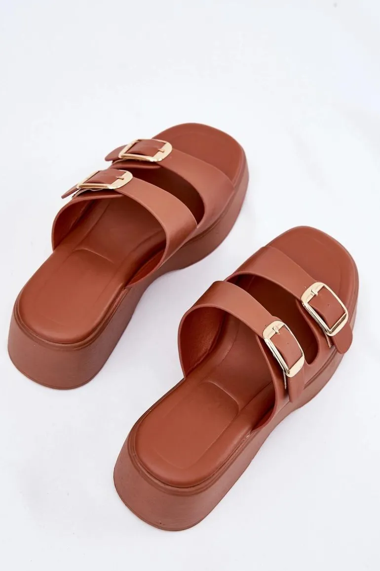 Damskie klapki wykonane ze skóry ekologicznej. Osadzone na koturnie wraz z platformą. Model ten wyróżniają dwie klamry z regulowanymi paskami. Miękka wkładka zapewnia komfort noszenia przez cały dzień, niezależnie od okazji. Klapki świetnie sprawdzą się zarówno w zestawieniu z letnią sukienką, jak i z materiałowymi spodniami, dodając stylu każdej stylizacji. Idealne na co dzień oraz na wyjścia ze znajomymi! Przy wyborze rozmiaru prosimy kierować się tabelą rozmiarów.