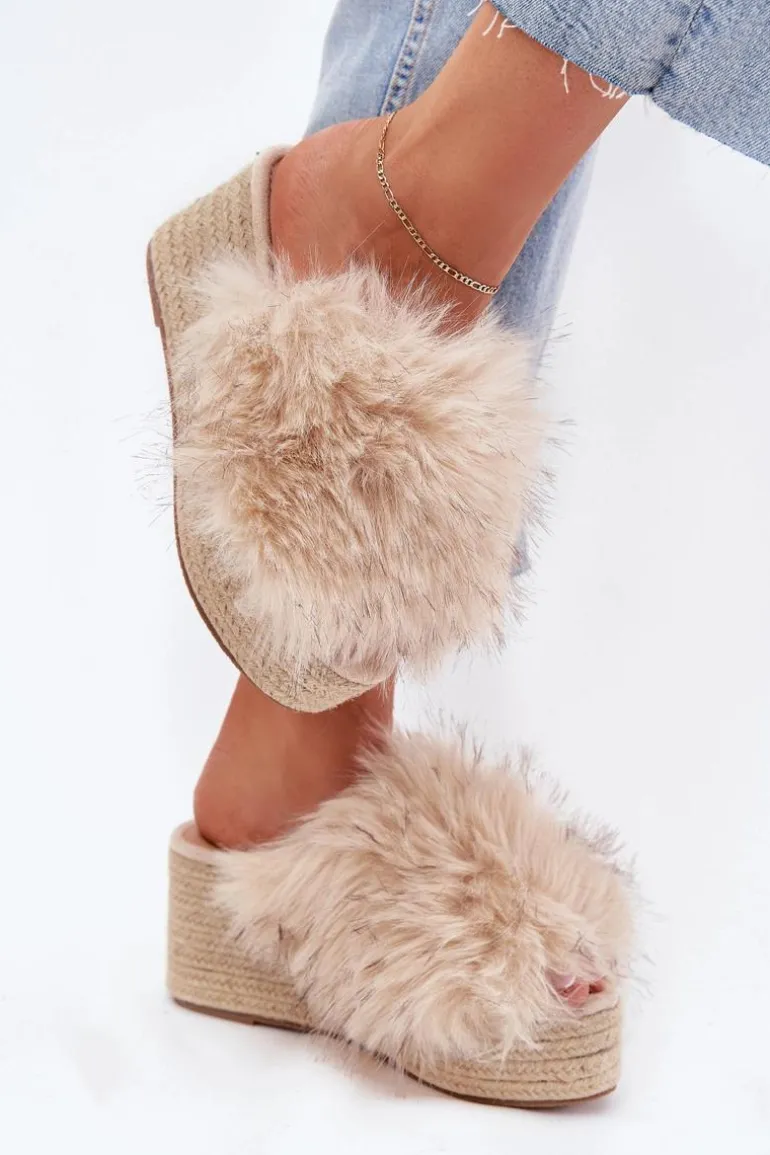 Klapki damskie z futerkiem to modny wybór na letnie dni. Osadzone na koturnie i platformie z plecionką, dodają lekkości i wakacyjnego uroku, idealnie komponując się z letnimi sukienkami, spódnicami czy szortami. Przy wyborze rozmiaru prosimy sugerować się tabelą rozmiarów.