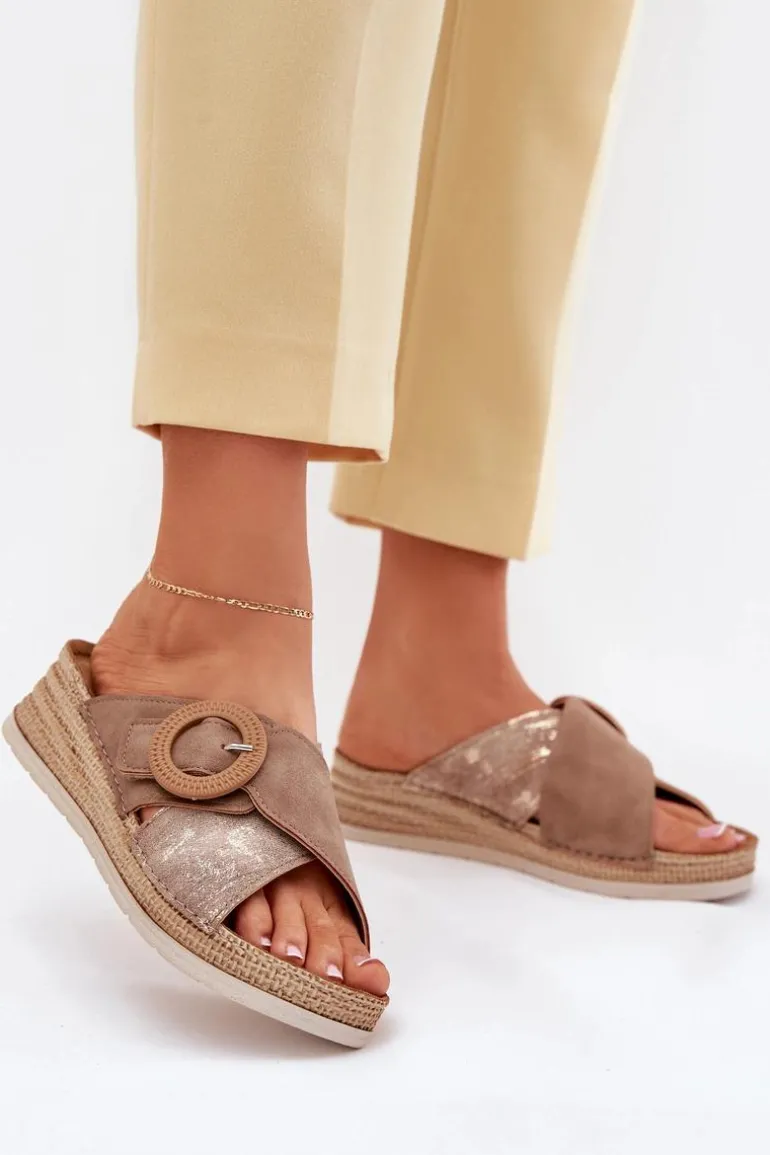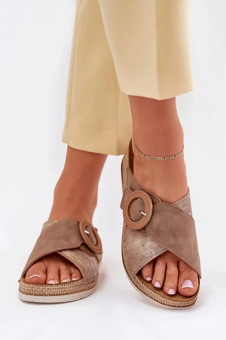 Klapki damskie od marki Inblu, osadzone na koturnie, to doskonały wybór na ciepłe dni. Wkładka z naturalnego zamszu zapewnia komfort i wygodę, a ozdobna klamra dodaje im eleganckiego charakteru. Lekkie i wygodne, stanowią idealne uzupełnienie codziennych stylizacji, łącząc funkcjonalność z modnym wyglądem. Przy wyborze rozmiaru prosimy sugerować się tabelą rozmiarów.