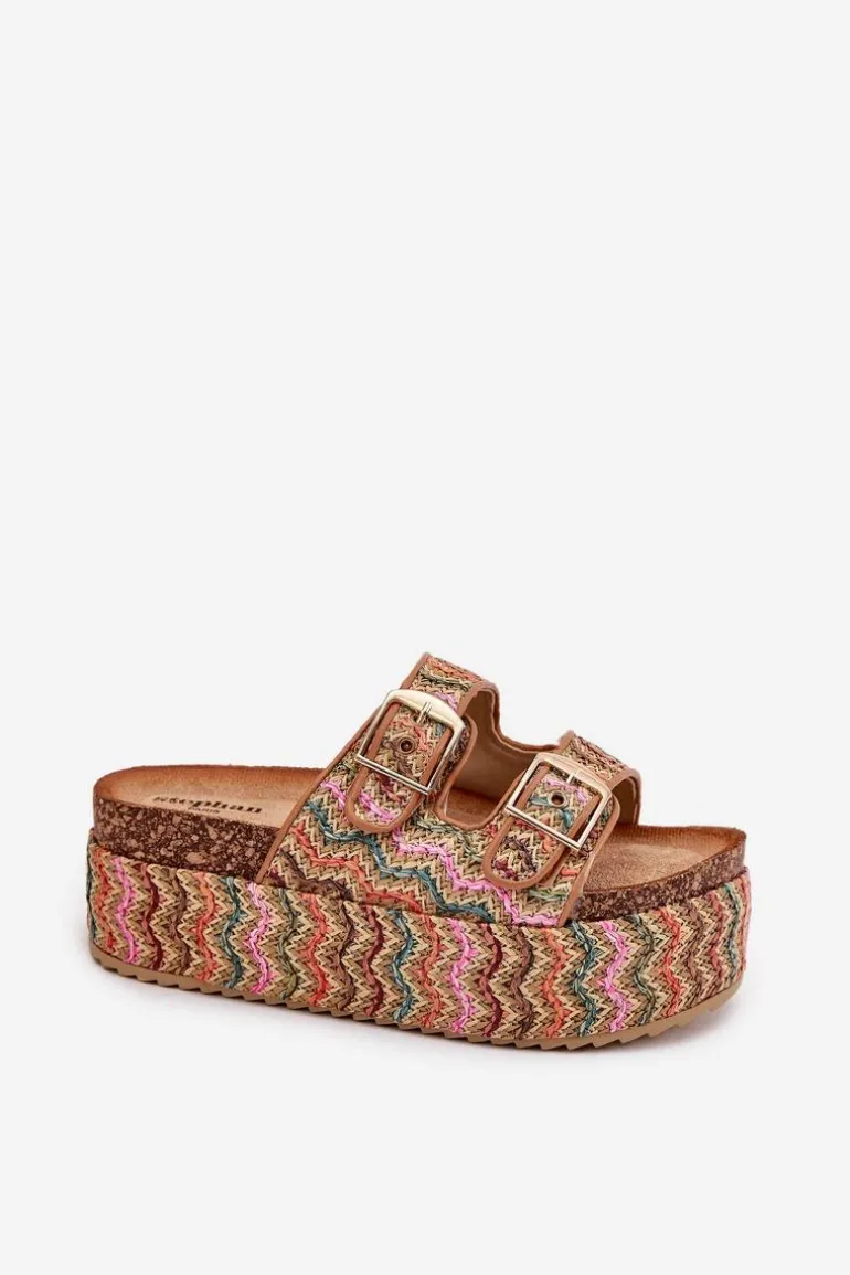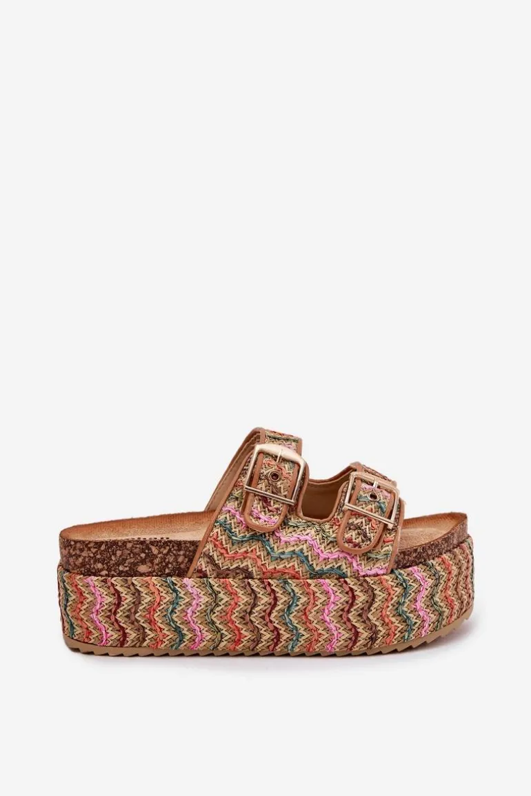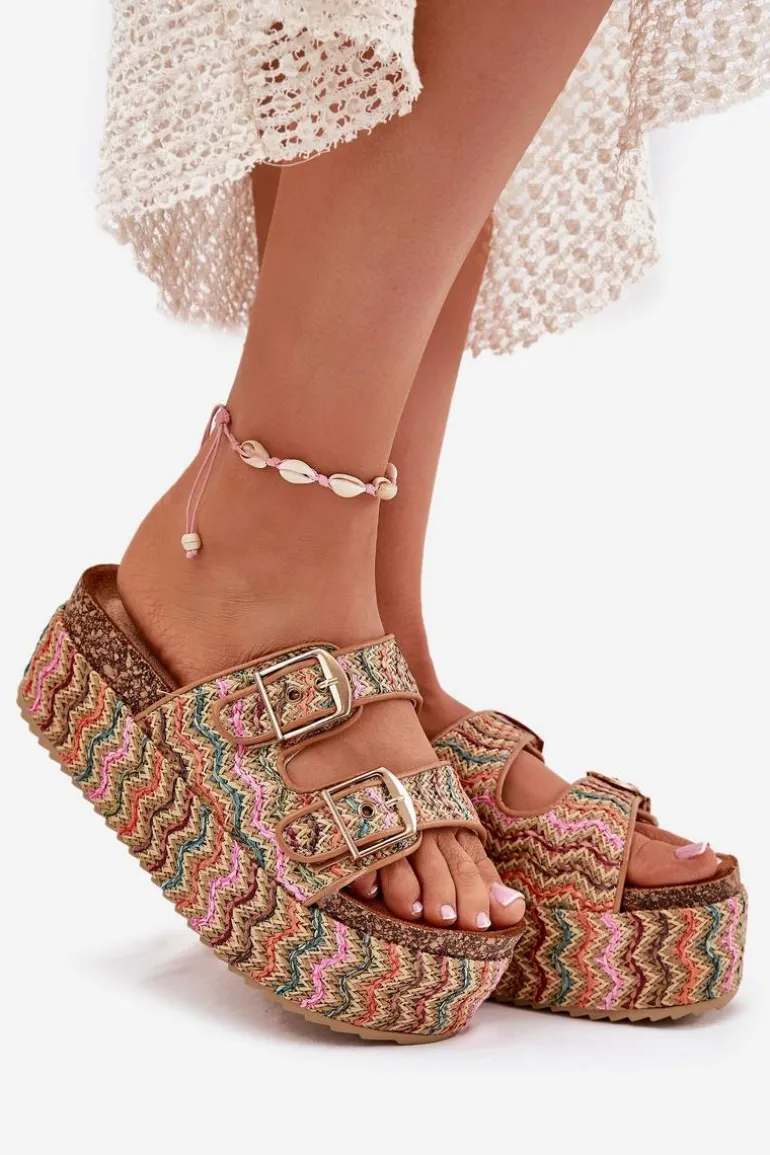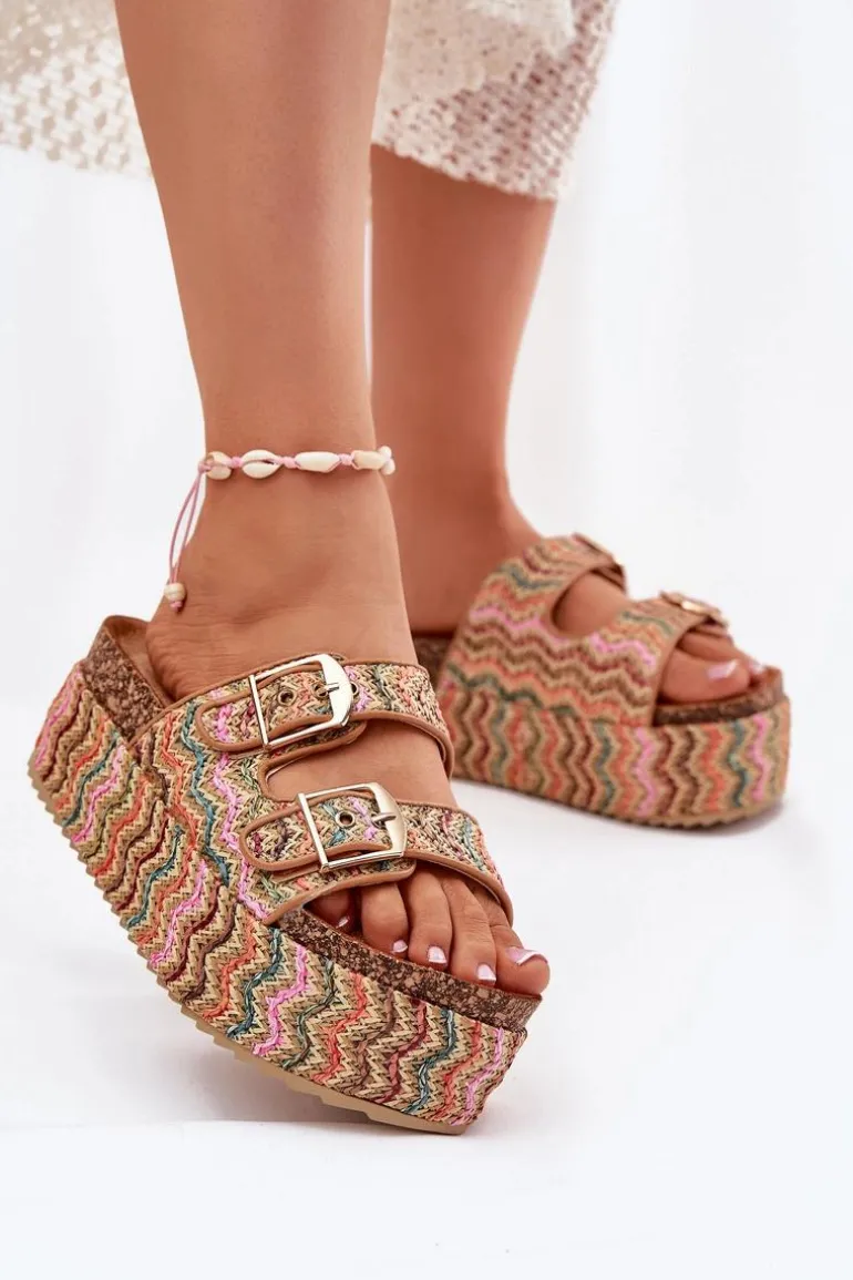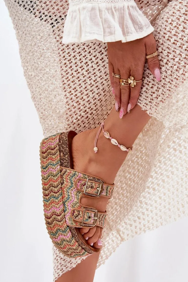 Klapki damskie z plecionką, osadzone na masywnej platformie, to modna i komfortowa propozycja na ciepłe dni. Posiadają dwa regulowane paski z klamrami, które pozwalają na idealne dopasowanie do stopy. Profilowana wkładka zapewnia wygodę przez cały dzień. Doskonałe do letnich stylizacji, łączą funkcjonalność z nowoczesnym wyglądem. Przy wyborze rozmiaru rosimy sugerować się tabelą rozmiarów.
