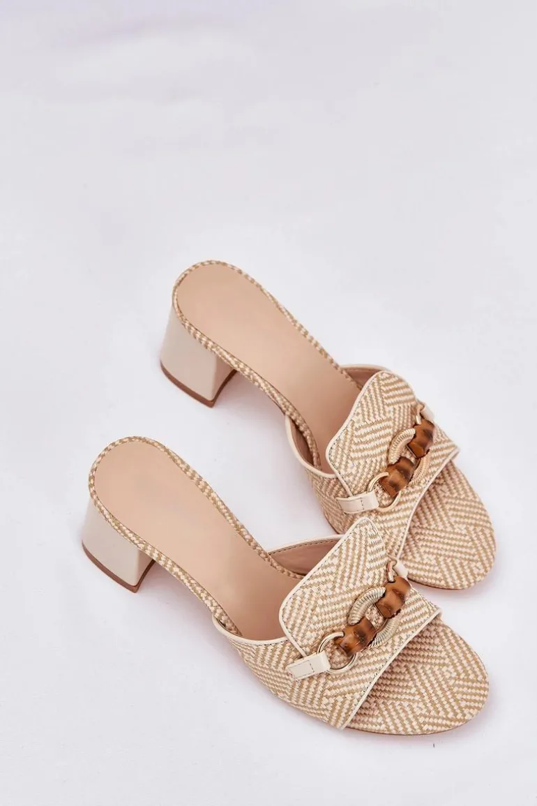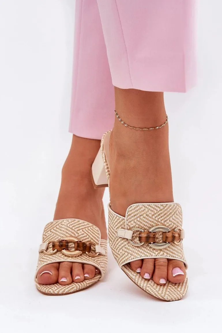 Stylowe klapki damskie z plecionki. Osadzone na obcasie typu słupek. Z przodu ozdoba, która nadaje unikalnego charakteru i przyciąga wzrok. Te klapki będą doskonałym wyborem na letnie dni, idealnie komponując się z sukienkami, spódnicami czy spodniami. Przy wyborze rozmiaru prosimy kierować się tabelą rozmiarów.