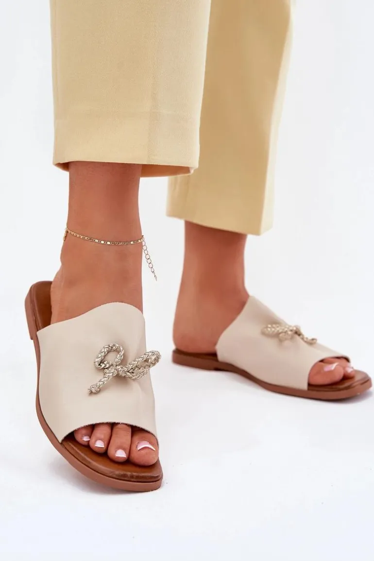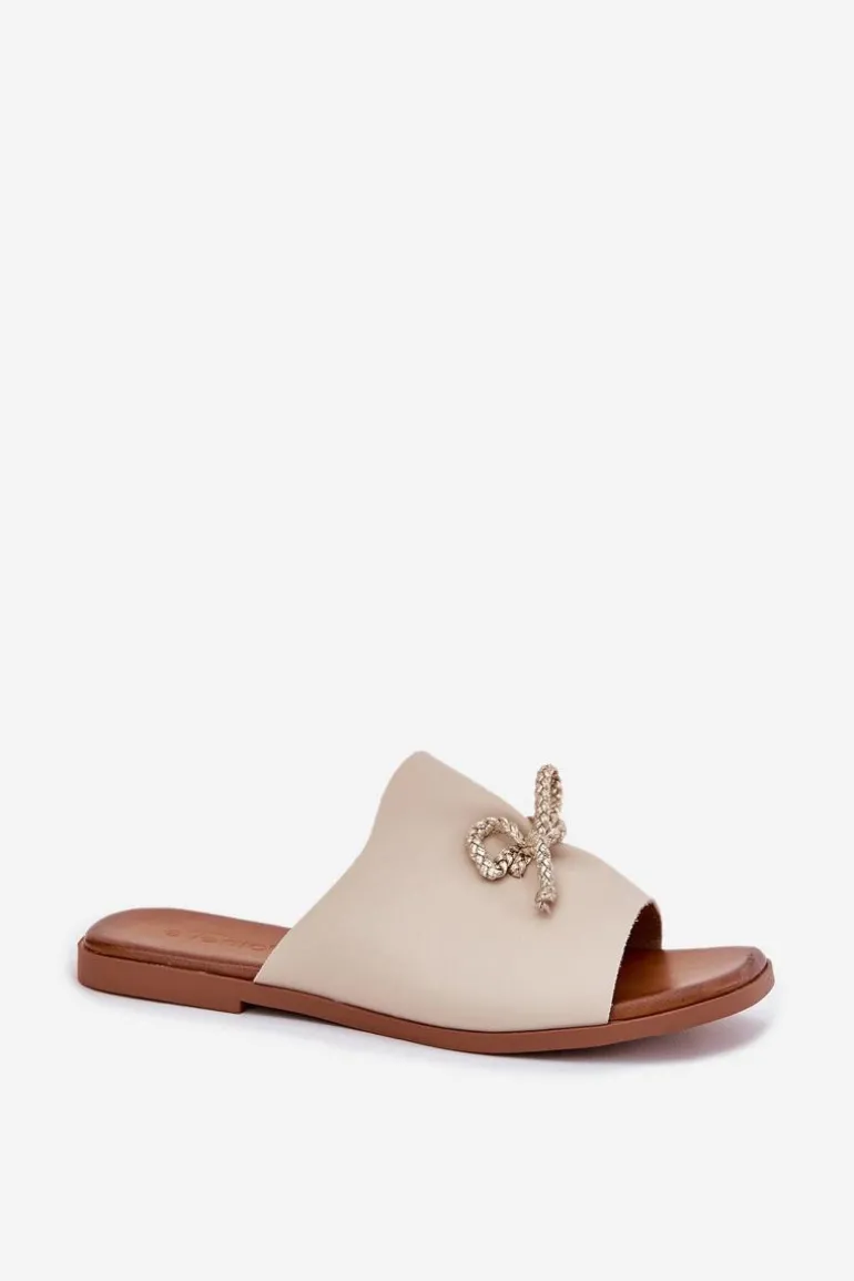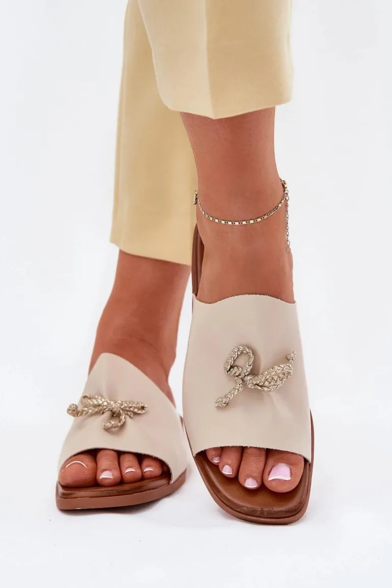 Klapki damskie z eko skóry, osadzone na płaskim obcasie, to elegancka propozycja na ciepłe dni. Model ten wyróżnia się subtelnym ozdobnym wiązaniem, które dodaje im wyjątkowego charakteru. Ich klasyczny fason sprawia, że doskonale komponują się zarówno z sukienkami, jak i spodniami materiałowymi, tworząc stylowy i wygodny look. Przy wyborze rozmiaru prosimy sugerować się tabelą rozmiarów.