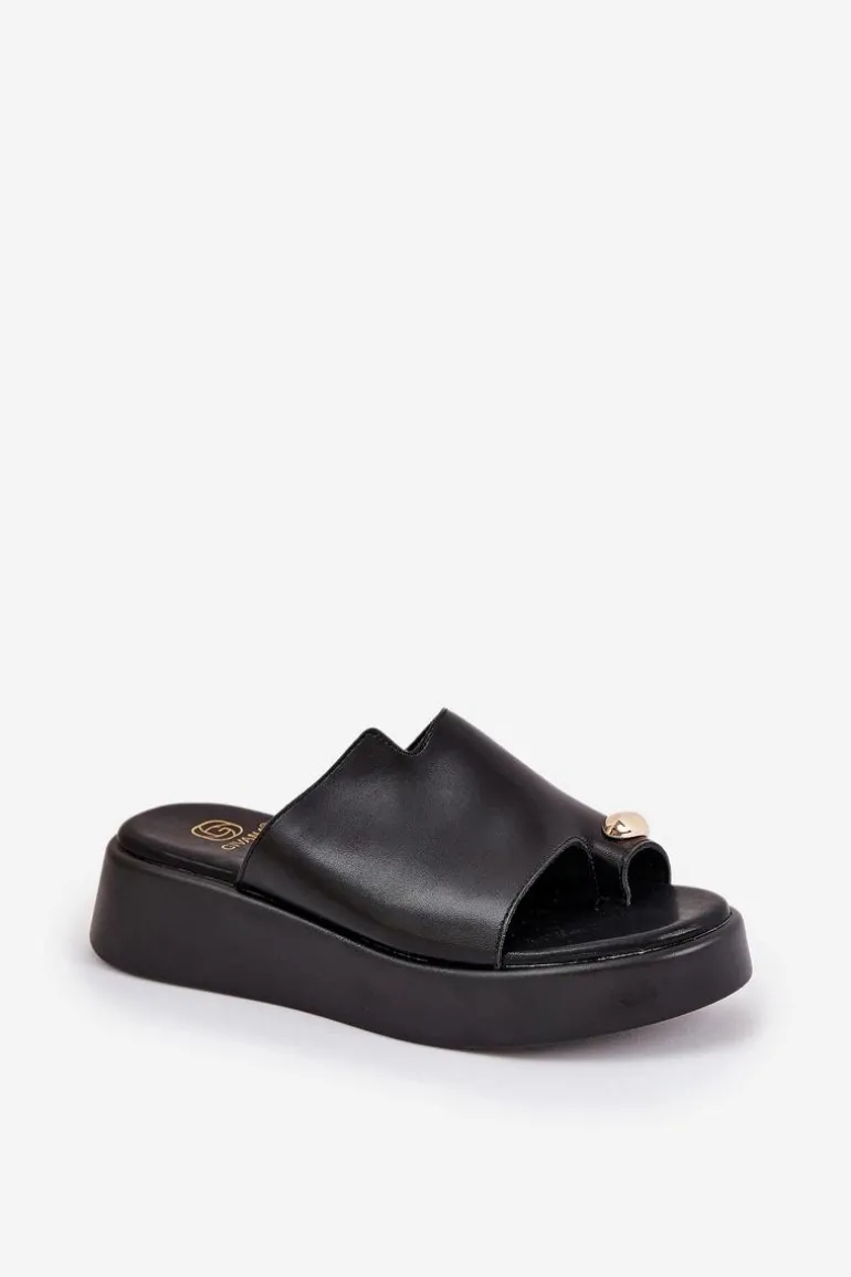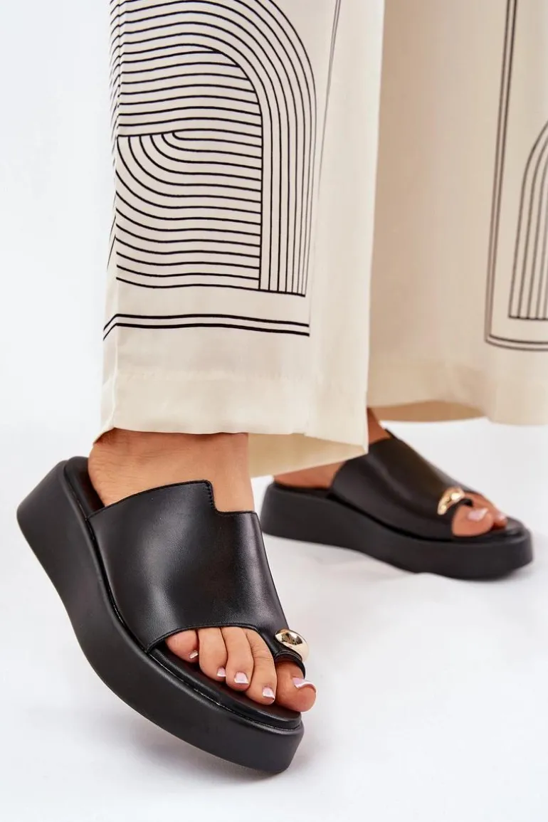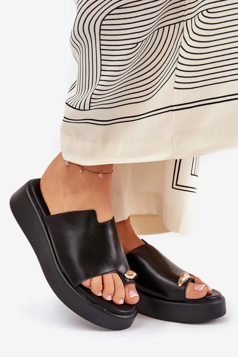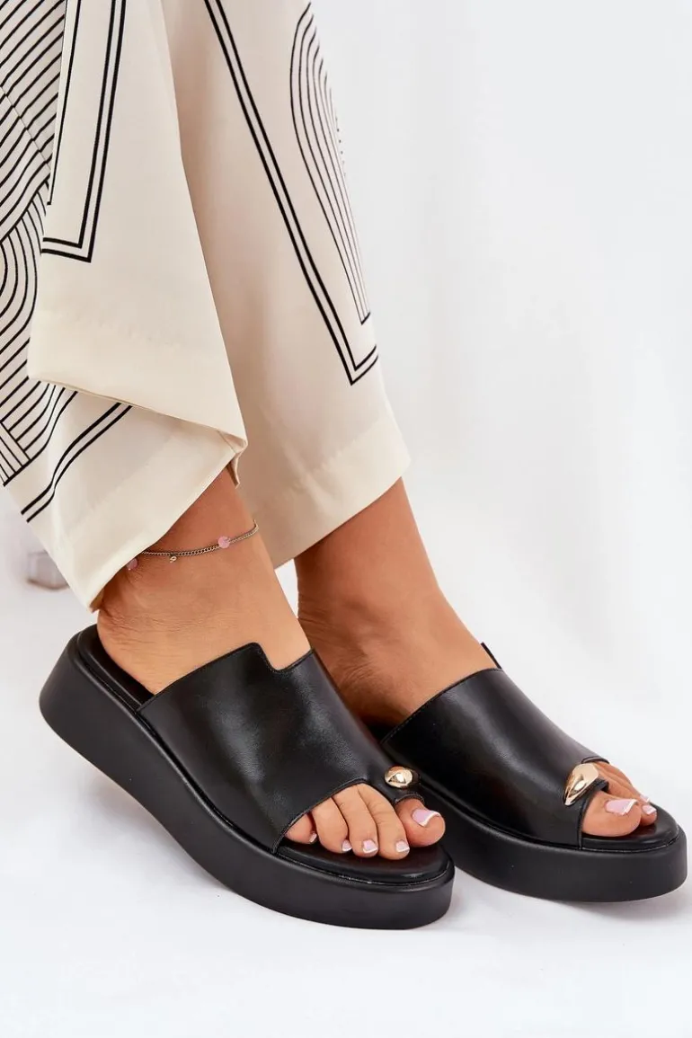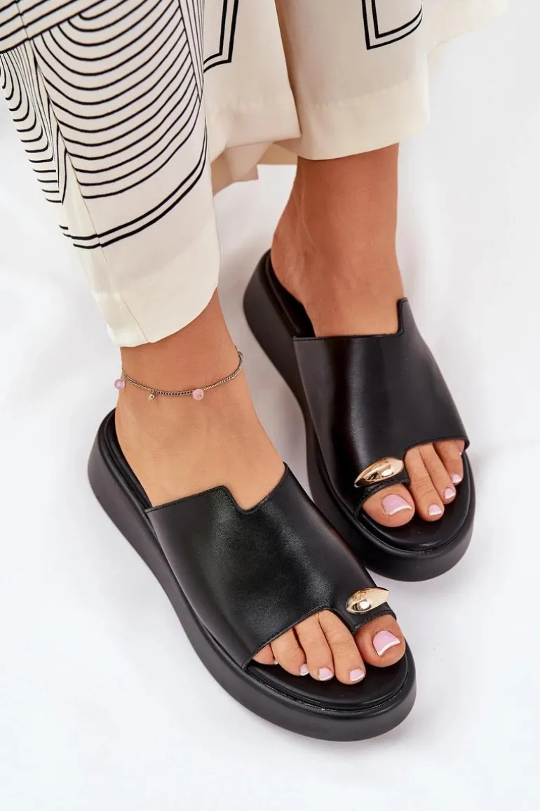 Stylowe klapki damskie z eko skóry. Osadzone na delikatnym koturnie i platformie. Miękka wkładka zapewnia wygodę przez cały dzień. Z przodu znajduje się subtelny, ozdobny detal, który dodaje wyjątkowego charakteru. Idealne na ciepłe dni, te klapki doskonale pasują do letnich sukienek, spódnic i spodni, wprowadzając lekkość do każdej stylizacji. Przy wyborze rozmiaru prosimy kierować się tabelą rozmiarów.
