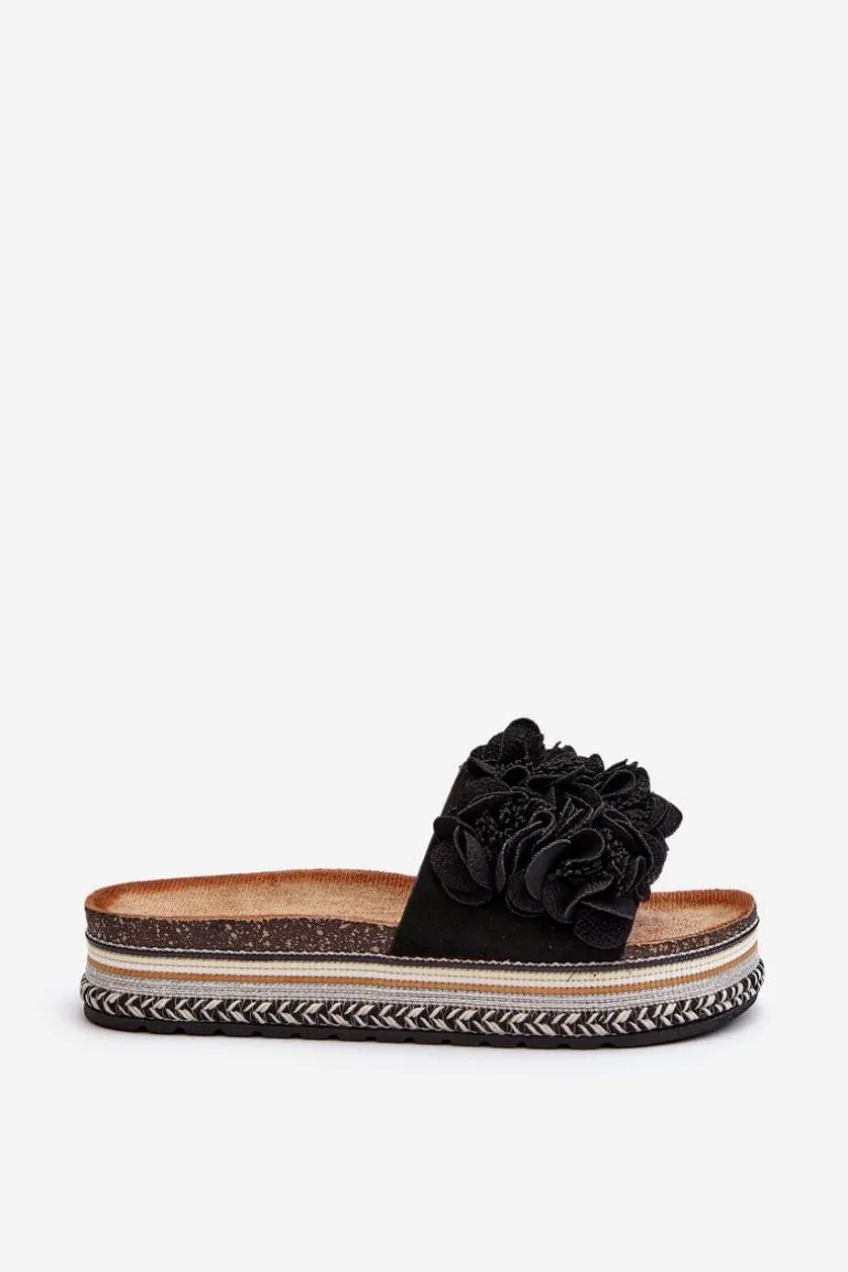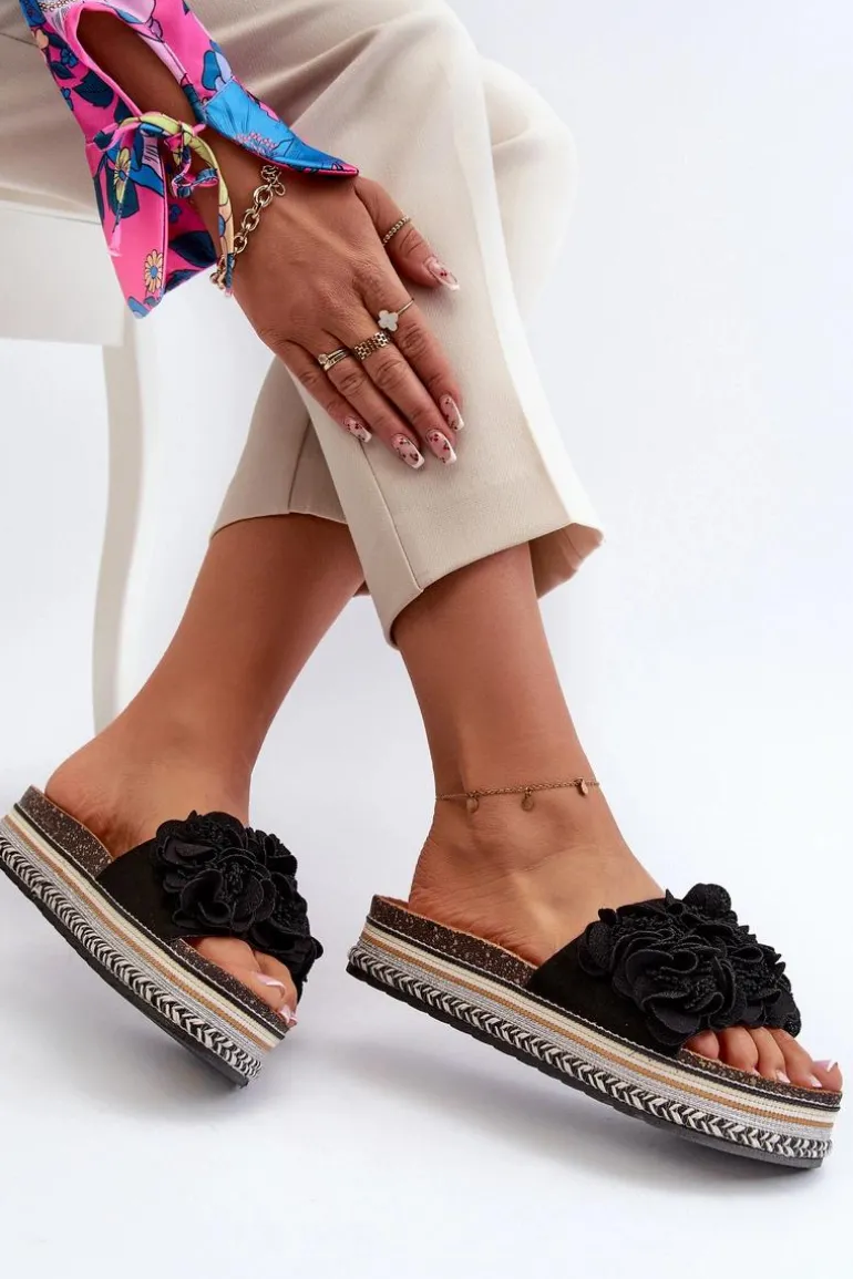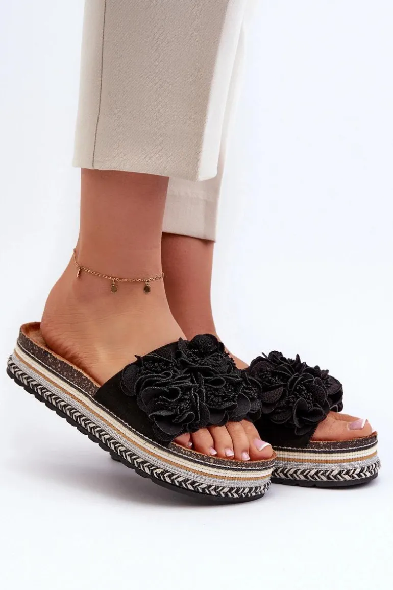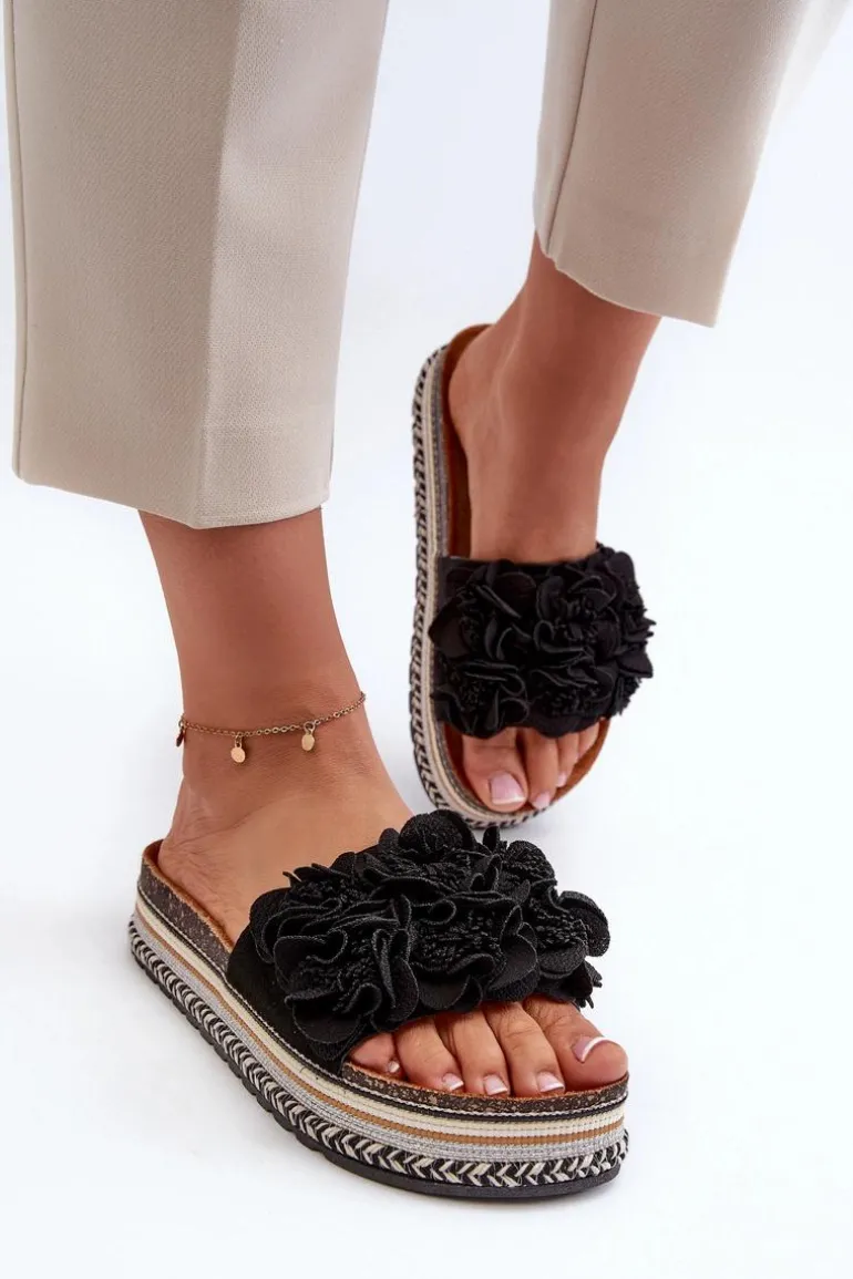 Klapki Damskie Na Platformie Ozdobione Kwiatkami Czarne Nodina