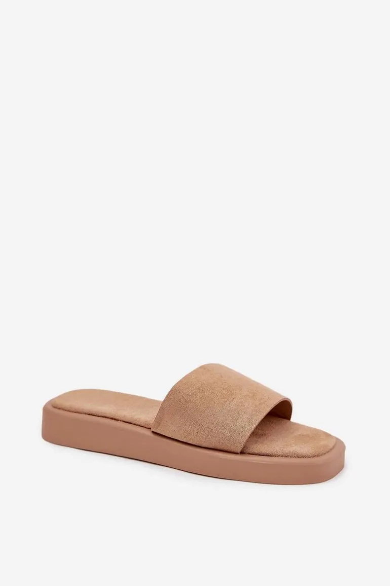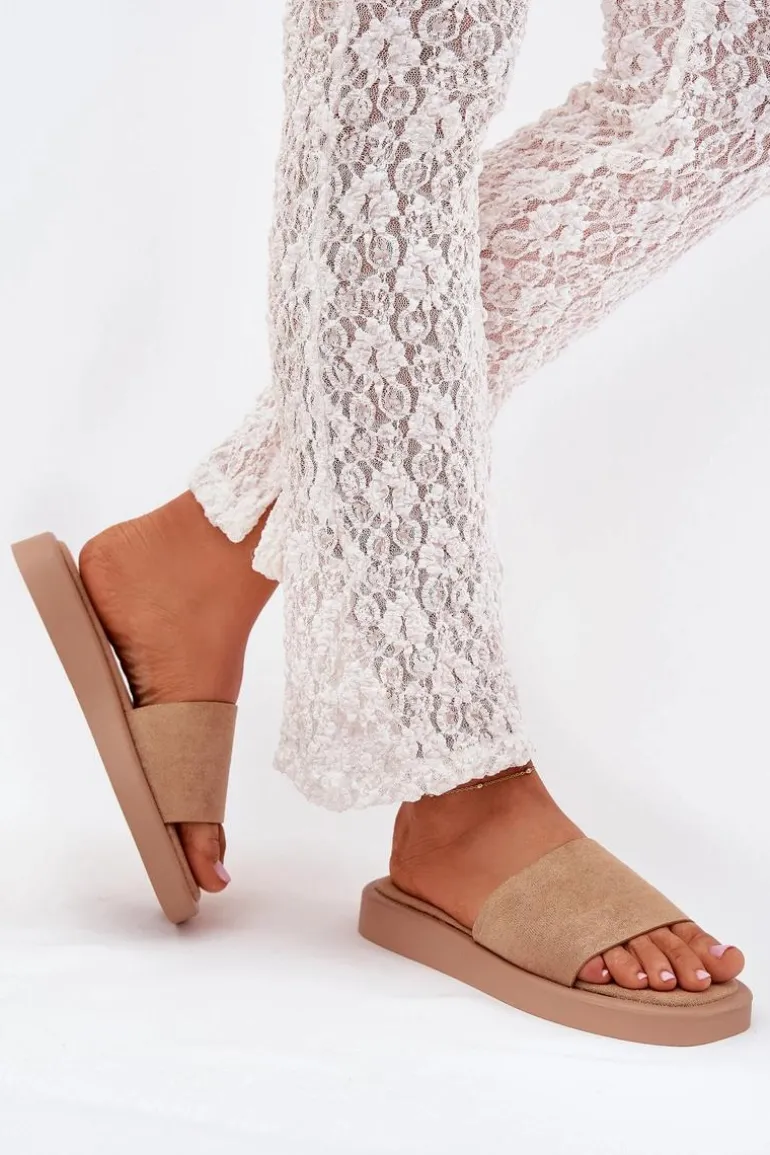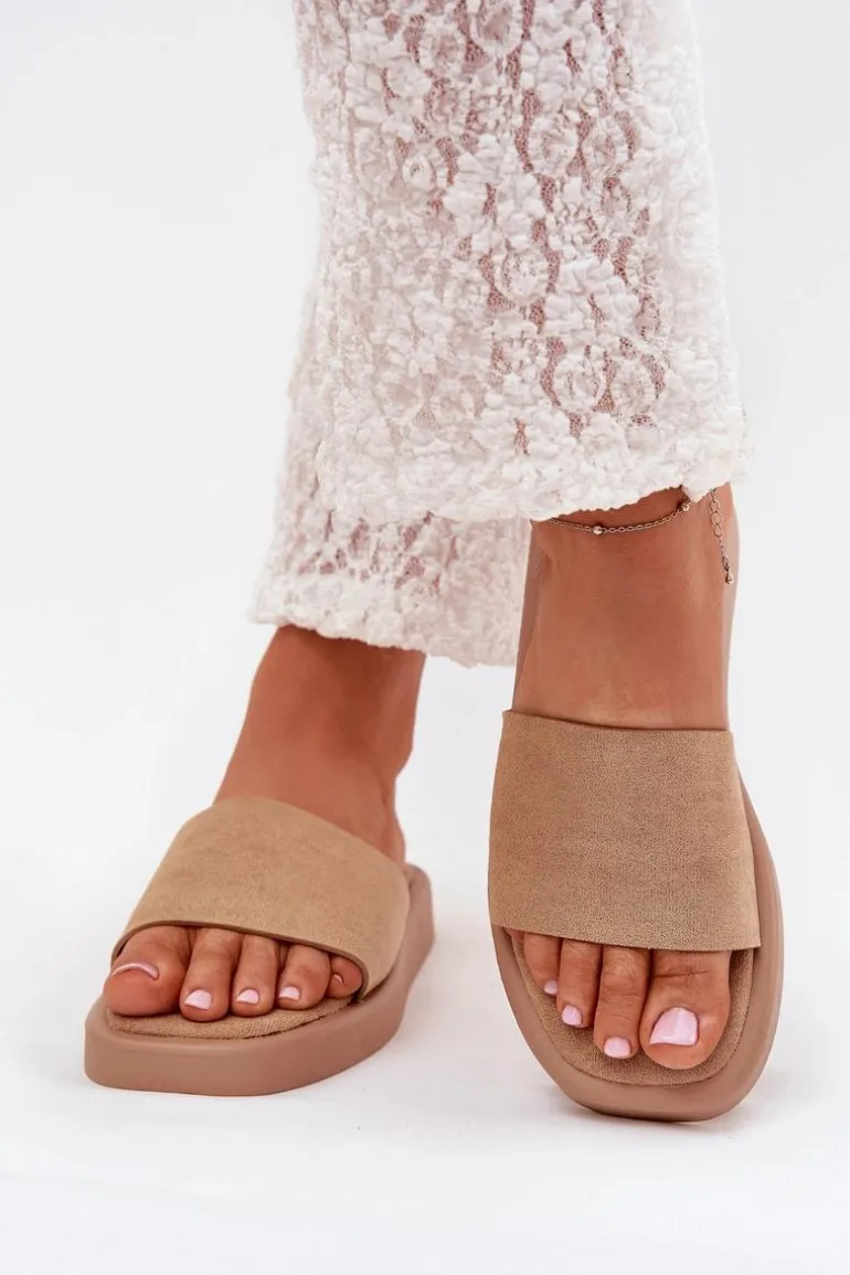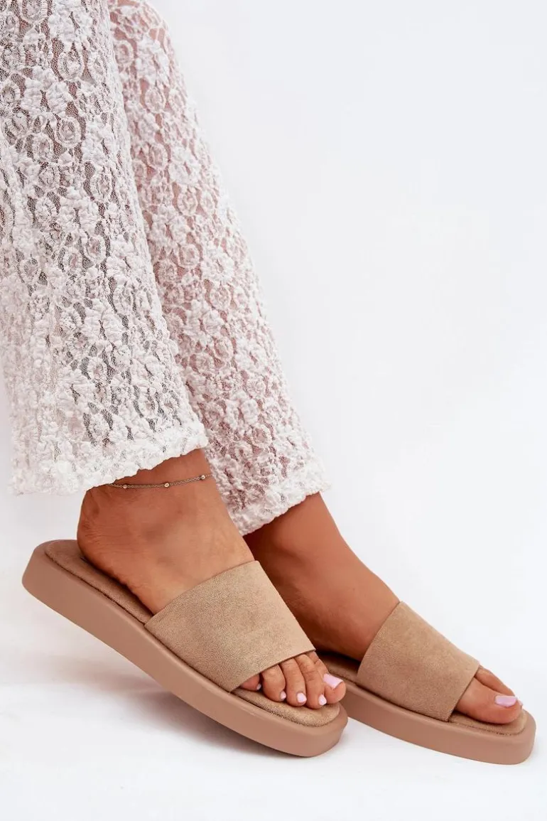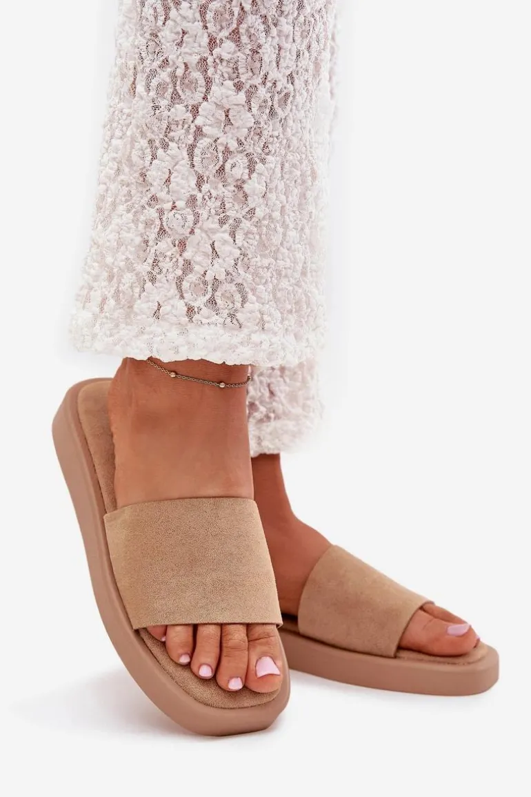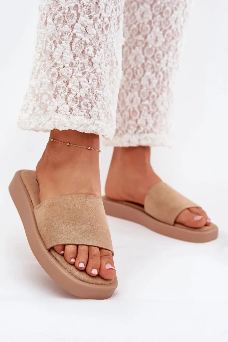 Klasyczne klapki damskie z eko zamszu, osadzone na platformie, łączą wygodę z prostym stylem. Idealne do casualowych stylizacji, doskonale komponują się z sukienkami, spódnicami czy spodniami, zapewniając komfort i elegancki wygląd na co dzień. Przy wyborze rozmiaru prosimy sugerować się tabelą rozmiarów.