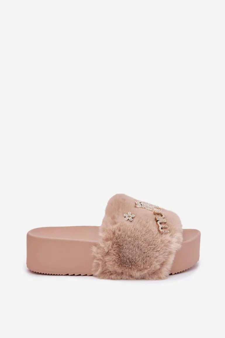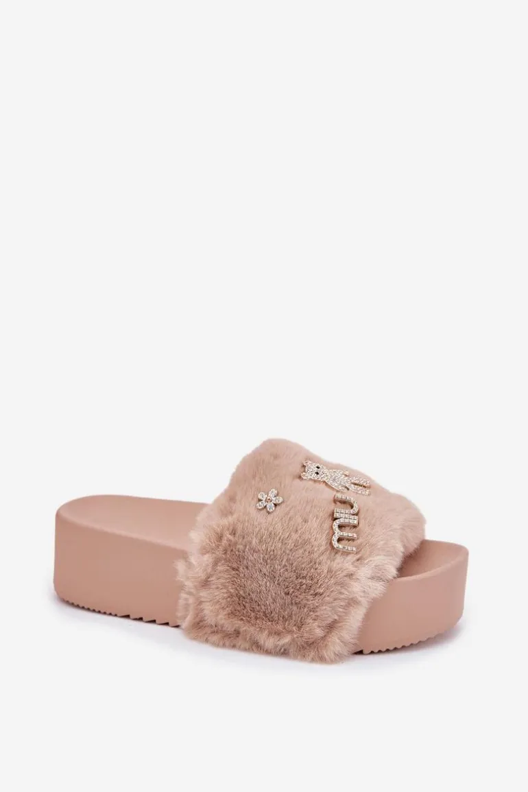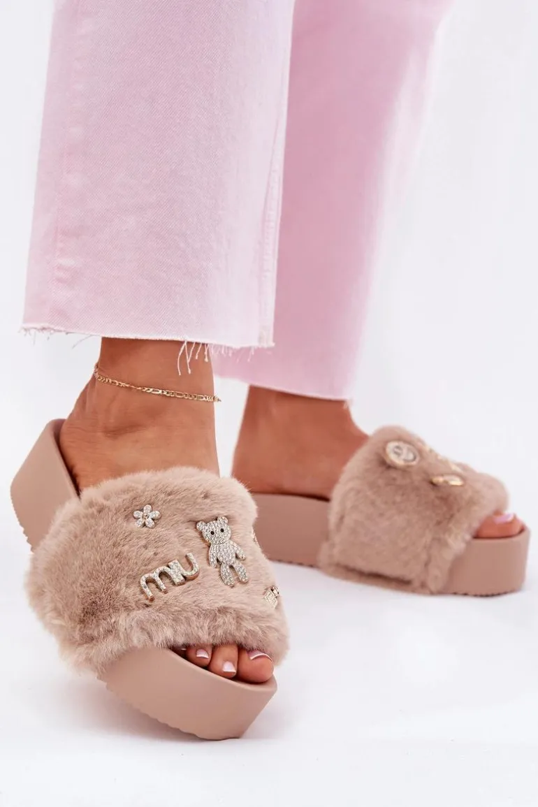 Klapki damskie z futerkiem. Osadzone na masywnej platformie, zapewniają dodatkową wysokość. Złote przypinki stanowią stylowy akcent, nadając wyjątkowego uroku. Idealne do casualowych stylizacji. Przy wyborze rozmiaru prosimy sugerować się tabelą rozmiarów.