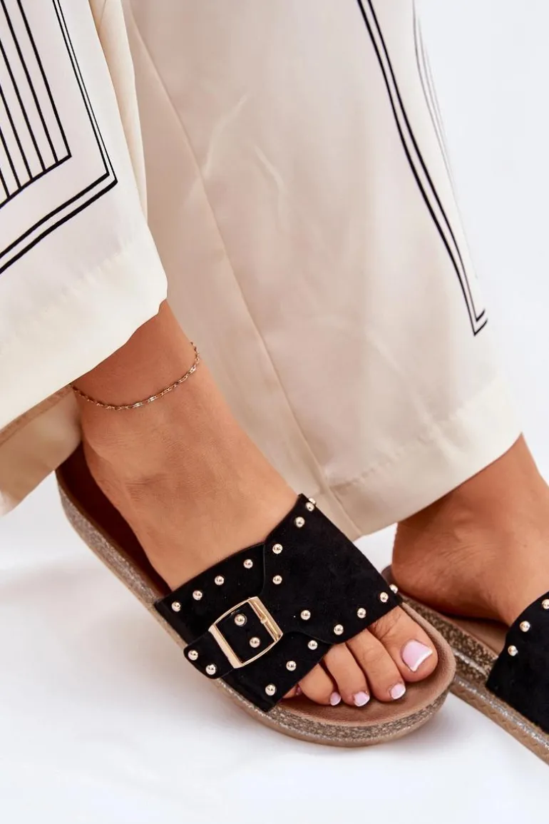 Stylowe klapki damskie z eko zamszu, ozdobione klamrą i ćwiekami, które nadają im nowoczesnego i odważnego charakteru. Osadzone na platformie z brokatem, które wprowadzają do każdej stylizacji subtelny blask. Doskonałe na letnie dni, te klapki łączą wygodę z modnym wyglądem, świetnie pasując do sukienek, spódnic i spodni. Przy wyborze rozmiaru rosimy sugerować się tabelą rozmiarów.