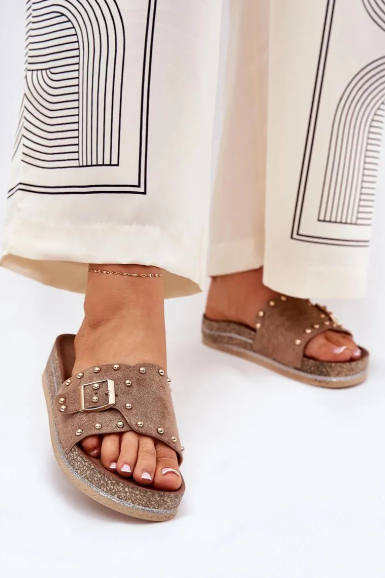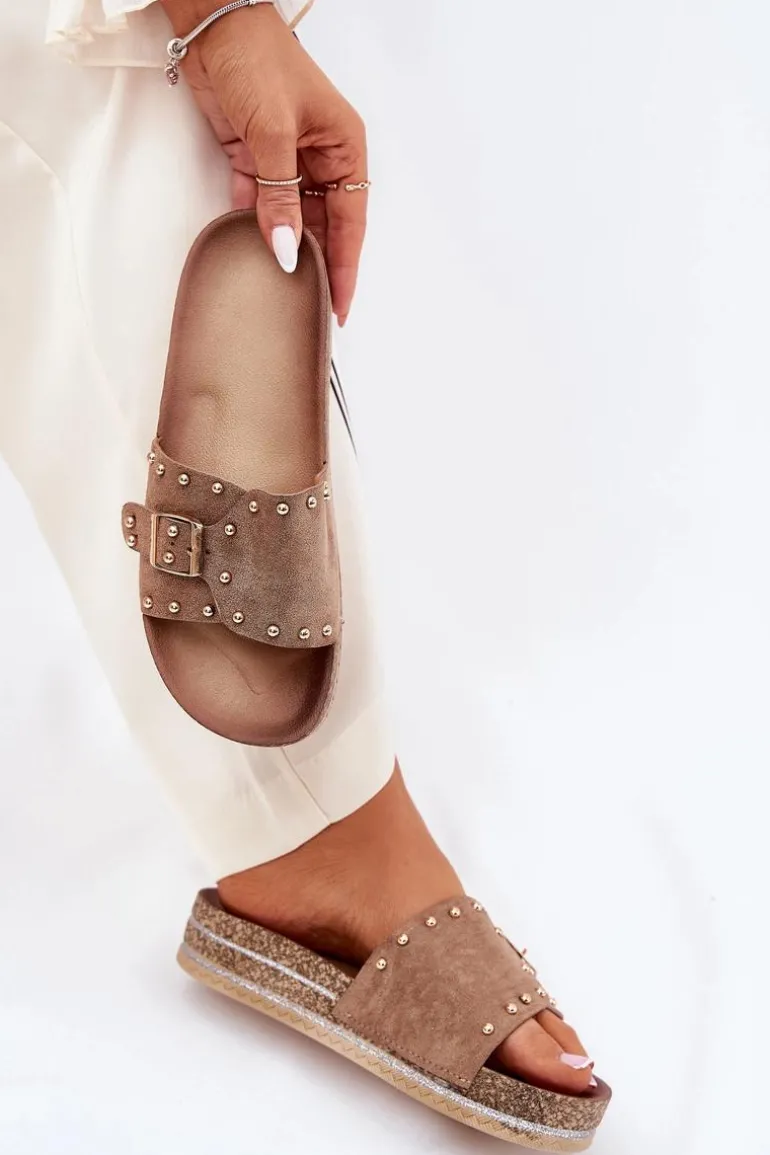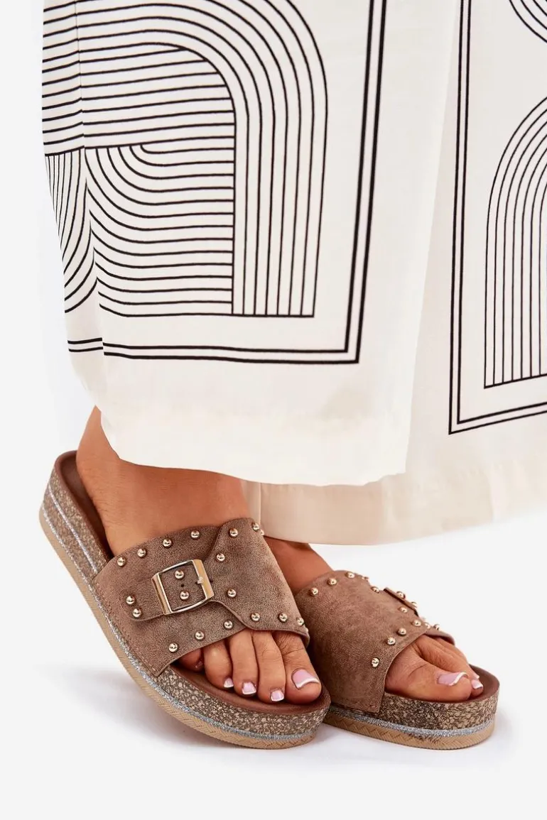 Klapki Damskie Na Platformie Z Klamrą I Ćwiekami Khaki Nusithia