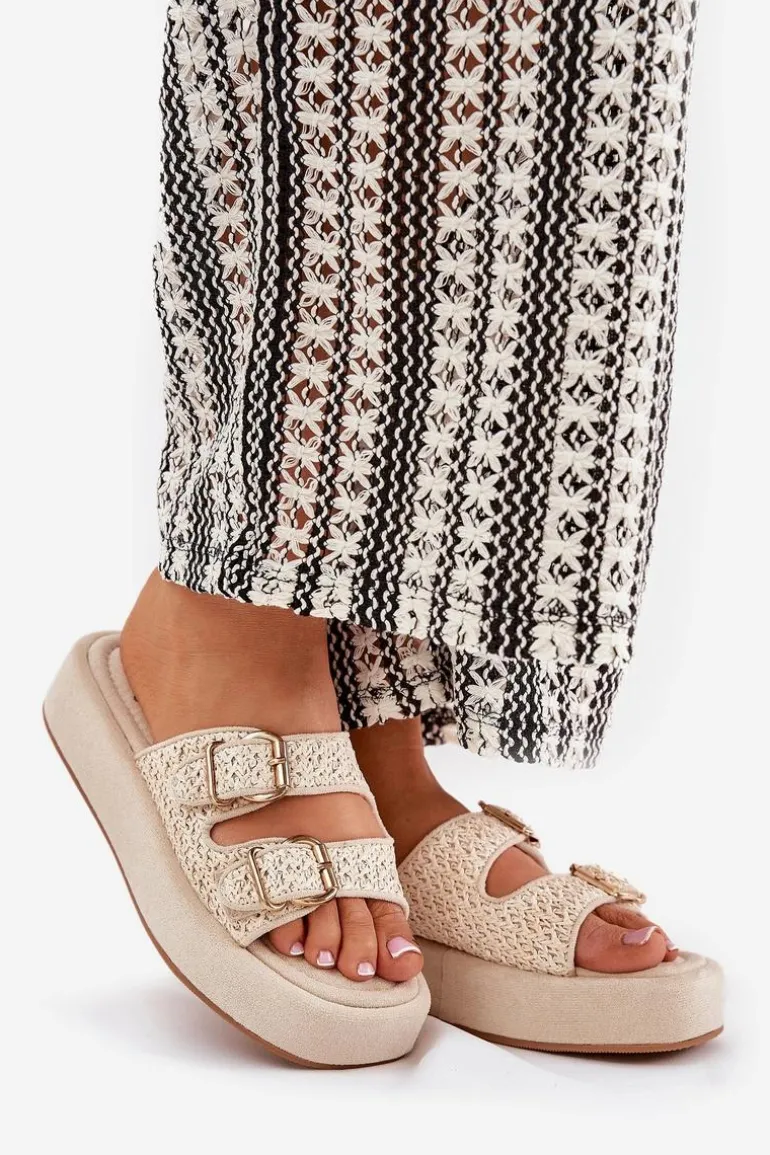 Stylowe klapki damskie na platformie, które łączą wygodę z modnym wyglądem. Ozdobione plecionką i klamrami, co dodaje unikalnego charakteru. Miękka, eko zamszowa wkładka zapewnia komfort przez cały dzień. Te klapki doskonale sprawdzą się w letnich stylizacjach, pasując do sukienek, spódnic czy szortów, wprowadzając lekkość do każdej okazji. Przy wyborze rozmiaru rosimy sugerować się tabelą rozmiarów.