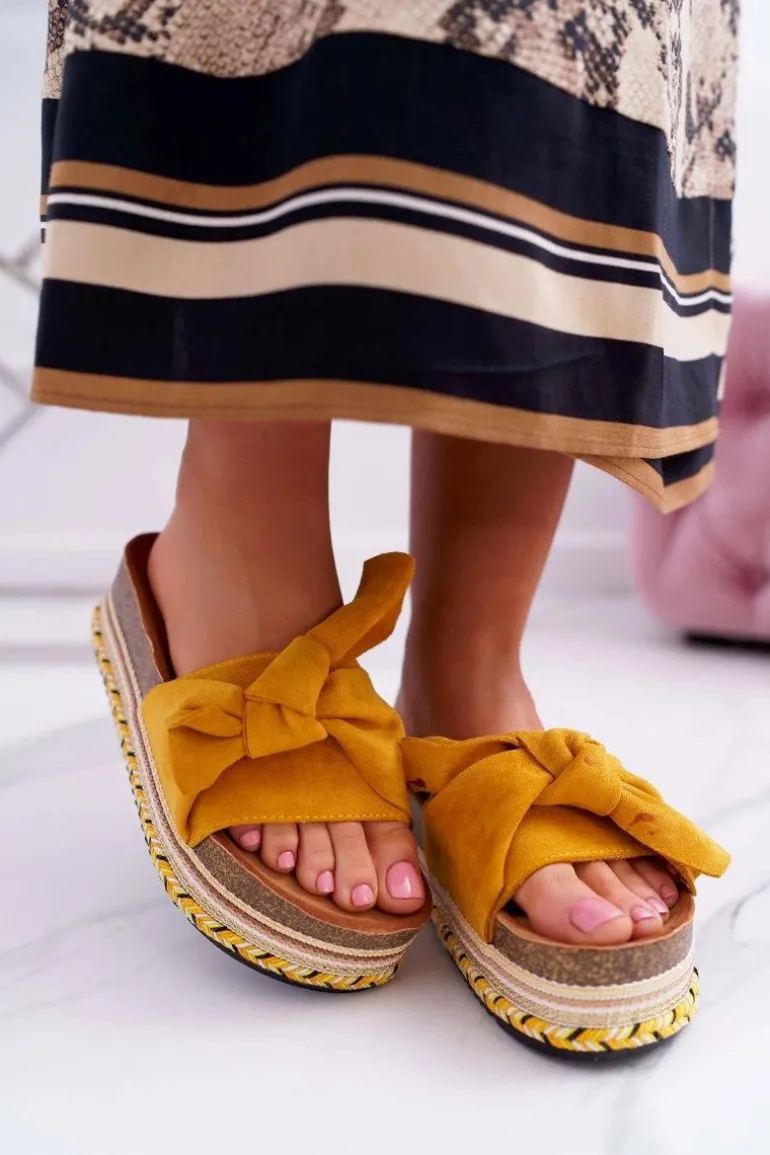 Klapki Damskie Na Platformie Z Kokardą Żółte Chantal