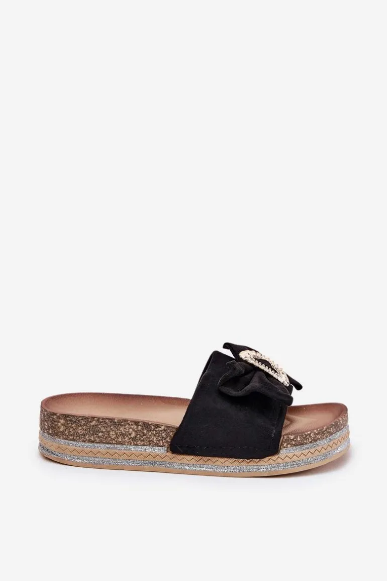 Klapki wykonane z eko zamszu. Z przodu kokardka i ozdobna broszka. Osadzone na platformie z brokatem, który wprowadza do każdej stylizacji odrobinę blasku i elegancji. Te klapki będą doskonałym wyborem na letnie dni, idealnie komponując się z sukienkami, spódnicami czy szortami, dodając każdemu lookowi nowoczesnego akcentu. Przy wyborze rozmiaru rosimy sugerować się tabelą rozmiarów.