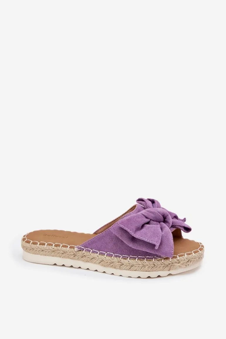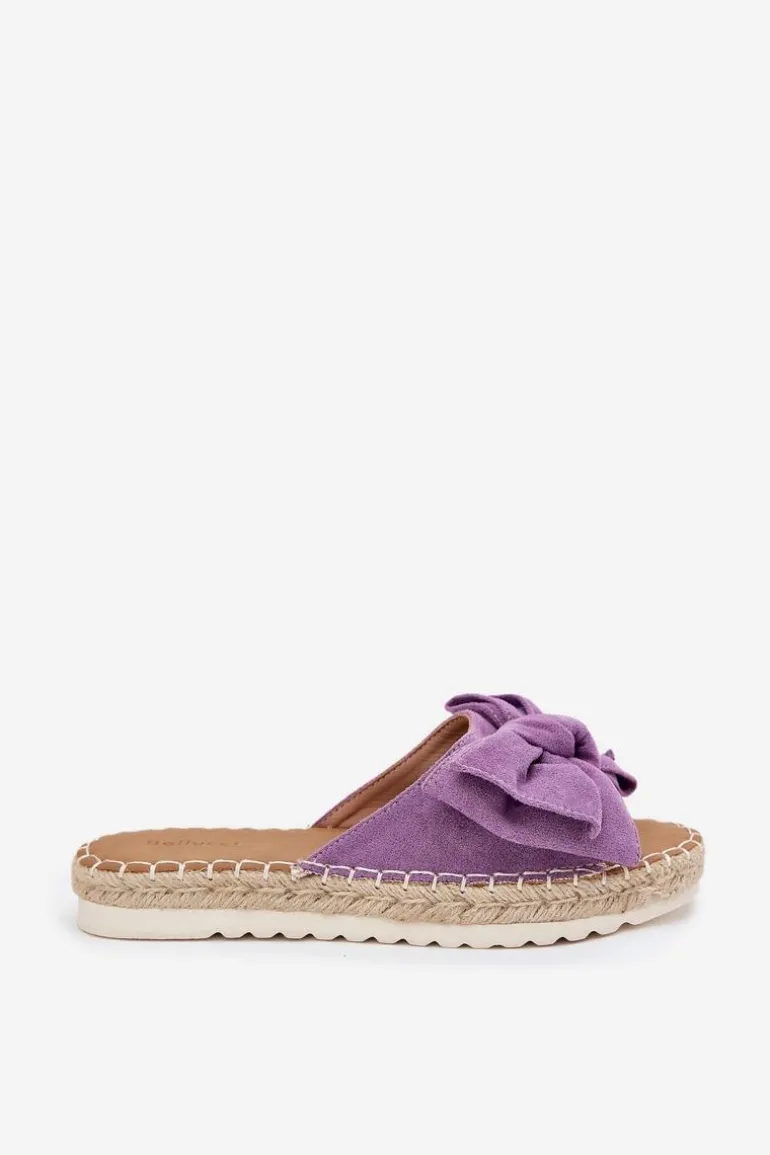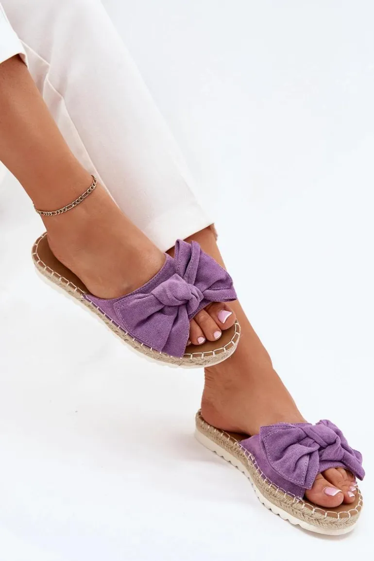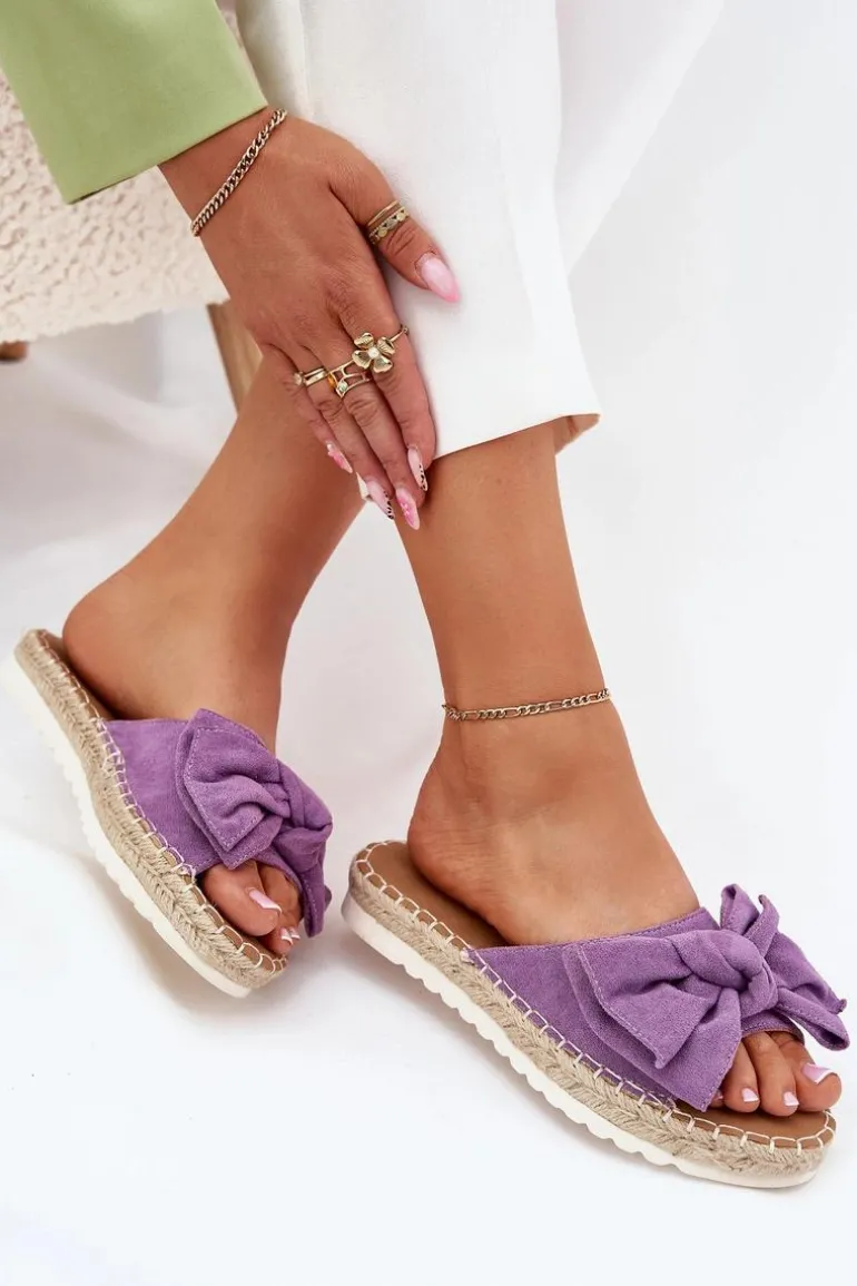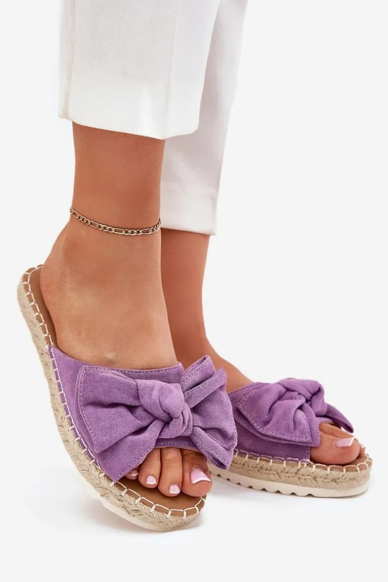 Klapki damskie wykonane z eko zamszu. Osadzone na platformie z plecionką to stylowa i wygodna propozycja na ciepłe dni. Z przodu znajduje się subtelna kokardka, która dodaje im uroku. Lekkie i komfortowe, doskonale pasują do sukienek, spódnic oraz spodni. Przy wyborze rozmiaru rosimy sugerować się tabelą rozmiarów.