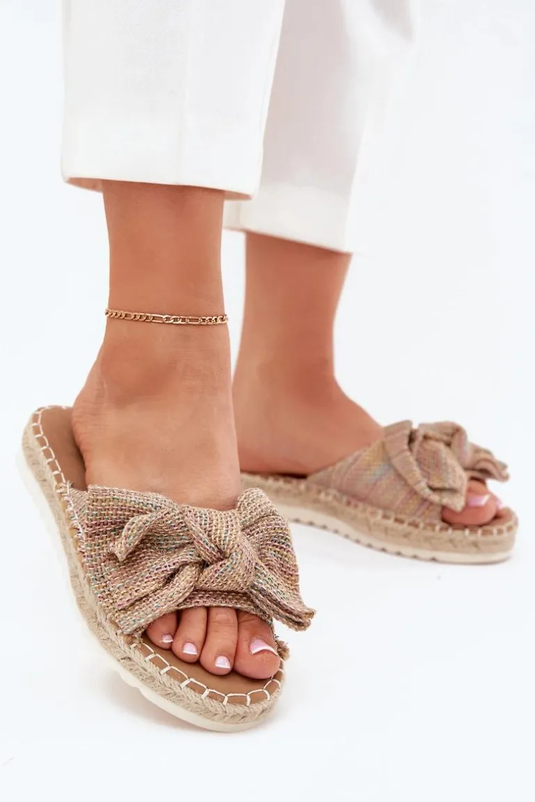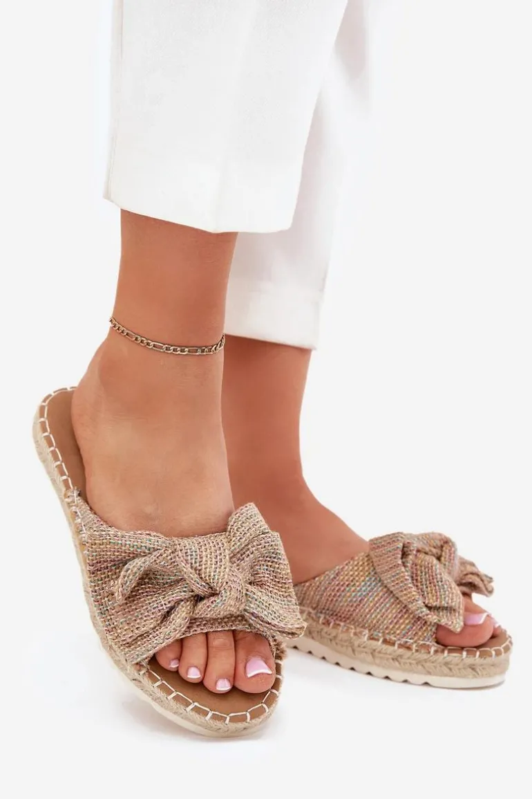 Klapki damskie wykonane z tworzywa. Osadzone na platformie z plecionką to stylowa i wygodna propozycja na ciepłe dni. Z przodu znajduje się subtelna kokardka, która dodaje im uroku. Lekkie i komfortowe, doskonale pasują do sukienek, spódnic oraz spodni. Przy wyborze rozmiaru rosimy sugerować się tabelą rozmiarów.