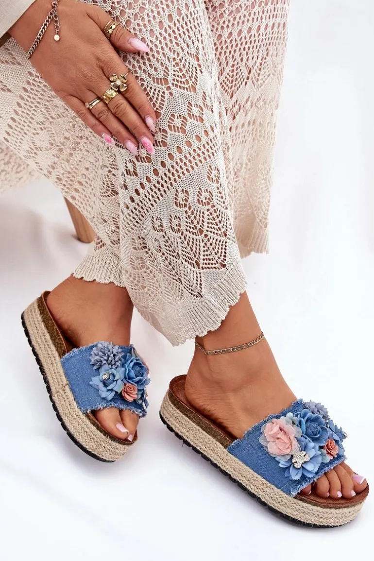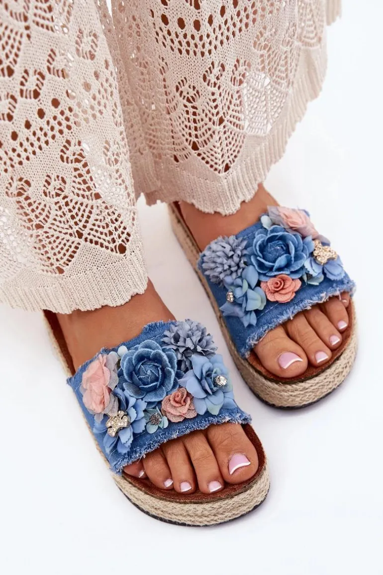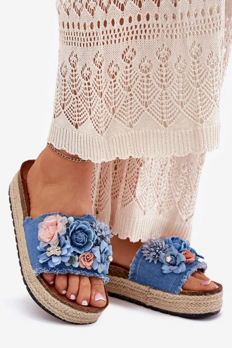 Klapki Damskie Na Platformie Z Plecionką I Kwiatkami Niebieskie Chellia