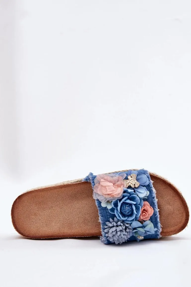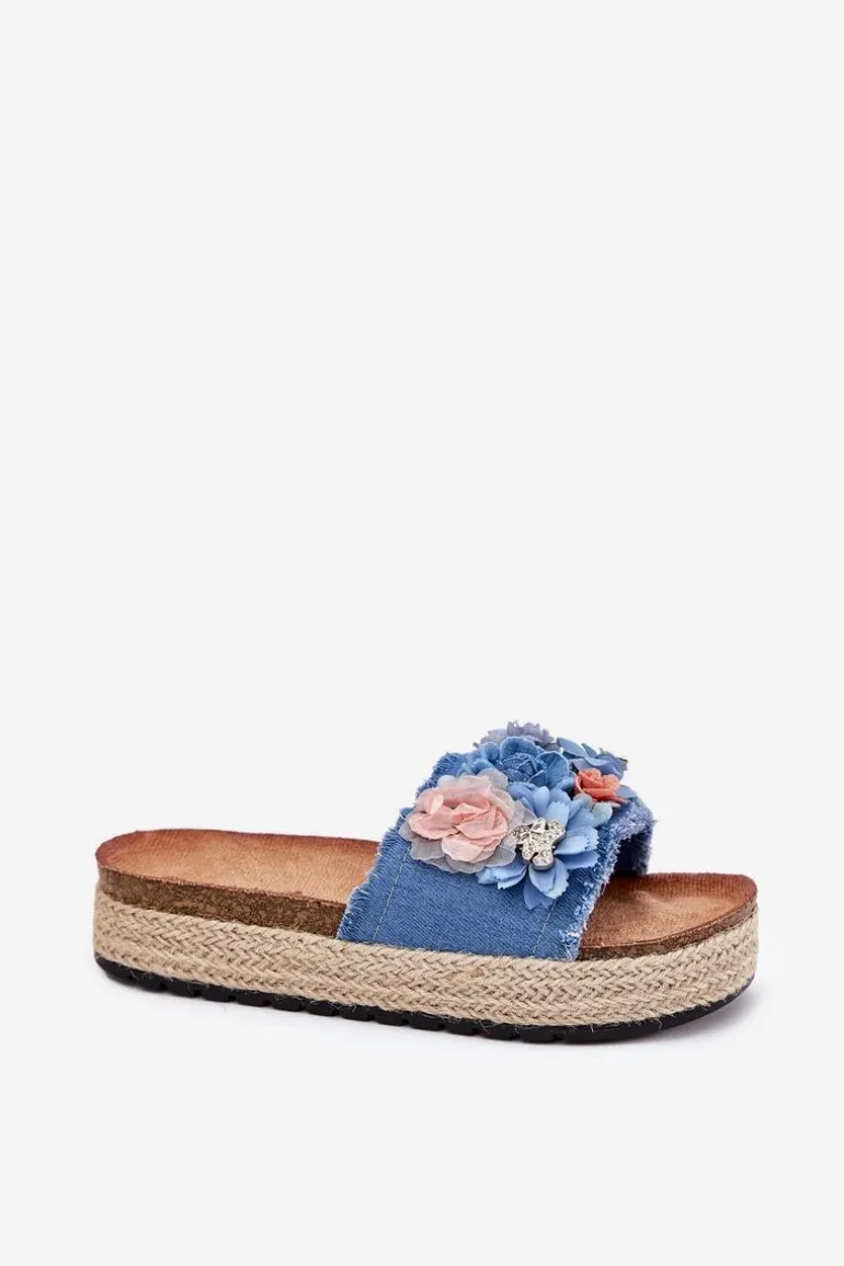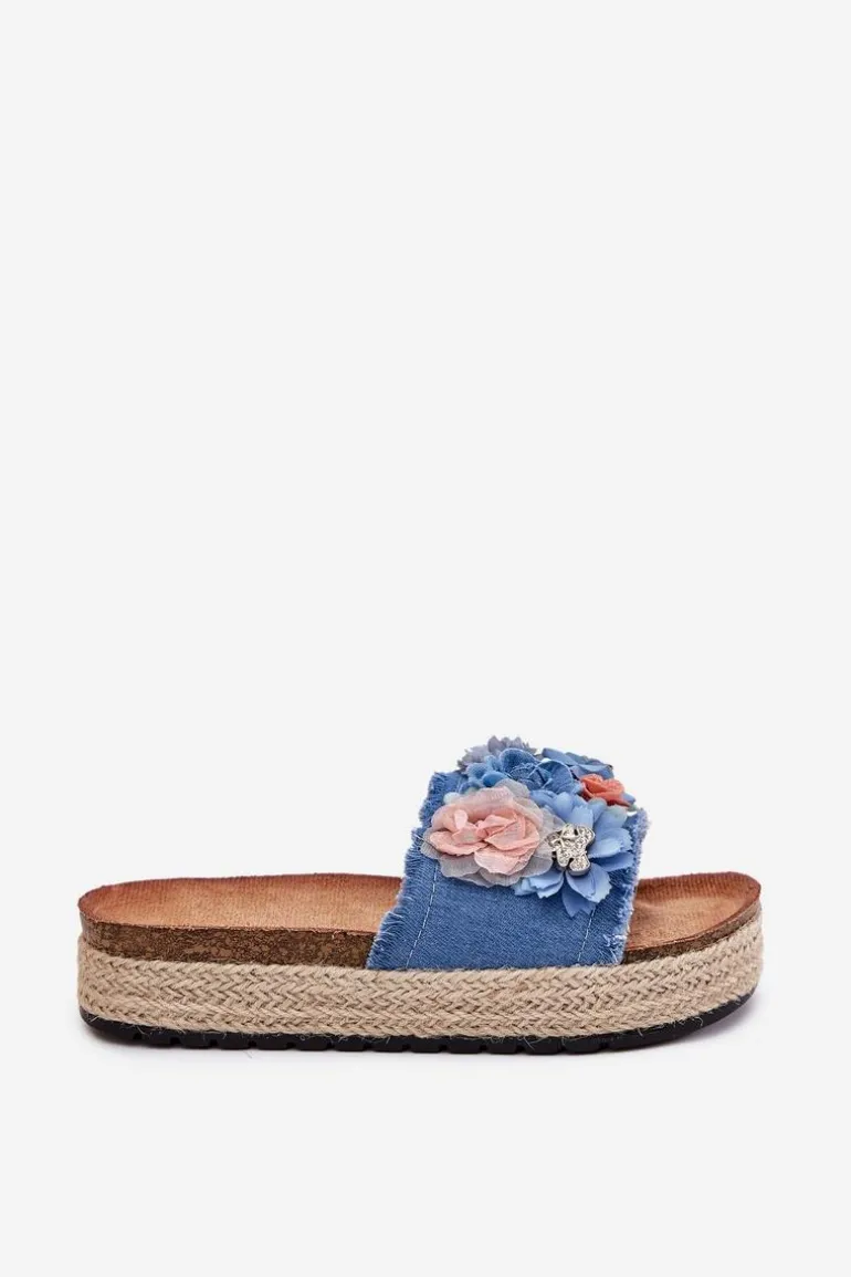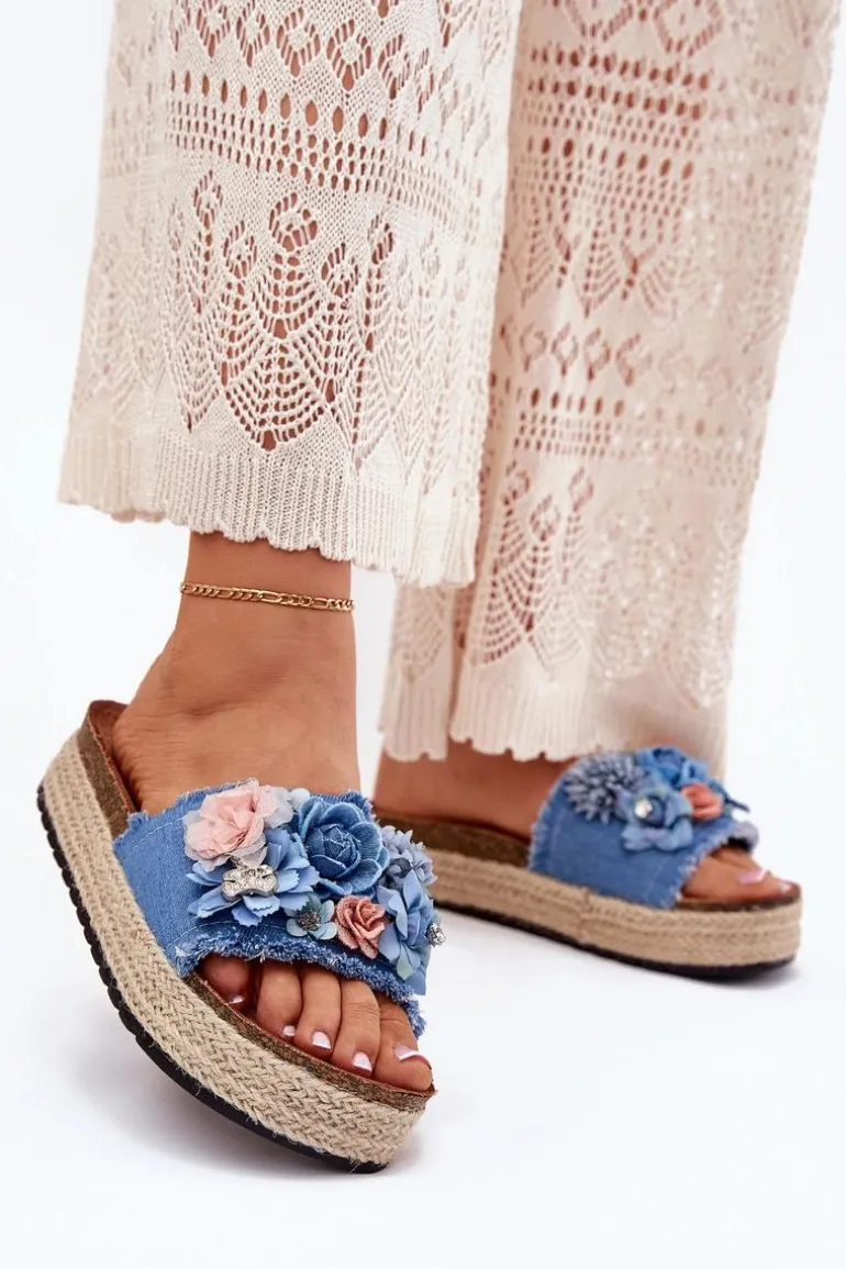 Klapki Damskie Na Platformie Z Plecionką I Kwiatkami Niebieskie Chellia