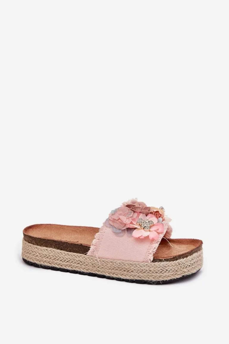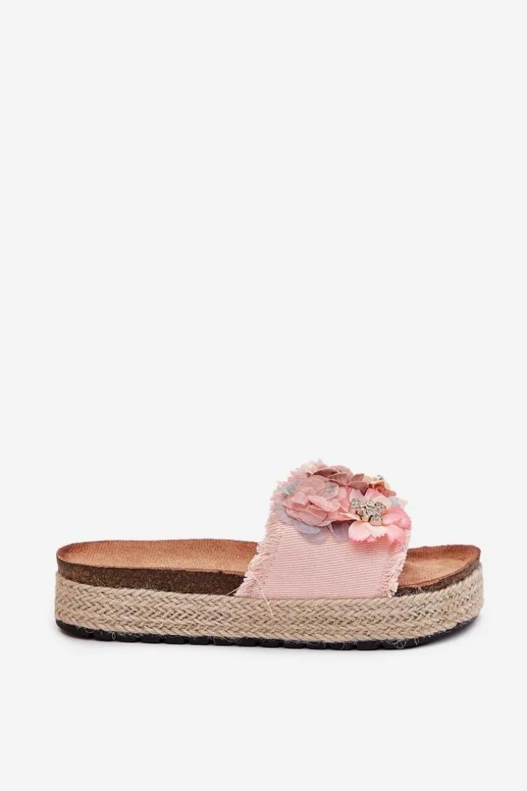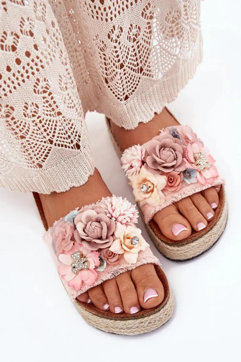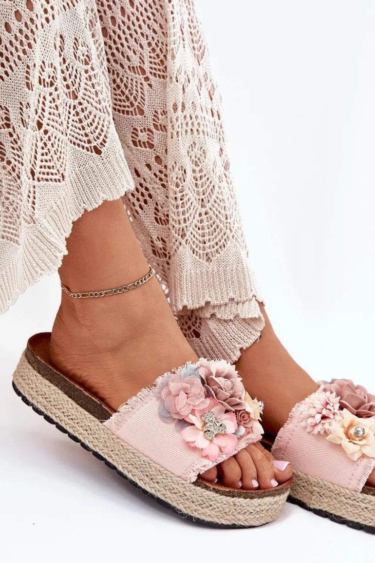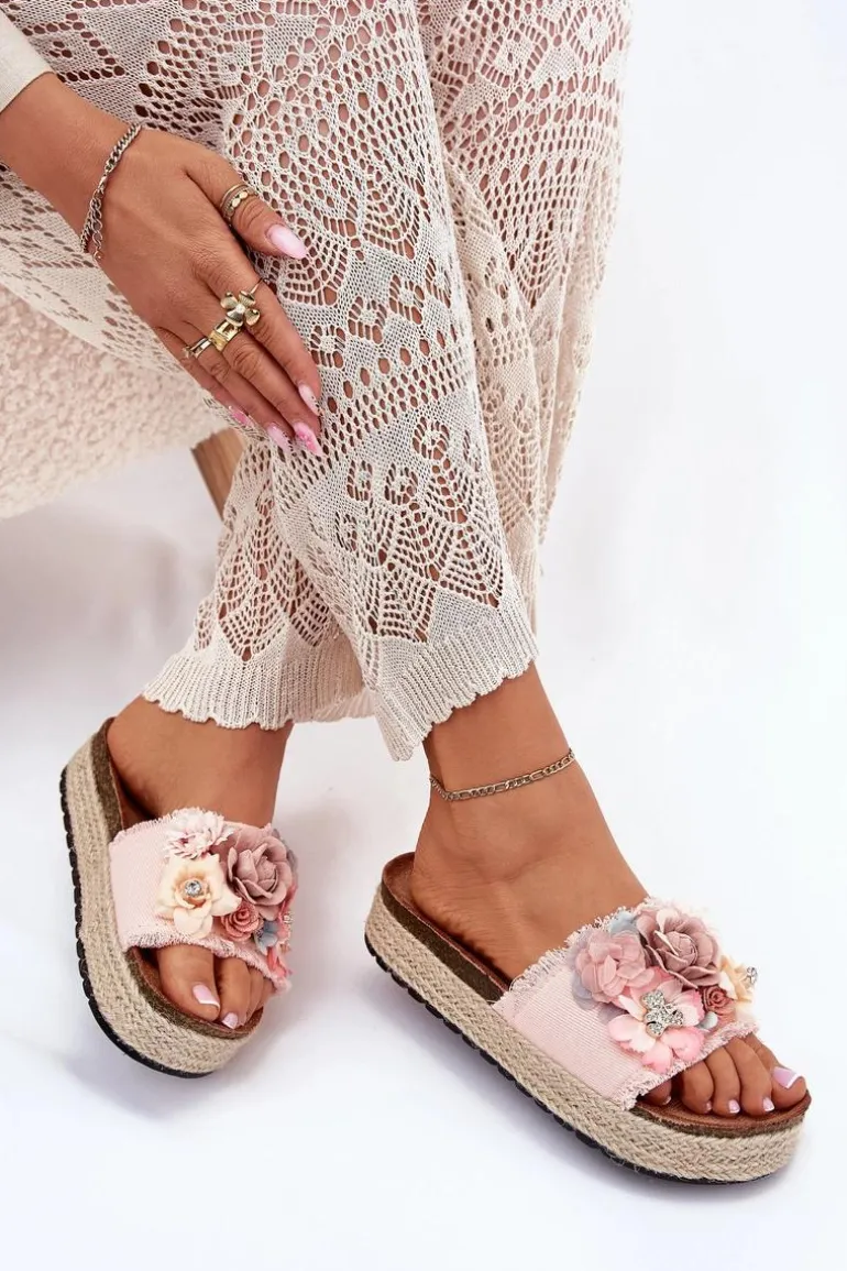 Te damskie klapki ozdobione uroczymi materiałowymi kwiatami i przypinką w formie misia to świetna opcja, która doda unikalnego akcentu do każdej stylizacji. Osadzone na platformie platformie z jutową plecionką, łączą komfort z modnym wyglądem. Dzięki profilowanej eko zamszowej wkładce zapewniają wygodę przez cały dzień. Ten model z pewnością przyciągnie spojrzenia i sprawi, że wyróżnisz się w tłumie! Przy wyborze rozmiaru prosimy sugerować się tabelą rozmiarów.