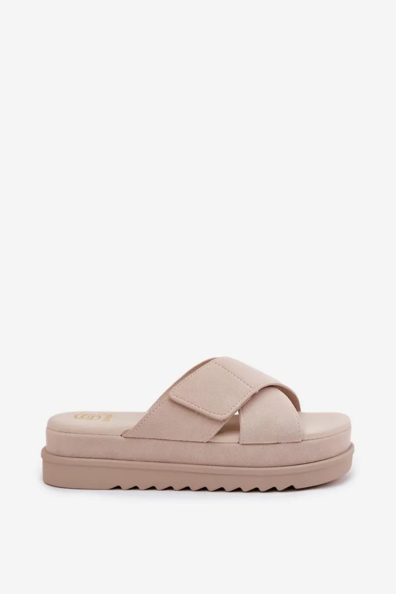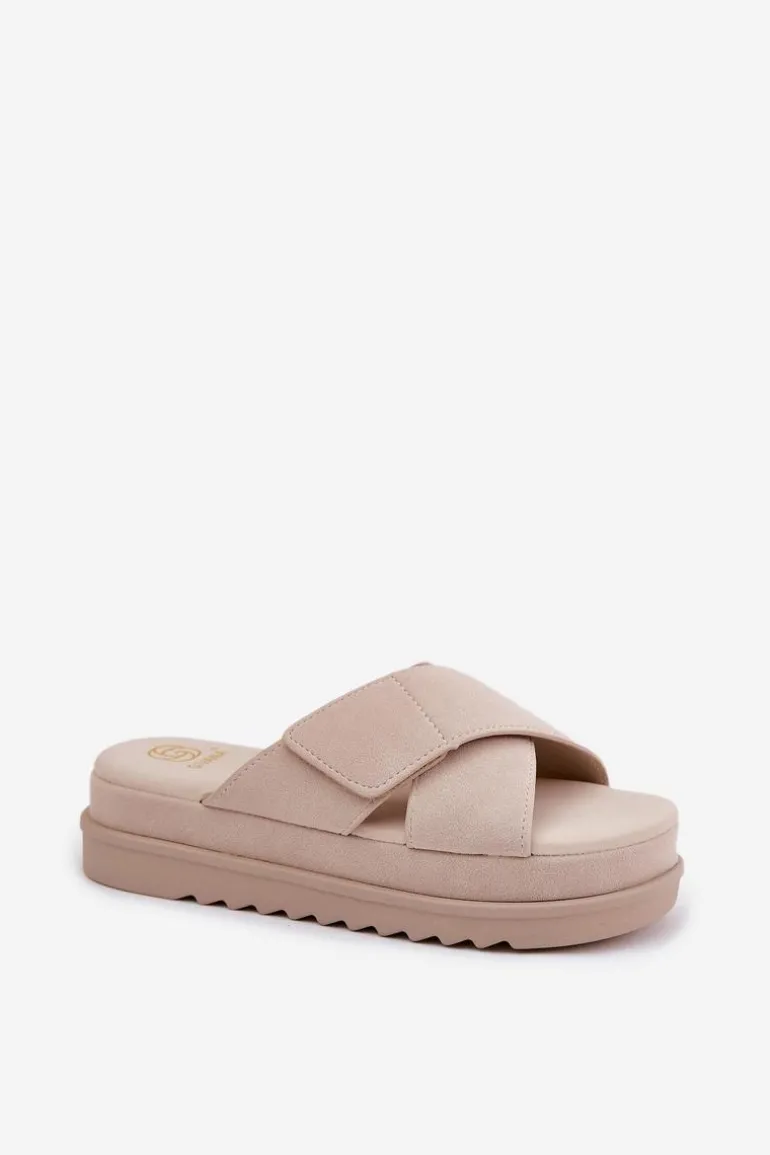 Damskie klapki wykonane z eko zamszu to doskonała propozycja na ciepłe dni. Osadzone na platformie, zapewniają wygodę i stabilność przez cały dzień. Z przodu znajdują się dwa przeplatające się paski, z których jeden posiada rzep, umożliwiający łatwe dopasowanie do stopy. Te klapki to połączenie komfortu z modnym wyglądem, idealne do letnich stylizacji. Przy wyborze rozmiaru prosimy sugerować się tabelą rozmiarów.