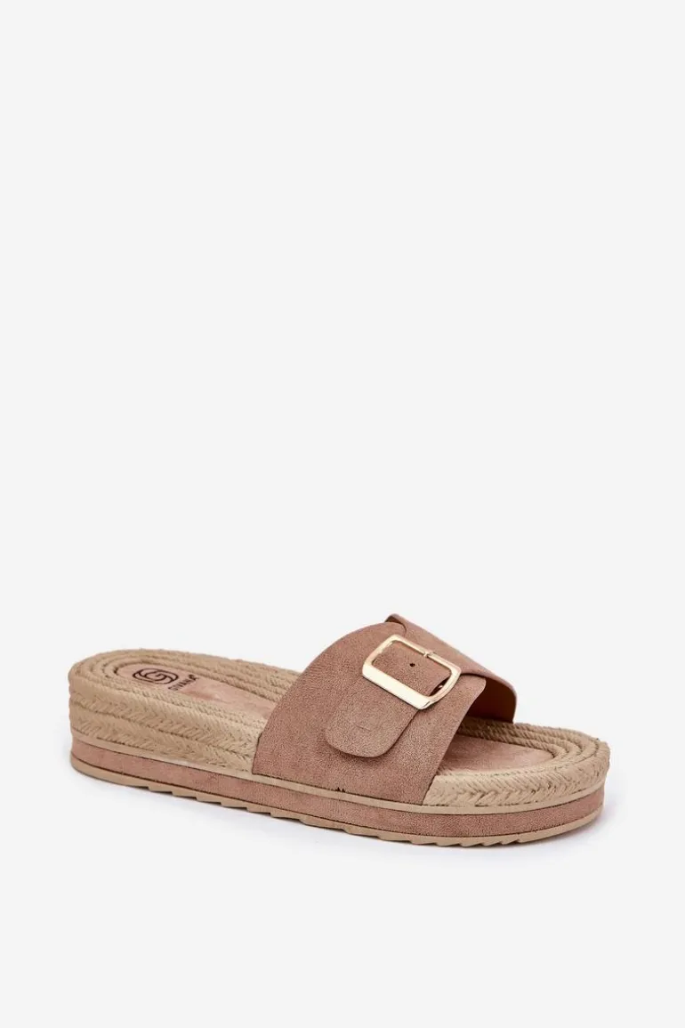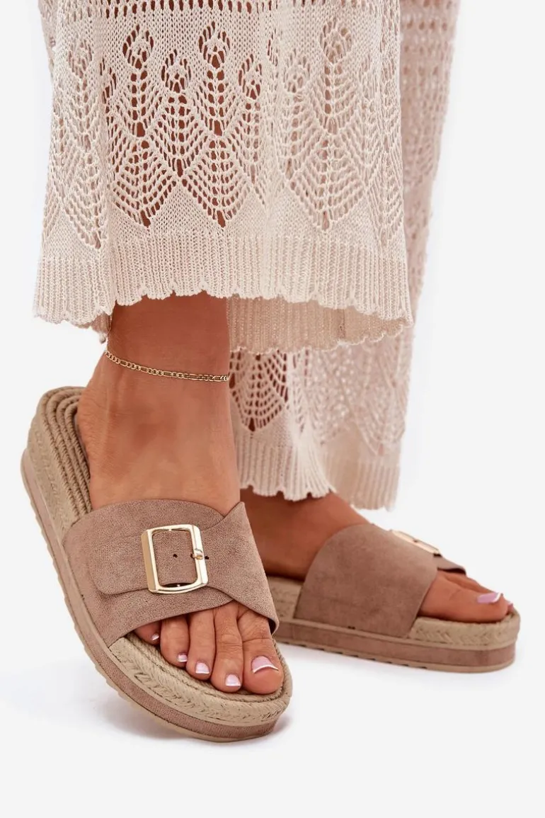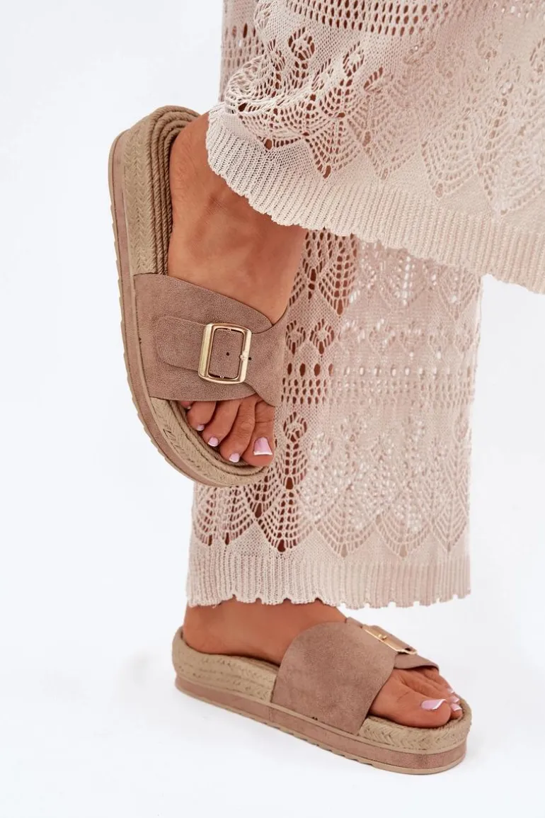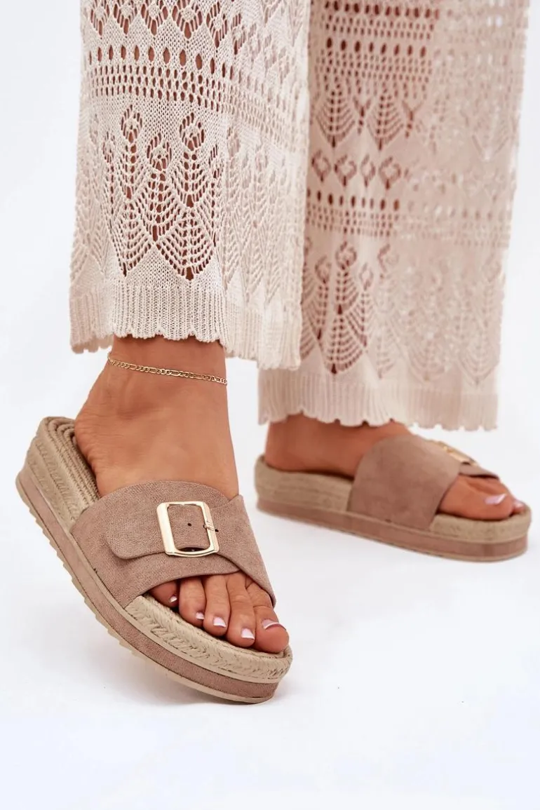 Klapki Damskie Na Platformie Ze Złotą Klamrą Ciemnobeżowe Selira