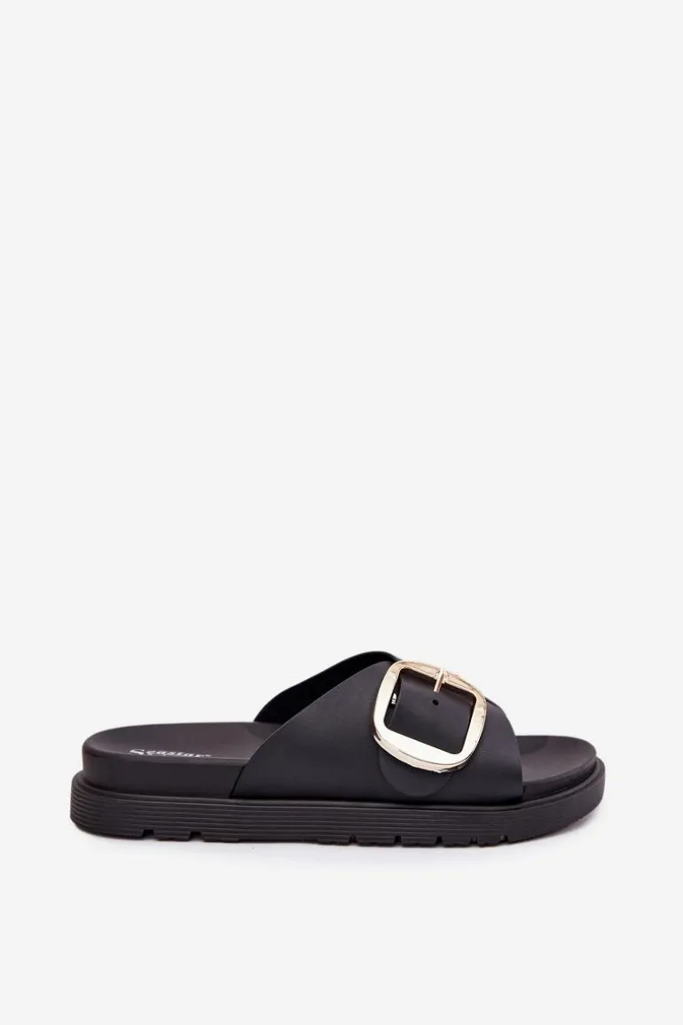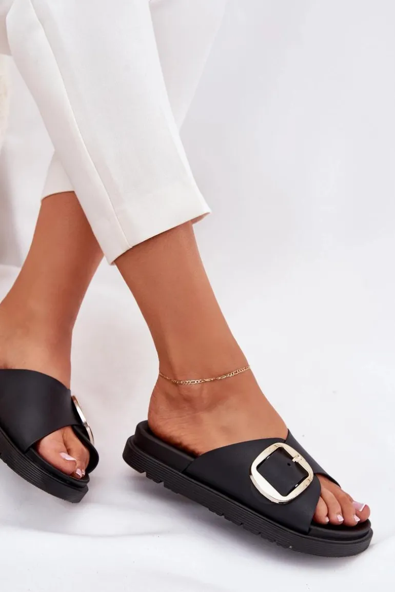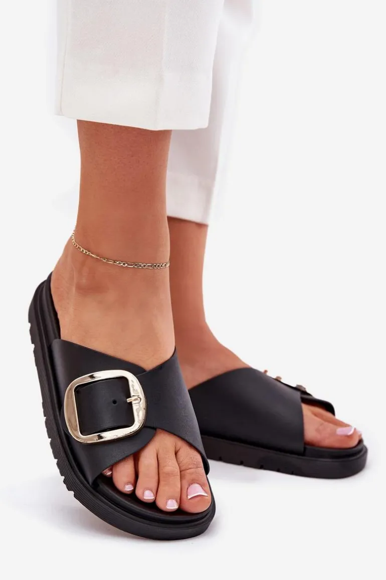 Klapki damskie wykonane z gumowego tworzywa. Osadzone na platformie. Duża złota klamra dodaje im elegancji i wyróżnia je spośród innych modeli. Idealne na co dzień, doskonale komponują się z letnimi stylizacjami, zapewniając wygodę i modny wygląd. Przy wyborze rozmiaru rosimy sugerować się tabelą rozmiarów.