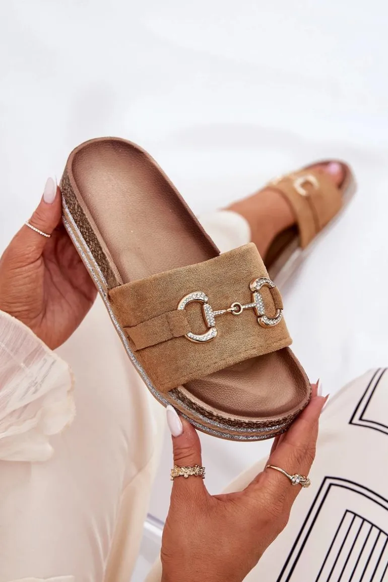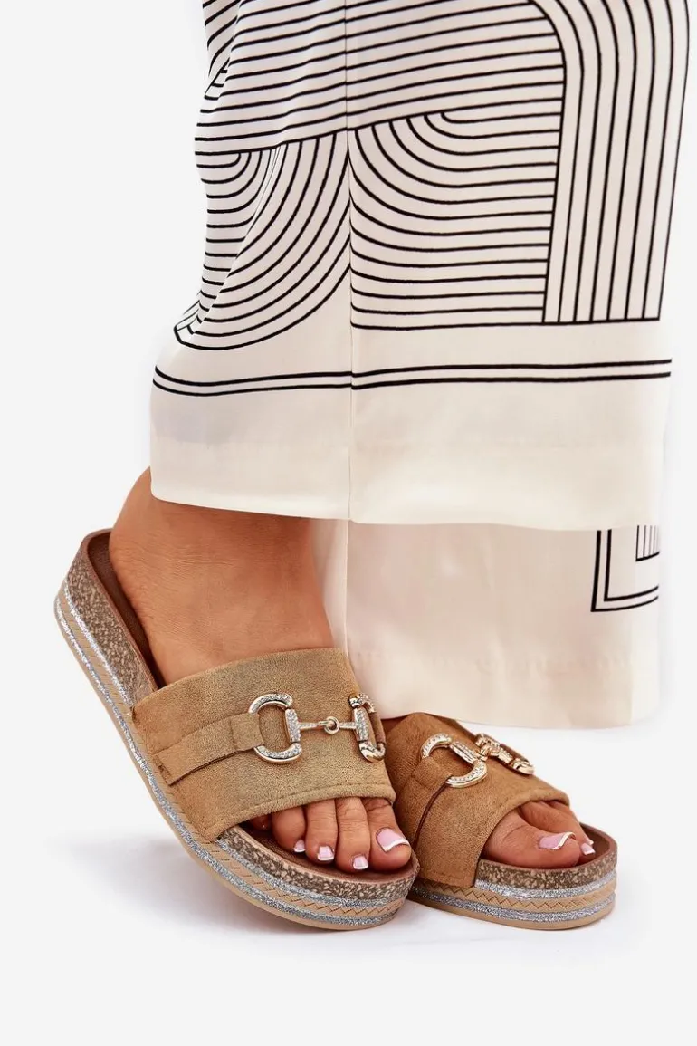 Klapki wykonane z eko zamszu. Z przodu ozdobny złoty detal, który nadaje im subtelnego blasku. Osadzone na platformie ozdobionej brokatem, które wprowadzają odrobinę glamour do każdej stylizacji. Profilowana wkładka zapewnia wygodę przez cały dzień. Idealne na letnie dni, te klapki doskonale pasują do sukienek, spódnic czy spodni, łącząc modny wygląd z funkcjonalnością. Przy wyborze rozmiaru rosimy sugerować się tabelą rozmiarów.