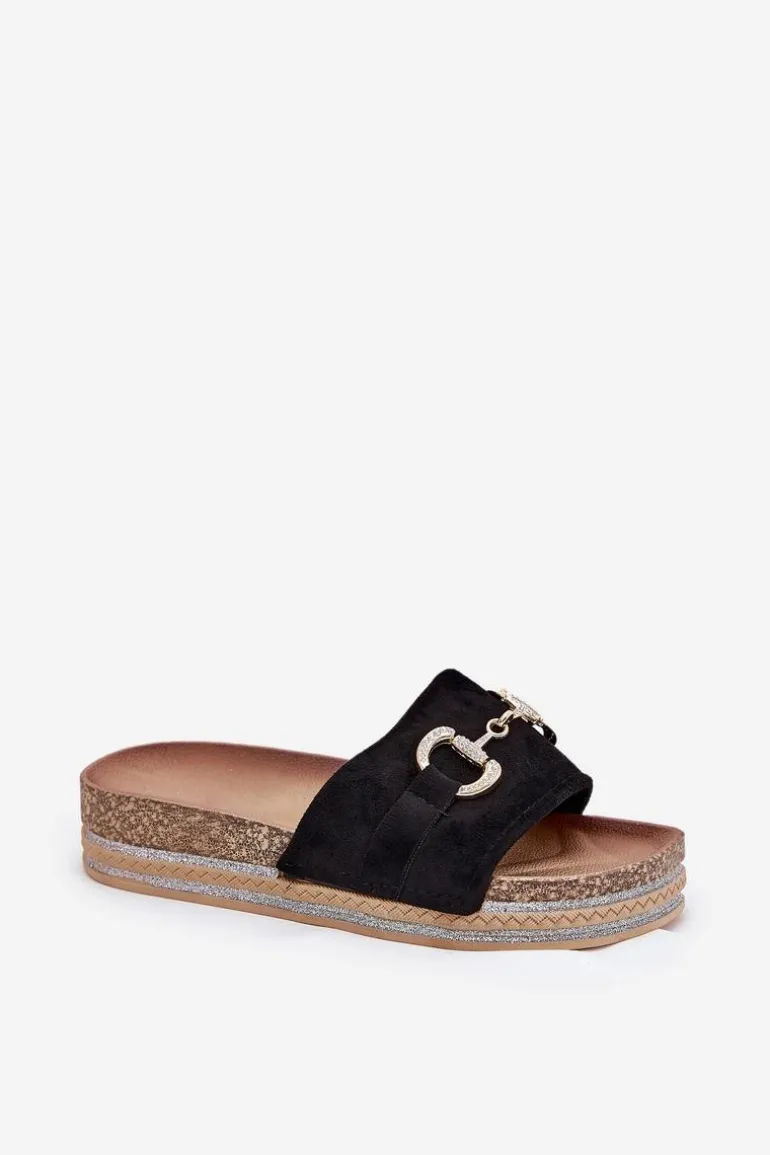 Klapki wykonane z eko zamszu. Z przodu ozdobny złoty detal, który nadaje im subtelnego blasku. Osadzone na platformie ozdobionej brokatem, które wprowadzają odrobinę glamour do każdej stylizacji. Profilowana wkładka zapewnia wygodę przez cały dzień. Idealne na letnie dni, te klapki doskonale pasują do sukienek, spódnic czy spodni, łącząc modny wygląd z funkcjonalnością. Przy wyborze rozmiaru rosimy sugerować się tabelą rozmiarów.