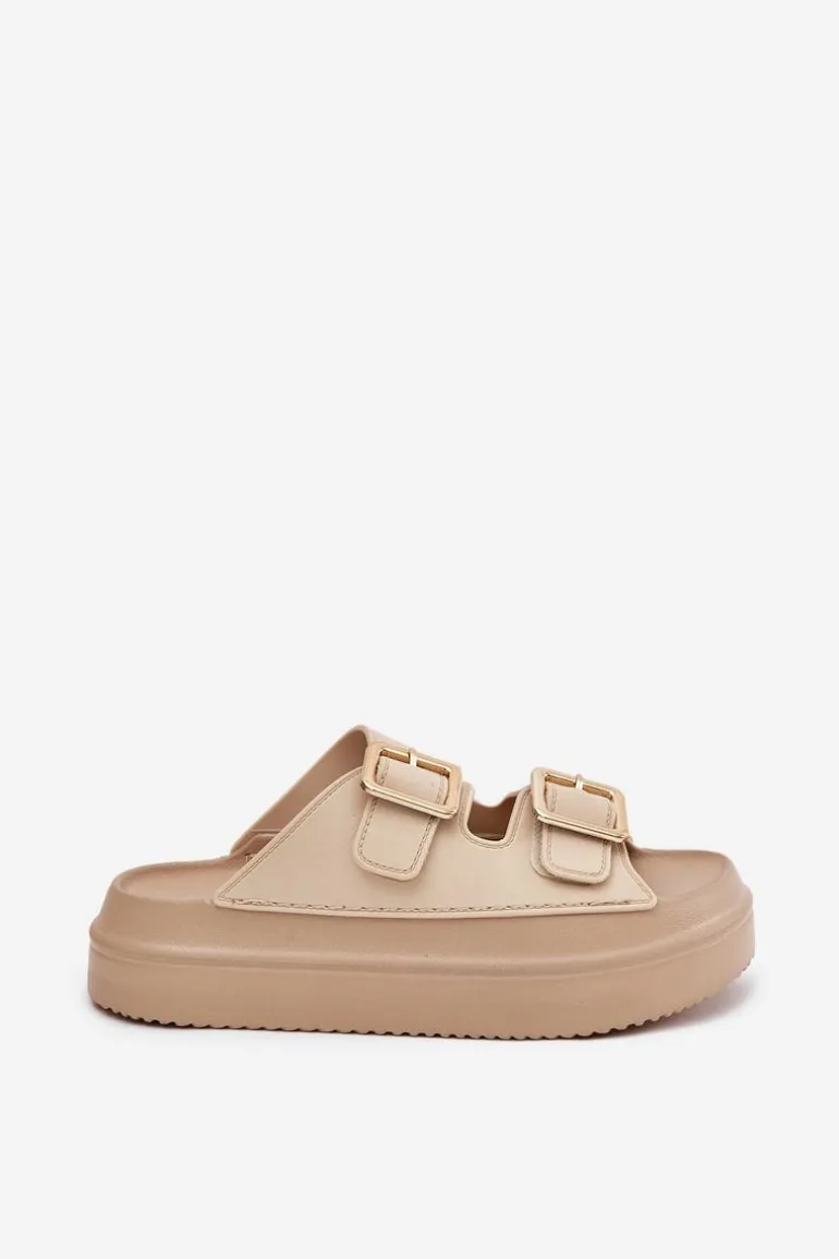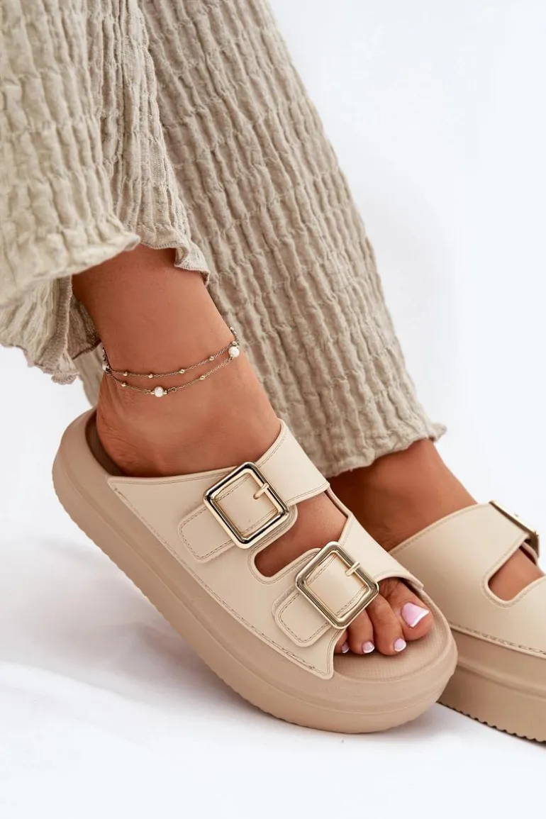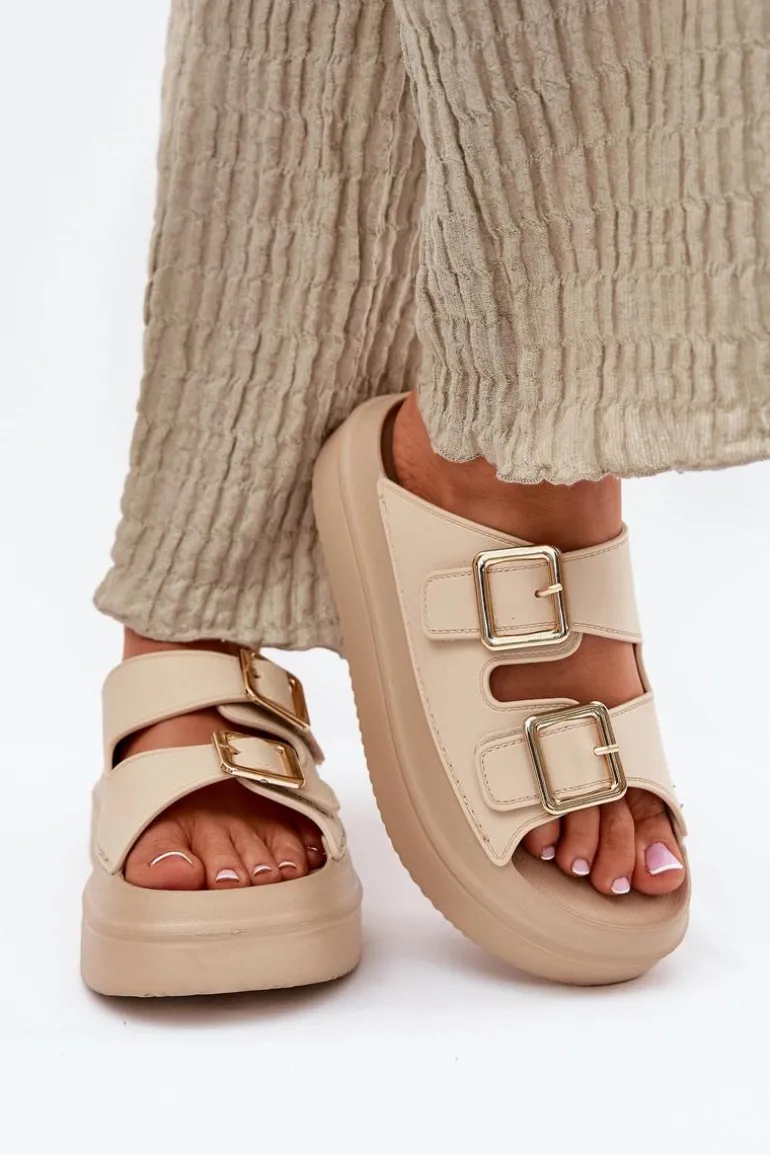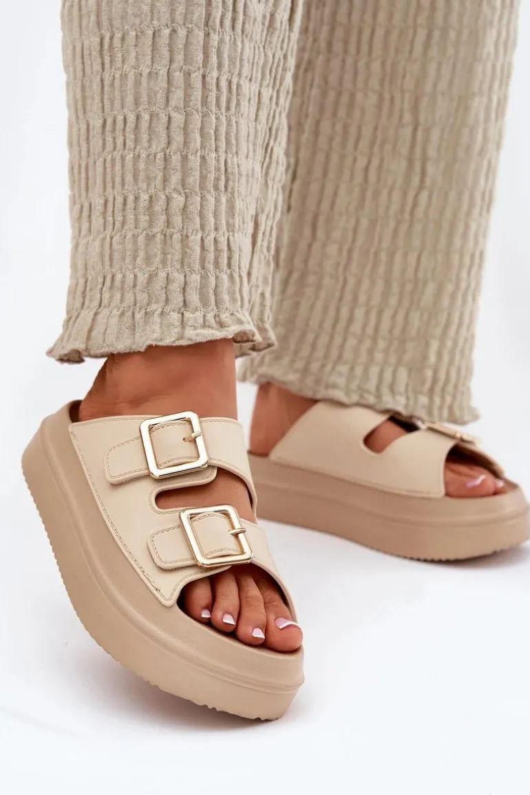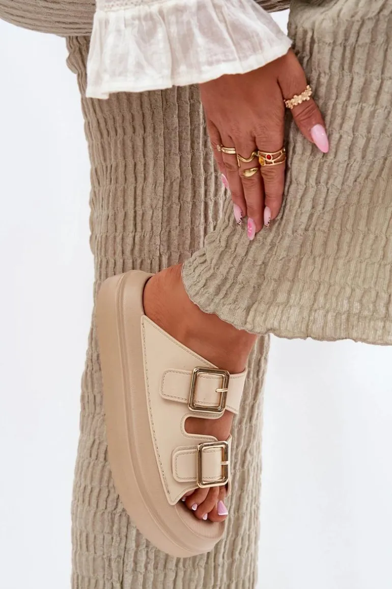 Klapki Damskie Na Platformie Ze Złotymi Klamrami Beżowe Zorila