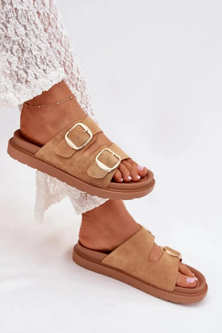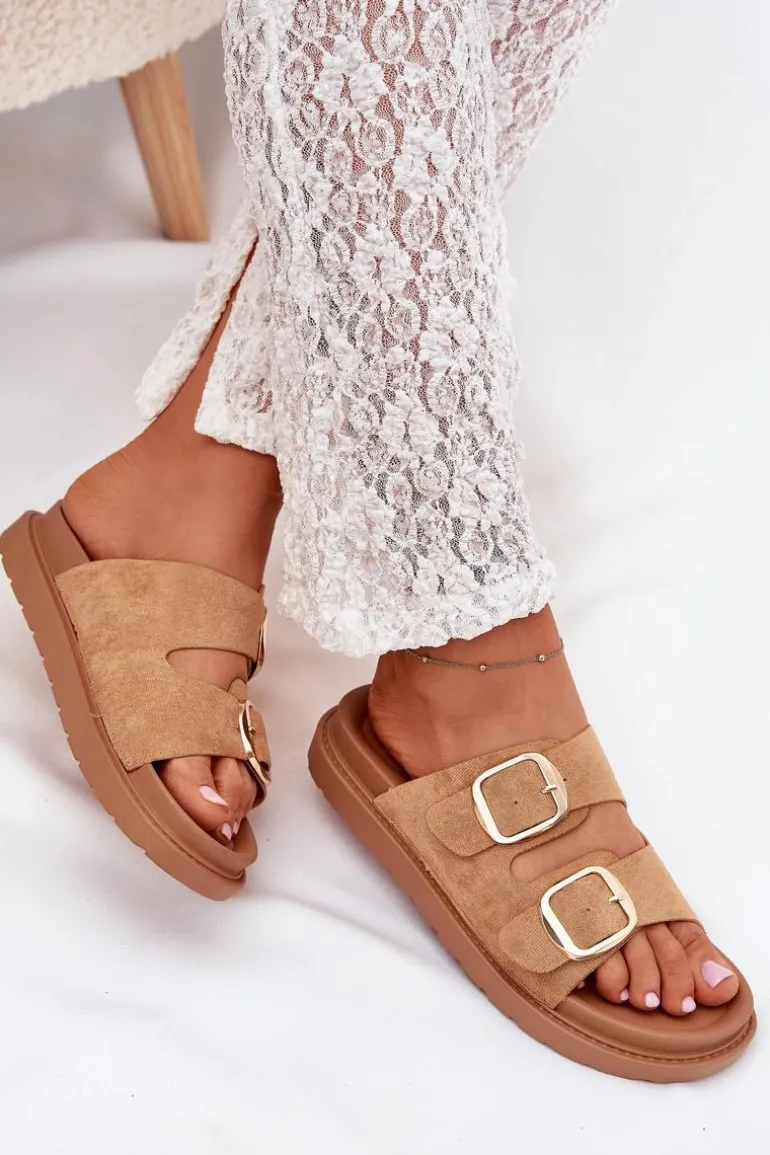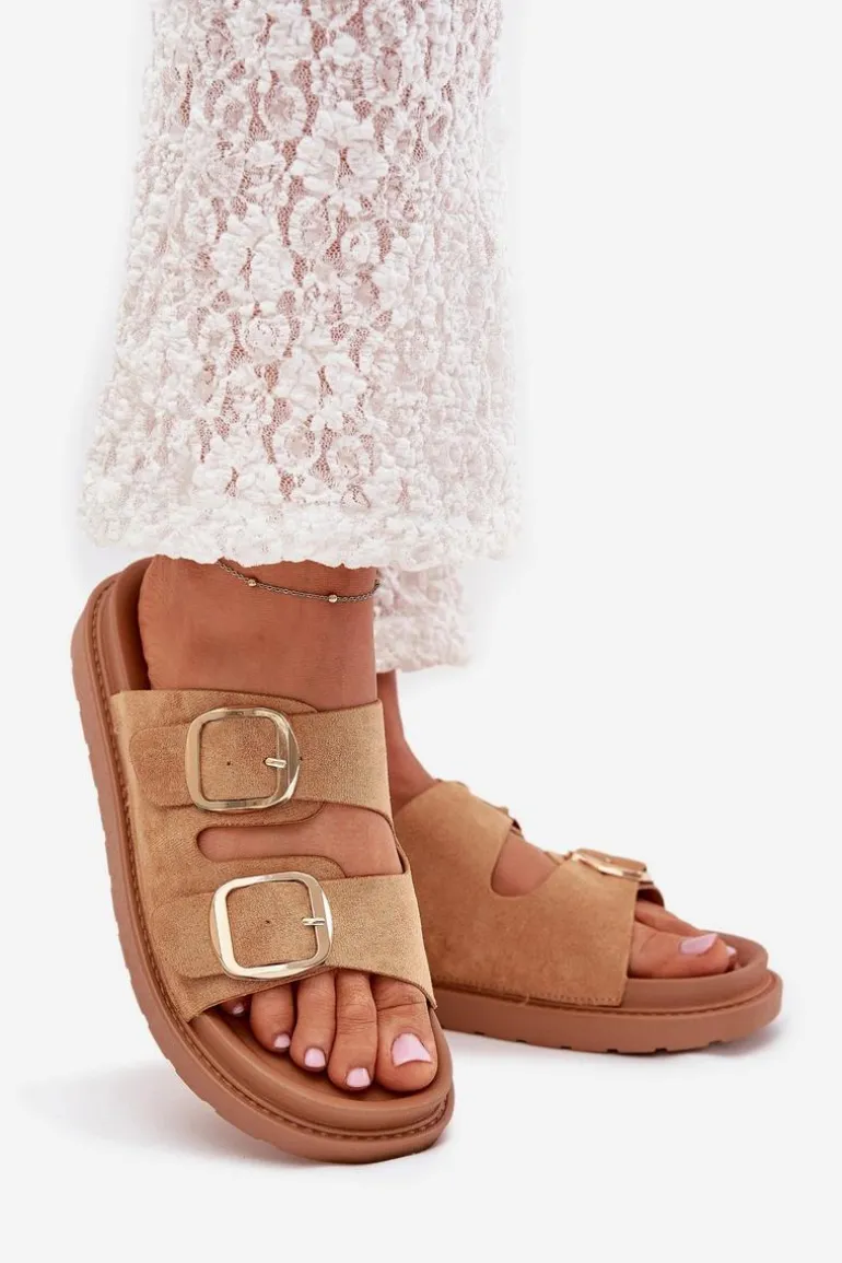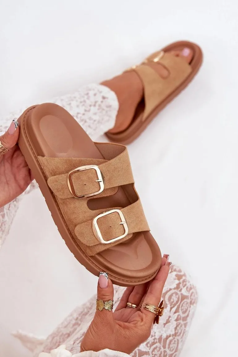 Klapki damskie wykonane z eko zamszu. Osadzone na platformie. Dwa regulowane paski ze złotymi klamrami zapewniają idealne dopasowanie, a profilowana wkładka gwarantuje komfort przez cały dzień. Idealne na codzienne wyjścia. Przy wyborze rozmiaru rosimy sugerować się tabelą rozmiarów.