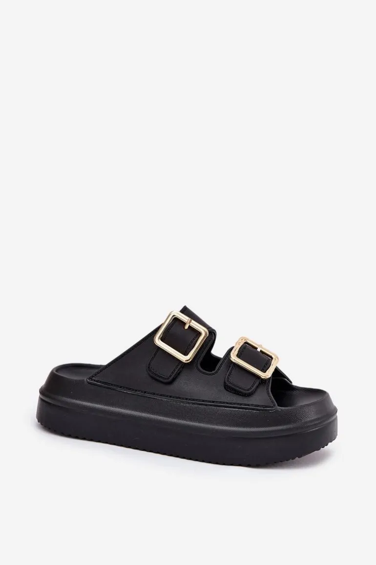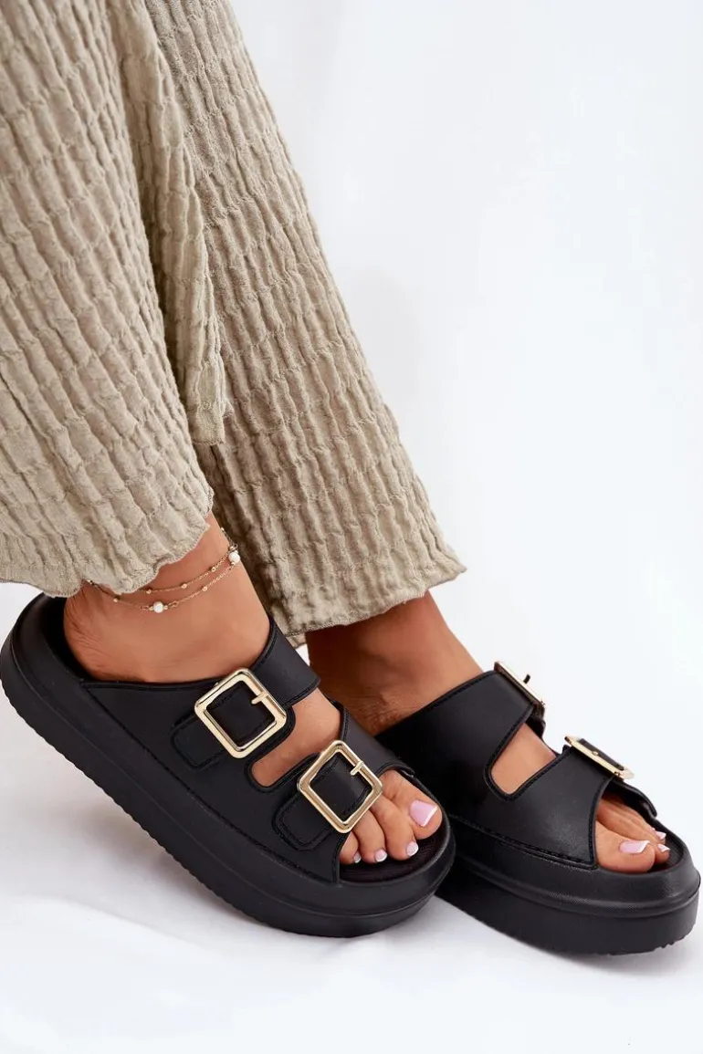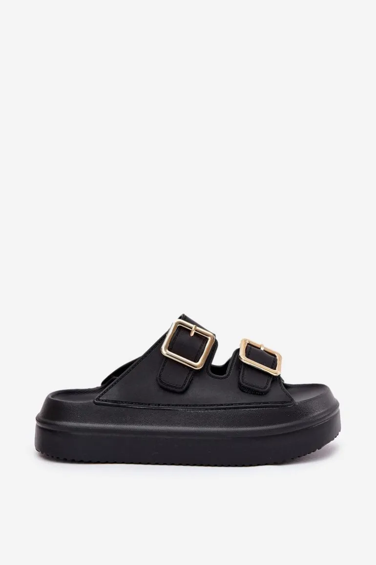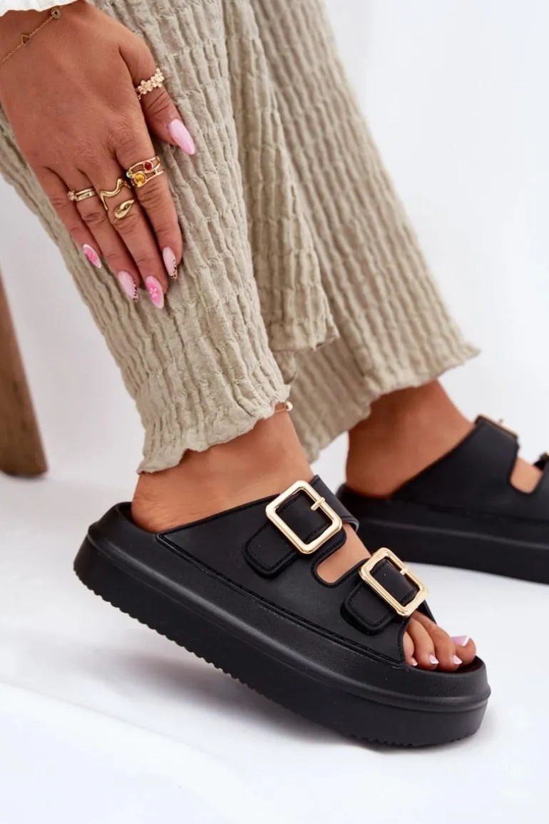 Klapki Damskie Na Platformie Ze Złotymi Klamrami Czarne Zorila