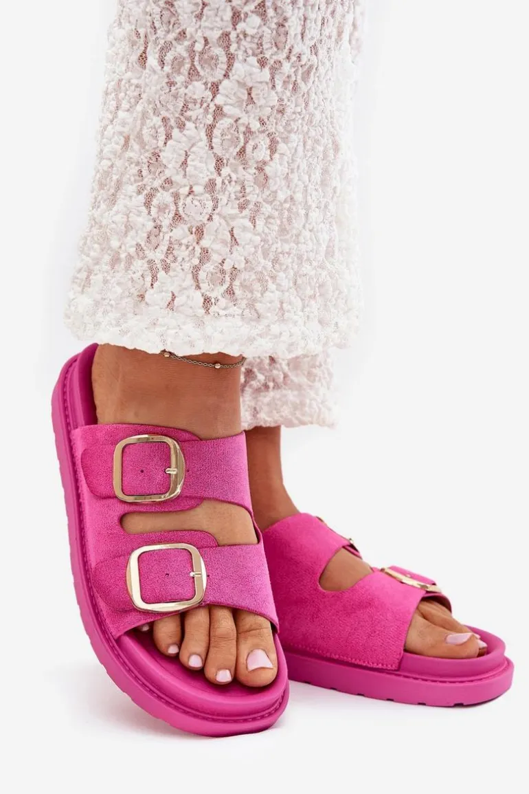 Klapki damskie wykonane z eko zamszu. Osadzone na platformie. Dwa regulowane paski ze złotymi klamrami zapewniają idealne dopasowanie, a profilowana wkładka gwarantuje komfort przez cały dzień. Idealne na codzienne wyjścia. Przy wyborze rozmiaru rosimy sugerować się tabelą rozmiarów.