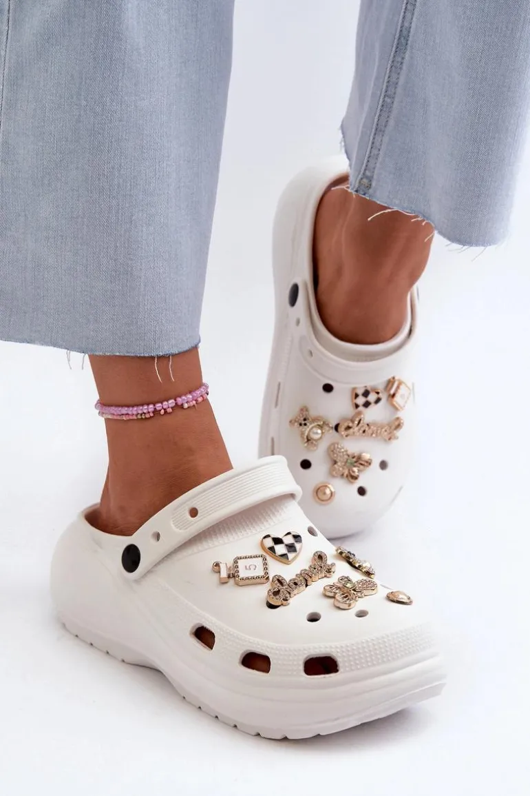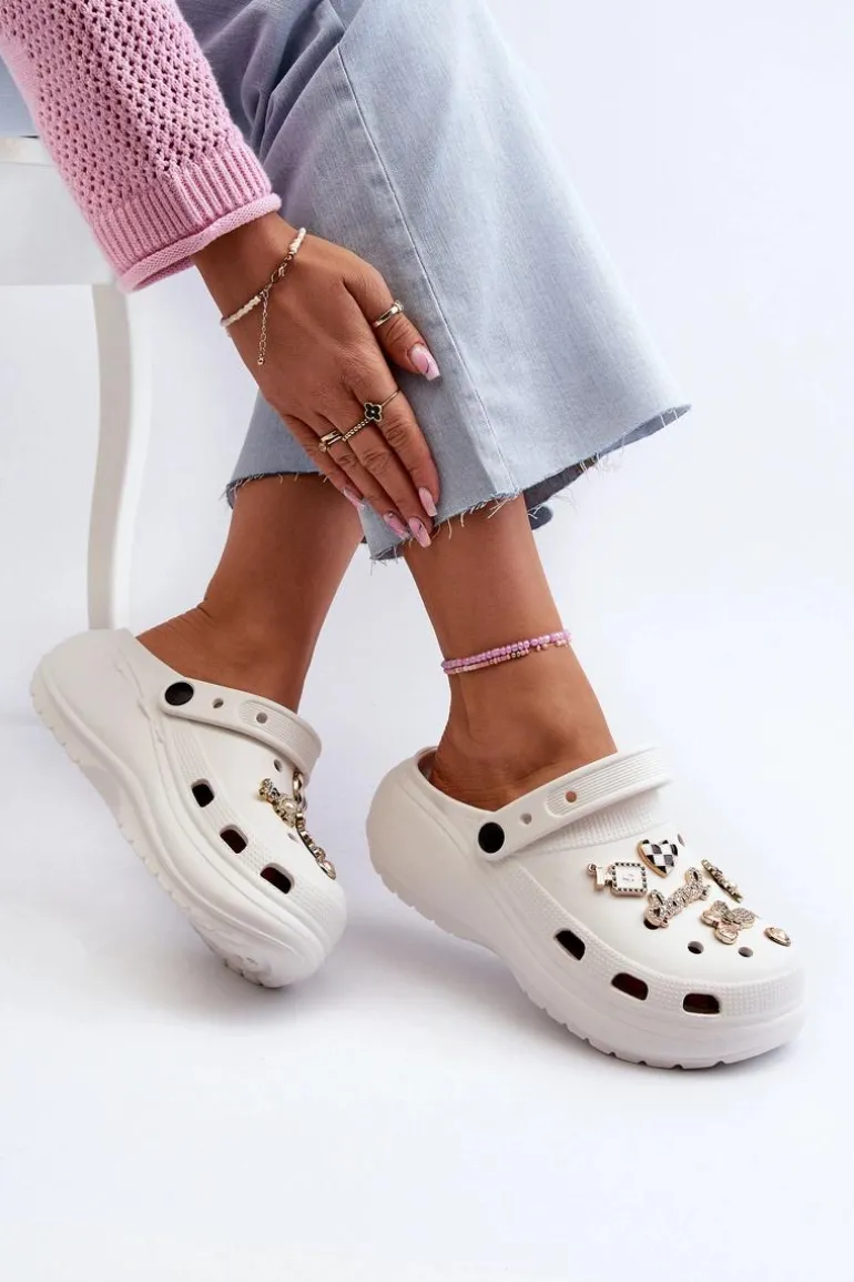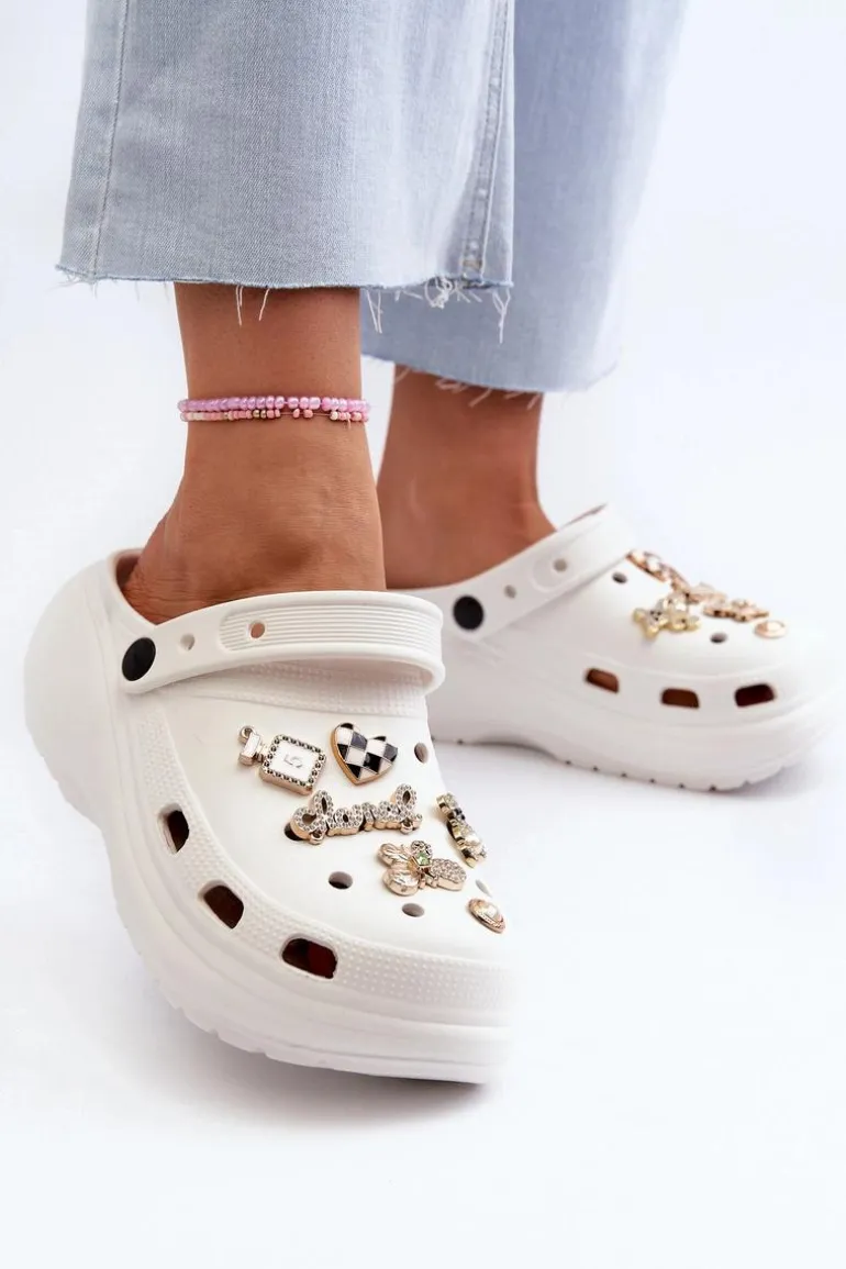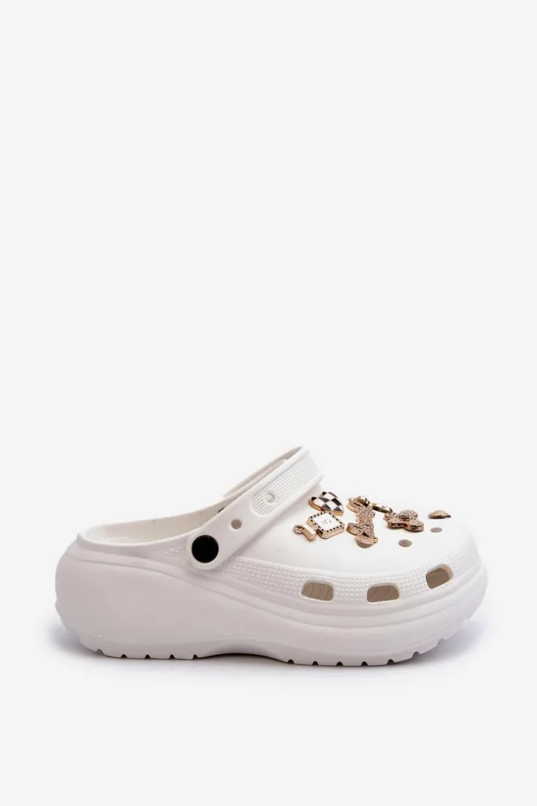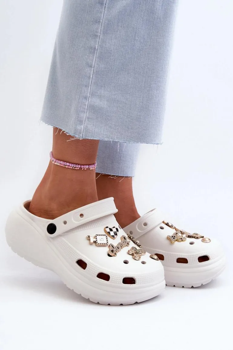 Klapki Damskie Piankowe Lekkie Na Grubej Podeszwie Z Przypinkami Białe Effiora