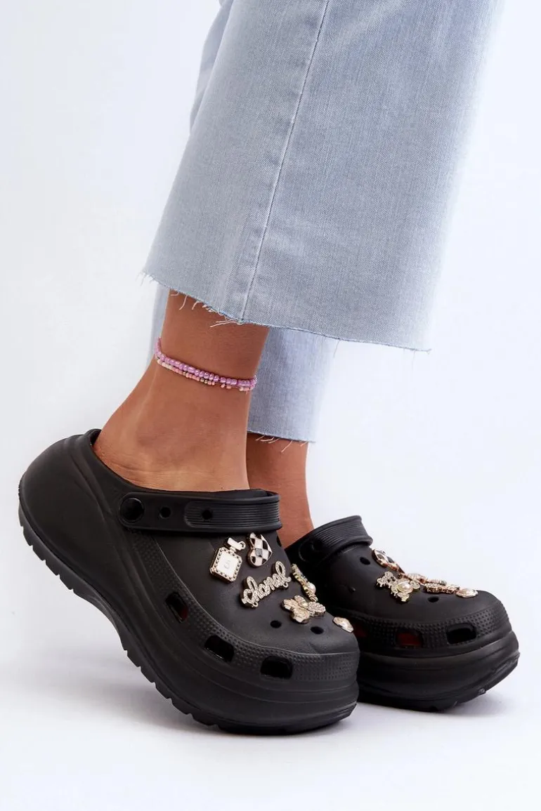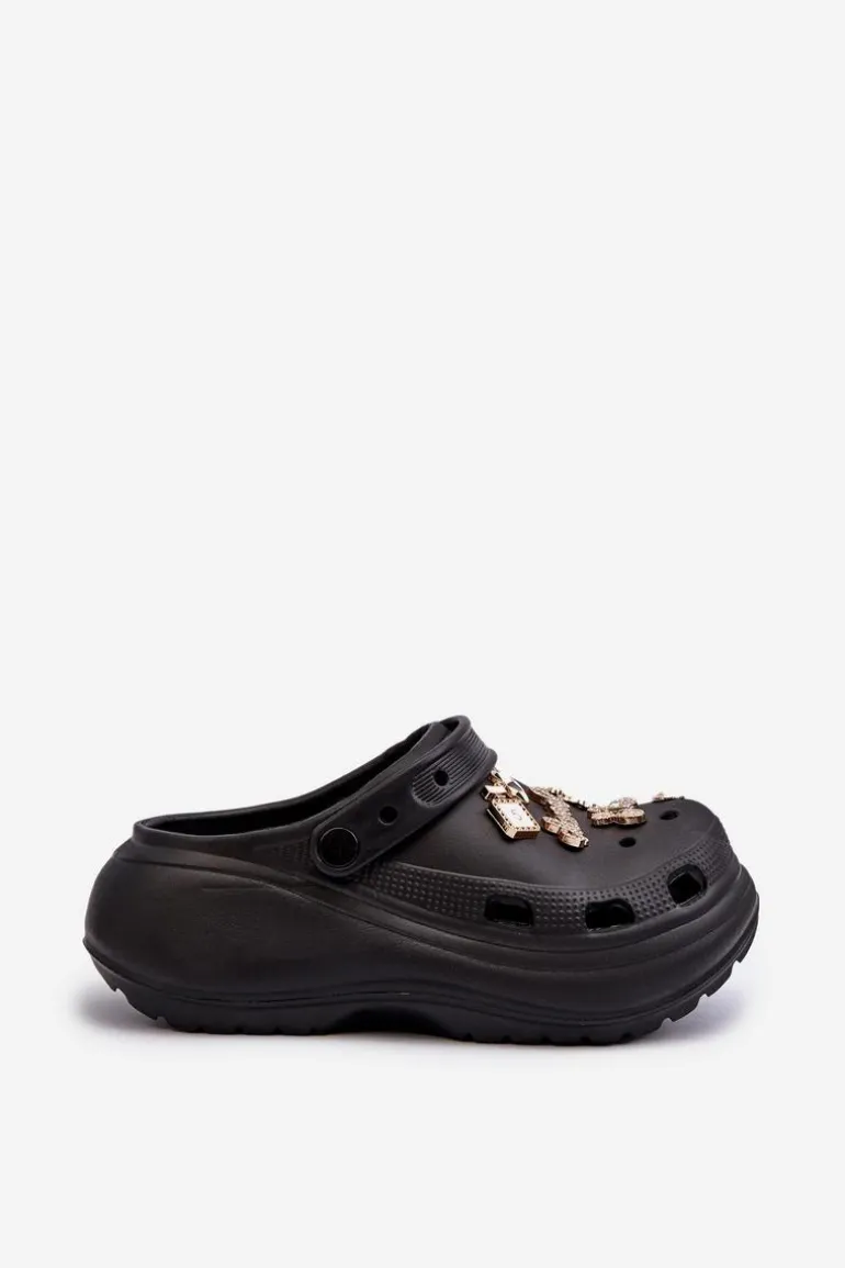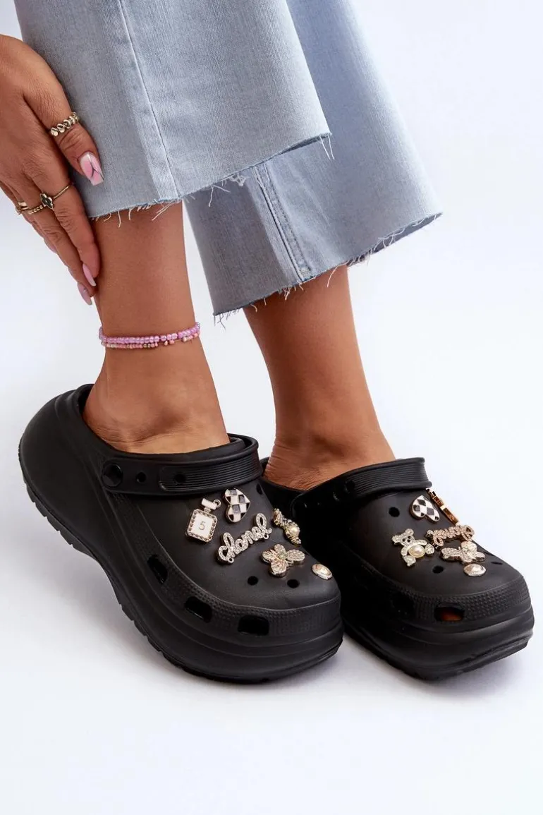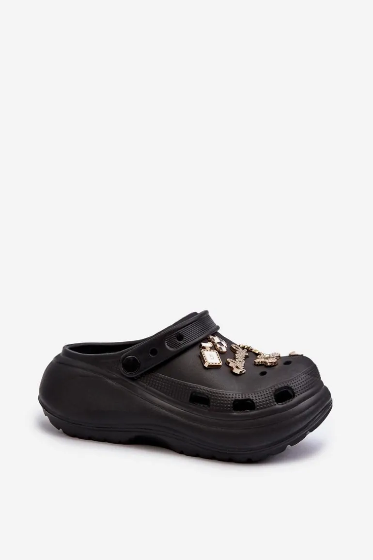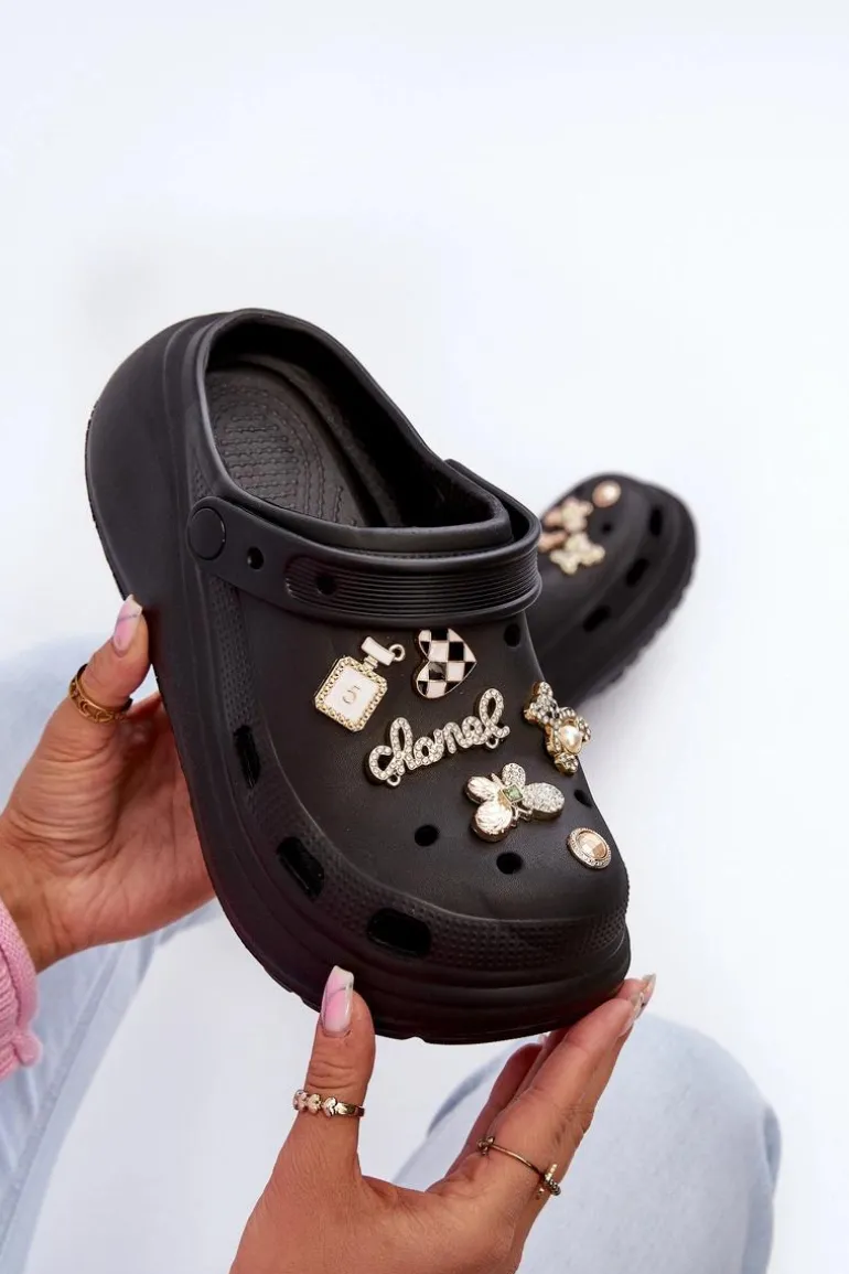 Klapki Damskie Piankowe Lekkie Na Grubej Podeszwie Z Przypinkami Czarne Effiora