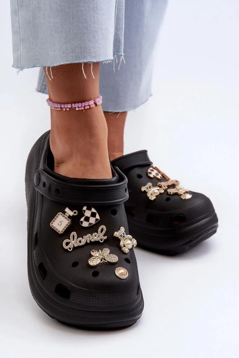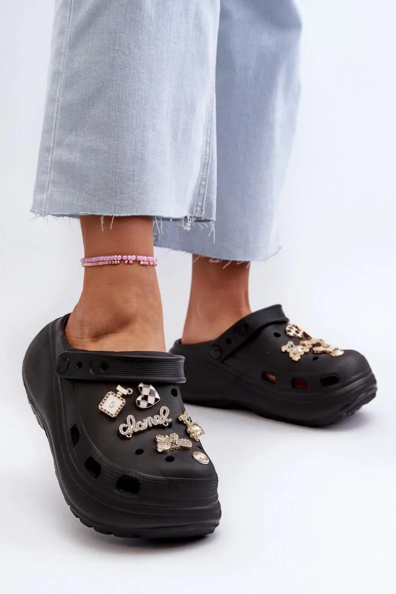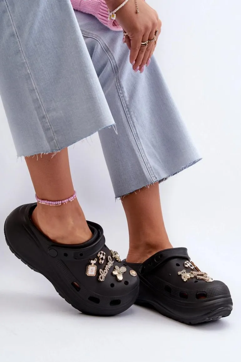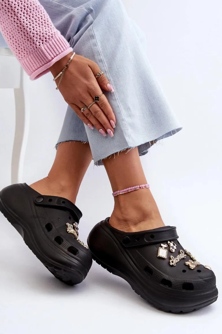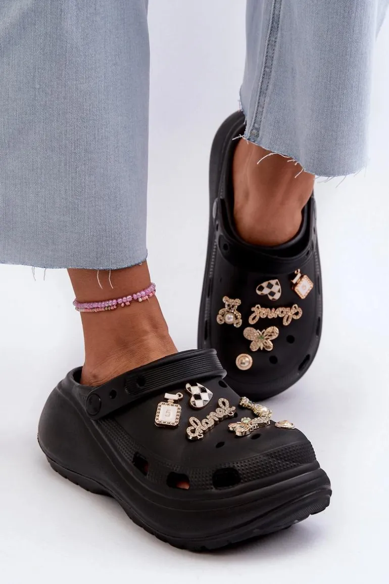 Klapki Damskie Piankowe Lekkie Na Grubej Podeszwie Z Przypinkami Czarne Effiora