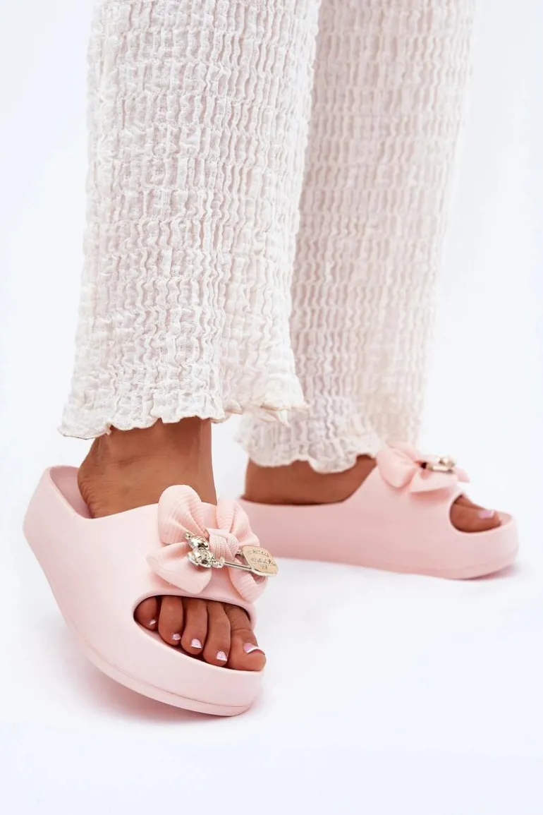 Klapki Damskie Piankowe Na Platformie Z Kokardką I Broszką Różowe Marlize