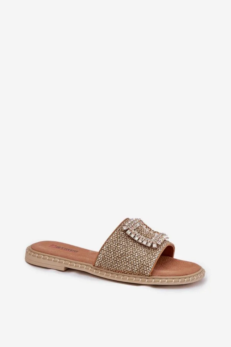 Klapki damskie od marki Artiker to doskonała propozycja na ciepłe dni. Osadzone na płaskim obcasie, zapewniają wygodę przez cały dzień. Pasek ozdobiony plecionką oraz błyszczącą broszką nadają subtelnego blasku i wyjątkowego charakteru. Miękka wkładka z naturalnej skóry zapewnia komfort i dopasowanie do stopy. Idealne do codziennych stylizacji. Przy wyborze rozmiaru prosimy sugerować się tabelą rozmiarów.