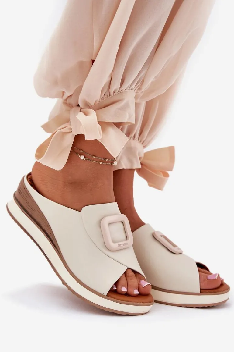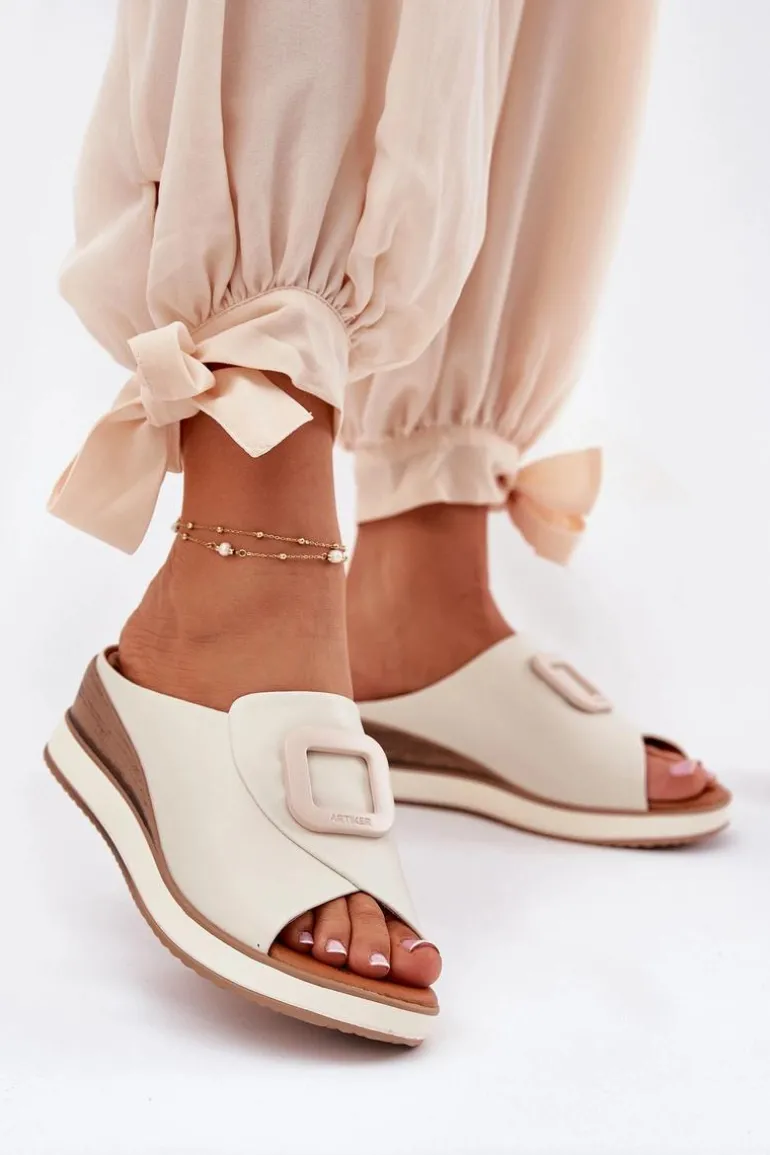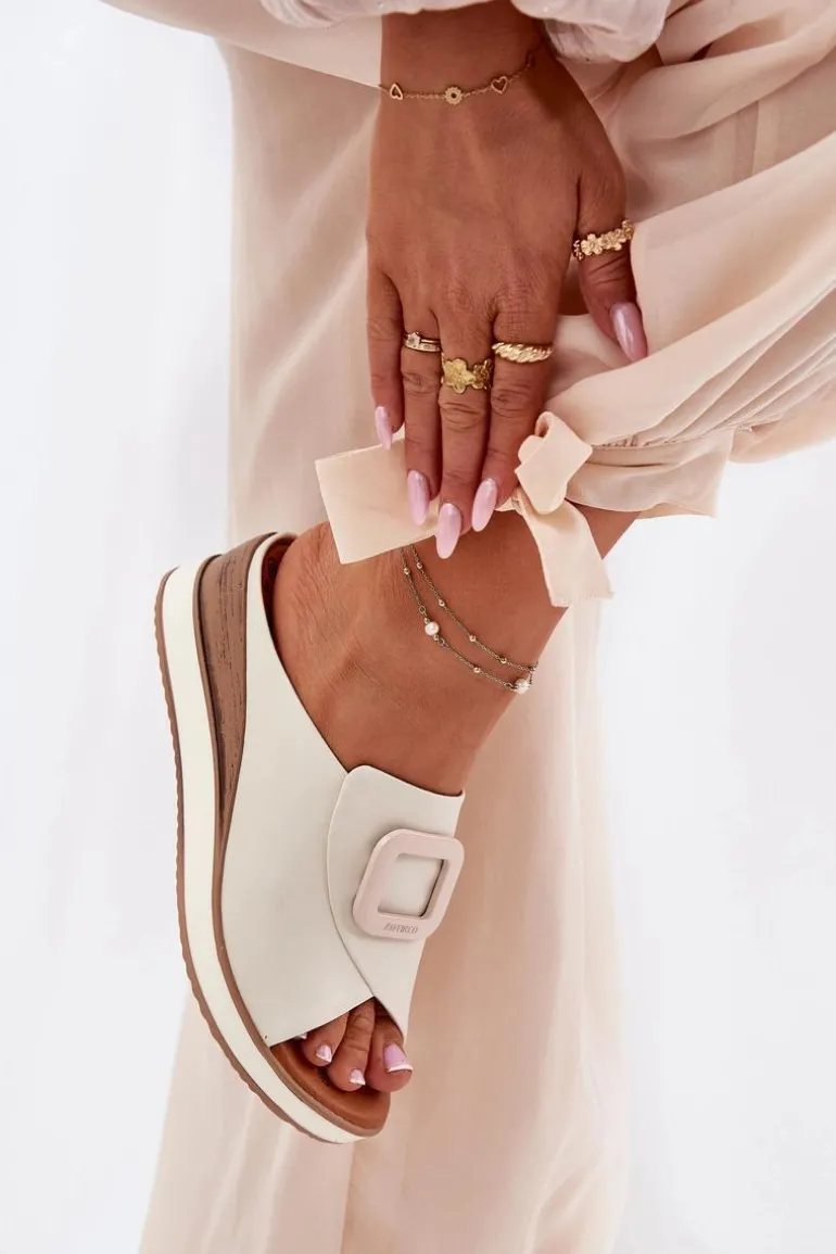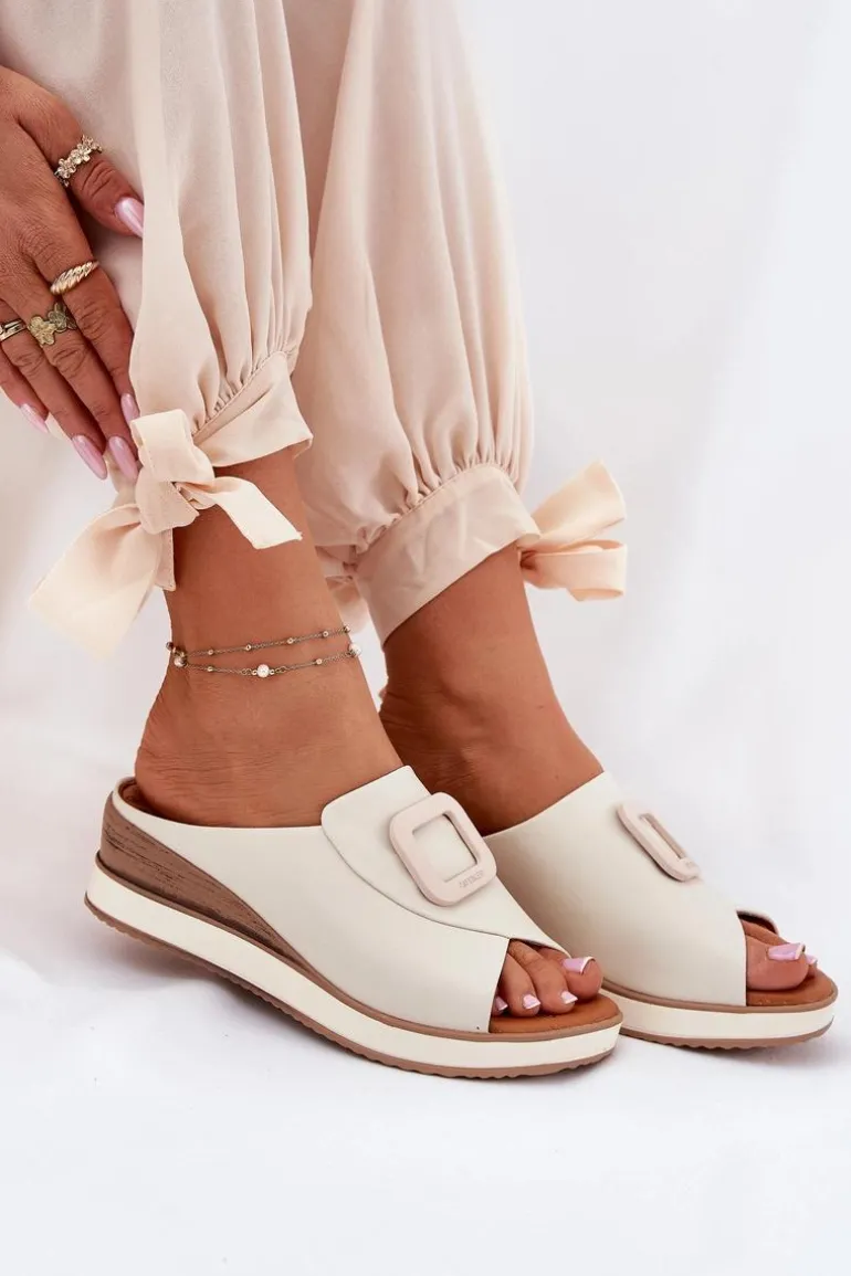 Damskie klapki wykonane z naturalnej skóry to elegancka propozycja na cieplejsze dni. Osadzone na koturnie, zapewniają stabilność i wygodę przez cały dzień. Z przodu butów znajduje się subtelny ozdobny detal, który nadaje im wyjątkowego charakteru. Miękka wkładka dba o komfort noszenia, a stylowy fason sprawia, że klapki będą doskonałym uzupełnieniem letnich stylizacji. Przy wyborze rozmiaru prosimy sugerować się tabelą rozmiarów.