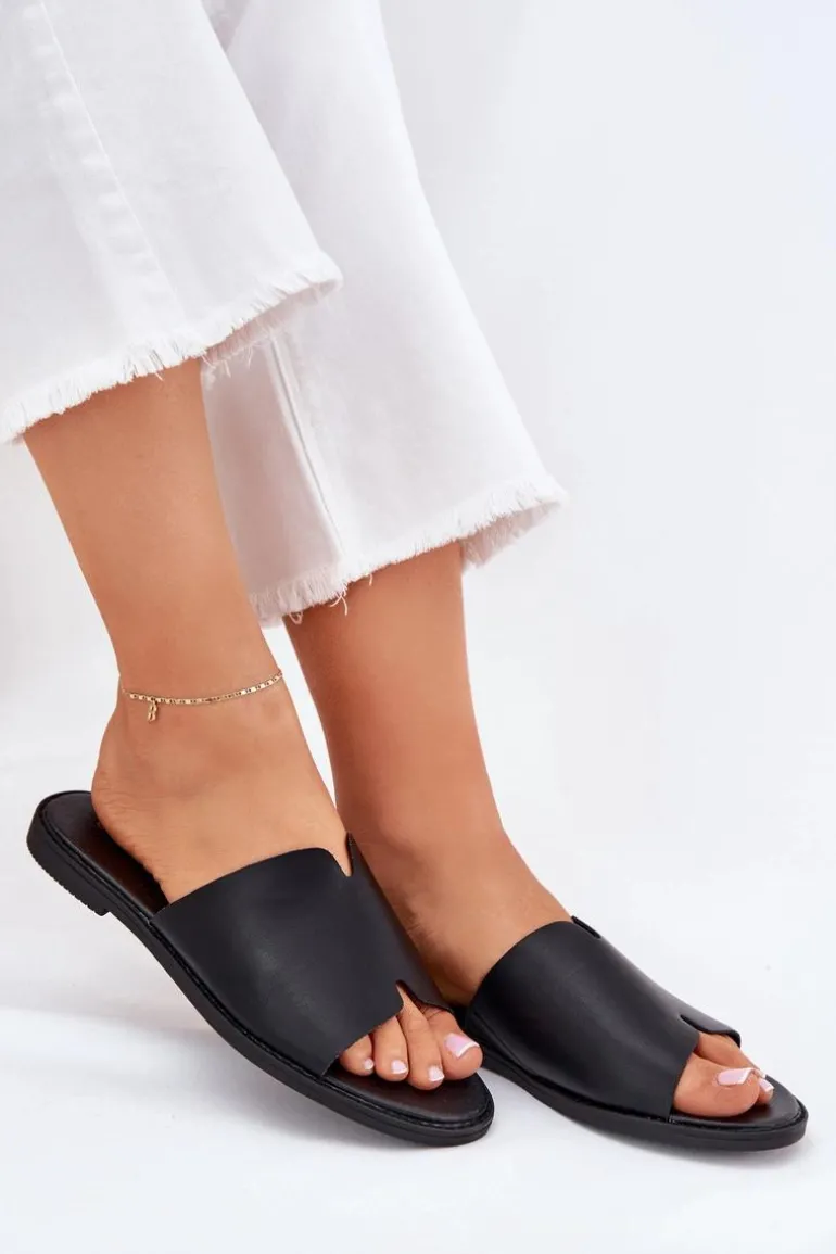 Klapki damskie z eko skóry na płaskim obcasie to klasyczna i elegancka opcja na ciepłe dni. Dzięki prostemu fasonowi łączą wygodę z uniwersalnym stylem, pasując do wielu letnich stylizacji. Idealne do codziennych wyjść, zapewniają komfort i subtelną elegancję przez cały dzień. Przy wyborze rozmiaru prosimy sugerować się tabelą rozmiarów.
